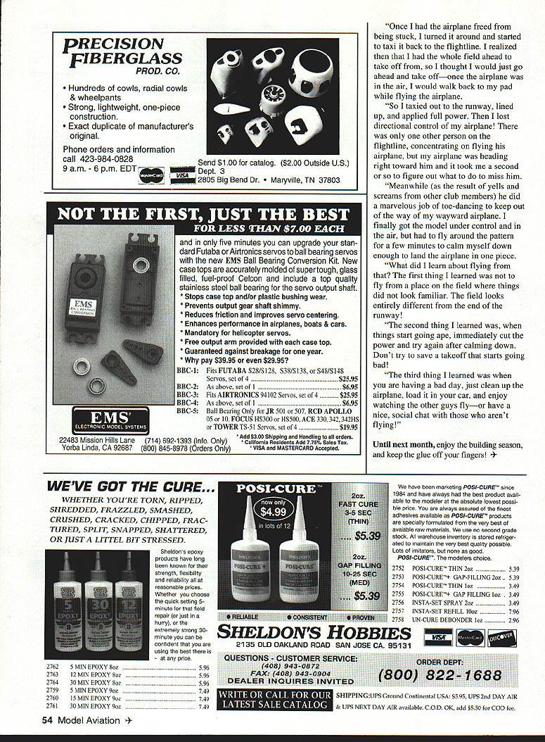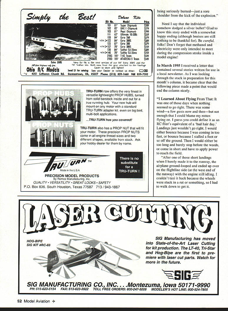 Gary Shaw ii u AS WRITE THIS COLUMN its early November daily temperatures have started drop trees finally starting take autumn-like appearance Florida guess should thank hurricanes Erin Opal leaving few behind cooler air howling wind courtesy passing cold front seems appropriate grab cup coffee head out workshop catch up some projects have unfinished since last winter Normally number-one item list things after active flying season thorough safety check flight box say normally because gone much really didnt have flying season contemplating just thorough check should Im naturally lazy copy Transmitter arrived Belleville RC Flyers Mascoutah Illinois contained thorough checklist written modeler Ray Telican Since Ray covered subject rather nicely Ive included list 12-Volt Starting Battery Does have loose frayed wires Does positive terminal have insulator over wouldnt first time someone shorted battery out started fire disastrous results Are terminals clean free corrosion carry transmitter same box battery aware subjects transmitter same corrosion could make some interesting flights next spring carry 12-volt battery same box fuel can other end box small spark near fuel can warm weather could cause rather unpleasant explosion Starter Are its wires free kinks frays Are alligator clips banana plugs securely attached Does switch starter stick position Maybe would good time have repaired rubber prop/spinner adapter flies out starter engaged consider replacing Electric Fuel Pump Does have good connections Does leak replace repair Remember fuel leaks could start afire Power Panel Check out electrical connections Make sure theyre clean secure Some panels use dropping resistor 15-volt glow-plug voltage resistor gets very hot needs ventilation yours getting enough air Columnists noteIf electrical connections back power panel werent sealed manufacturer use hot glue gun coat bare wires terminals takes touch loose wrench back exposed panel spark afire explosion Glow Plug Battery Leads Are connections both ends good tight use alligator clips make wire shorter other clips cant touch headlock-type connector use plastic cap provided manufacturer its use nothing can short out Transmitter dont fly during winter charge batteries least once month would also excellent time run capacity check Transmitter Antenna straight free broken sections clean Columnists noteTry little WD-40 Spray rag extend antenna wipe down Does have proper frequency numbers tags attached Also have proper frequency markers use frequency control board would excellent time make Props Check nicks cracks dinged ends proper balance Maybe left box should disposed of nylon-fiberglass types should have sharp edges sanded off experienced club members have eleven stitches put fingertip few years ago slipped up backside fiberglass prop Started Its Own Such story passed modeler Jim Halls Johnston Vermont revealed Saito FA-13OTD engine onboard glow ignition system starts being actively flipped flying field past September Jim helper finished priming Saito according manufacturers specifications require flooding cylinder attached glow drivers two four plugs engine Jims helper holding -scale Cub tail Jim distracted few seconds surprise engine suddenly started its own Thankfully Jims helper holding tail engine idle no body parts located near prop Jim attributes start hydraulic lock may have occurred during priming well onboard glow system lights up under compression Food thought think its safe start big bird yourself next time youre field remember Jims experience always have someone hold airplane and/or make sure its tightly secured pole before proceeding similar note past Ive received correspondence indicated small engines have similar faults theyre loaded up aerosol after-run oils Apparently propellants used some spray cans have tendency ignite under compression sometimes results blubbery run few seconds could enough damage unsuspecting hands careful next time flip over engineyou never can tell Near Miss hallowed pages Cascade Model Helicopter Clubs newsletter Helinews comes story Bill Vosburgh Bill describes hot affair between battery fuel can learn about what transporting fuel electric equipment back forth flight line read following end flying day RC aviator loading vehicle flying gear Two other club members performing similar chores finished first departed leaving man complete final duties consisted picking up battery box fuel can folding chair flier picked up battery box hand metal fuel can other Anxious avoid trip decided carry battery box fuel can hand chair other No sooner transferred hardware exposed battery terminals shorted against canit immediately exploded blowing top off can Fortunately top separated first side away victim directed blast away hand arm body can fell ground tipped over ignited grass grass fire easily extinguished flier very fortunate have avoided March 1996 51 ciit4 t4 &atf dau Z4 811 MoModel Price 101 81 Super Chipmunk$289 102 82 DHC-1 Chipmunk$279 103 81 Pepsi Chipmunk$299 111 62 Ultimate I0-300s$359 120 84 Extra 260$379 NEW184Extra 3005$389 12587Extra 300$379 NEW12770Extra 3005$259 13084Sukhoi SU-26ma$389 tW14070Sukhio SU-26mx$259 21061011-66 Texan$549 _____________ 2100101AT-6D\SNJ-5 Texan$549 New 9h next version 84 Entr 30tS 7fl Siikhoi kits Roth now have geur attached fuseLage Easier store arid lighterl Send SI far catalog See Deciier COitoct us direct antown Oh 45327 Phoute 513 559-1660 FAX 859-7202 TRU-TURN now offers very finest versatile lightweight PROP HUBS turned solid barstock inside out true running hub new hub will mount motor standard TRU-TURN adapter kit big bird multi-bolt applications TRU-TURN has covered TRU-TURN also has PROP NUT will fit motor precision PROP NUTS come engine thread sizes two different shapes available stock Ask hobby dealer name U UP~TM iMude La S PRECISION MODEL PRODUCTS Romco Manufacturing Inc QUALITY- VERSATILITY GREAT LOOKS SAFETY PO Box 836 South Houston Texas 77587 713 / 943-1867 being 