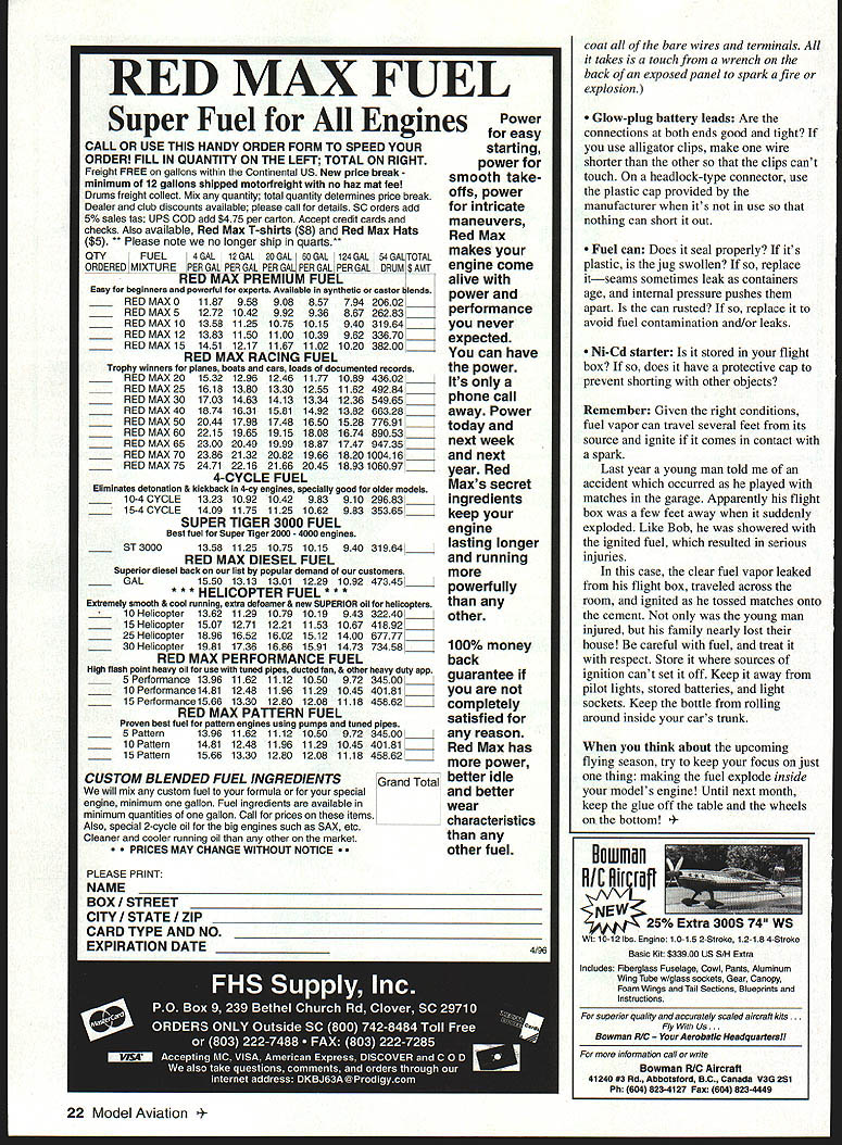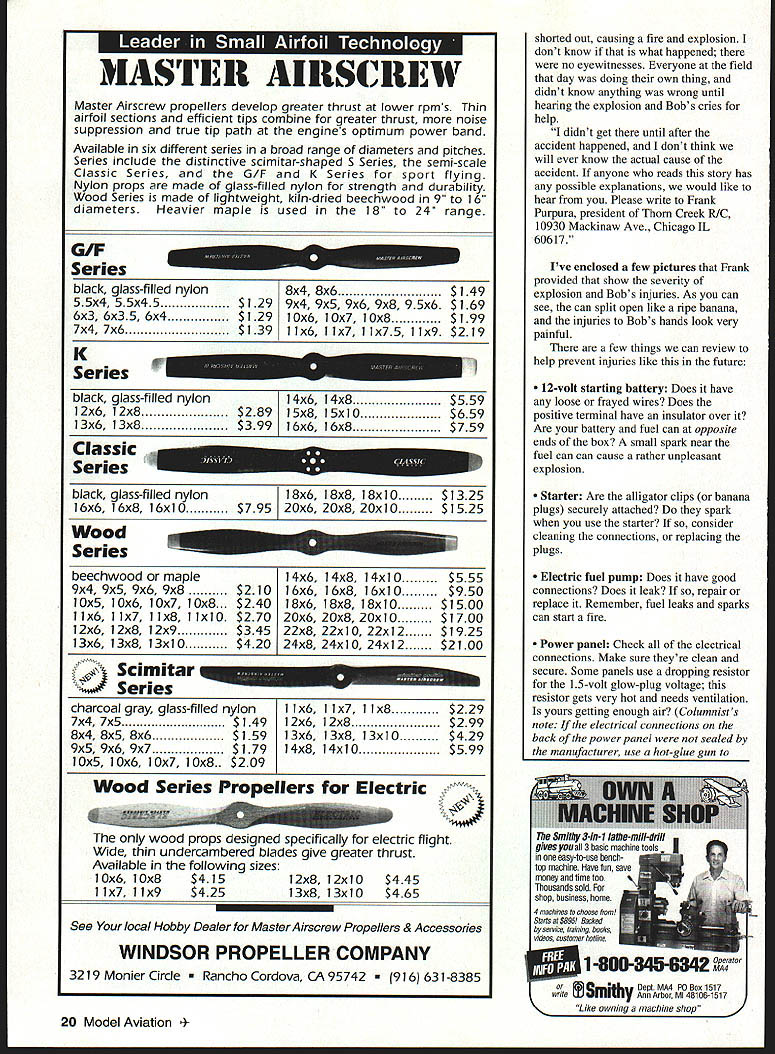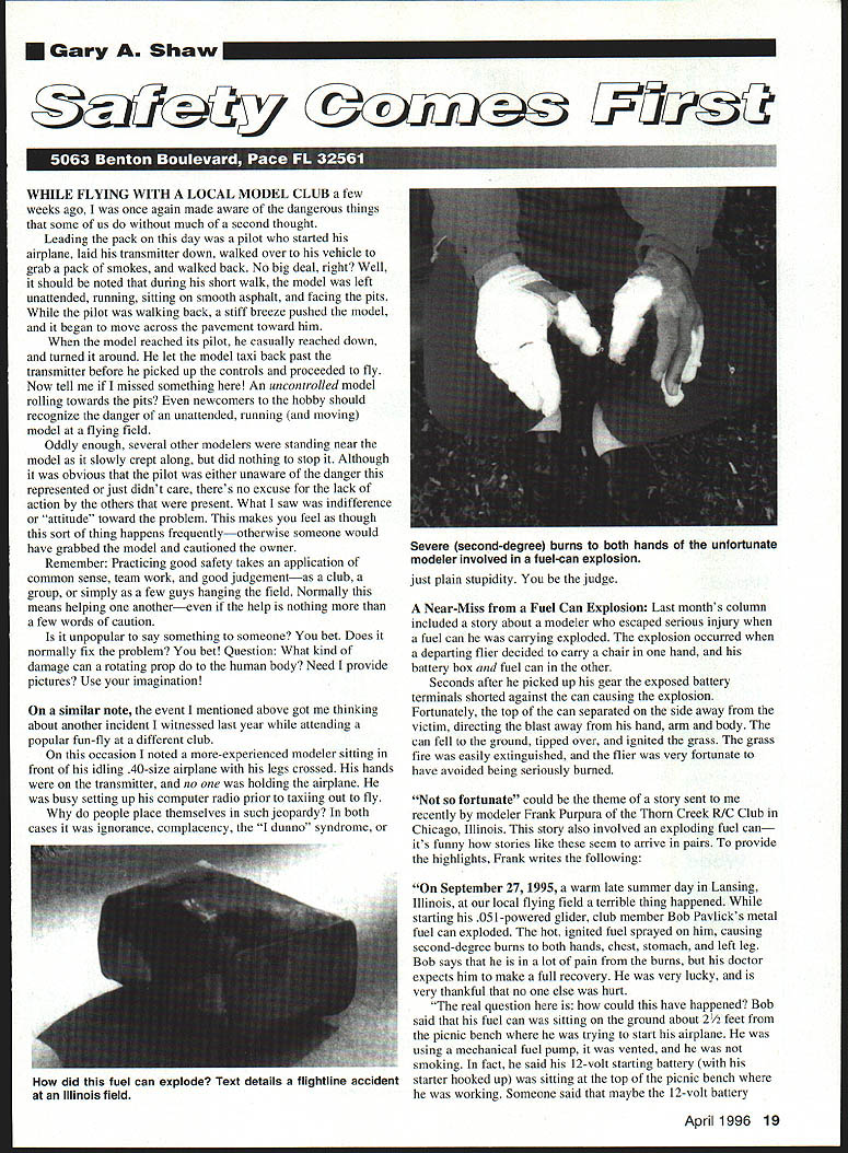 U Gary Shaw WHILE FLYING WITH LOCAL MODEL CLUB few weeks ago once again made aware dangerous things some us much second thought Leading pack day pilot started airplane laid transmitter down walked over vehicle grab pack smokes walked back No big deal right Well should noted during short walk model left unattended running sitting smooth asphalt facing pits pilot walking back stiff breeze pushed model began move across pavement toward him model reached its pilot casually reached down turned around let model taxi back past transmitter before picked up controls proceeded fly Now tell missed something An uncontrolled model rolling towards pits newcomers hobby should recognize danger unattended running moving model flying field Oddly enough several other modelers standing near model slowly crept along did nothing stop Although obvious pilot either unaware danger represented just didnt care theres no excuse lack action others present What saw indifference attitude toward problem makes feel though sort thing happens frequentlyotherwise someone would have grabbed model cautioned owner Remember Practicing good safety takes application common sense team work good judgementas club group simply few guys hanging field Normally means helping anothereven help nothing few words caution unpopular say something someone bet Does normally fix problem bet Question What kind damage can rotating prop human body Need provide pictures Use imagination similar note event mentioned above got thinking about another incident witnessed last year attending popular fun-fly different club occasion noted more-experienced modeler sitting front idling 40-size airplane legs crossed hands transmitter no holding airplane busy setting up computer radio prior taxiing out fly people place themselves such jeopardy both cases ignorance complacency dunno syndrome just plain stupidity judge Near-Miss Fuel Can Explosion Last months column included story about modeler escaped serious injury fuel can carrying exploded explosion occurred departing flier decided carry chair hand battery box fuel can other Seconds after picked up gear exposed battery terminals shorted against can causing explosion Fortunately top can separated side away victim directing blast away hand arm body can fell ground tipped over ignited grass grass fire easily extinguished flier very fortunate have avoided being seriously burned fortunate could theme story sent recently modeler Frank Purpura Thorn Creek R/C Club Chicago Illinois story also involved exploding fuel can its funny stories like seem arrive pairs provide highlights Frank writes following September 27 1995 warm late summer day Lansing Illinois local flying field terrible thing happened starting 051-powered glider club member Bob Pavlick s metal fuel can exploded hot ignited fuel sprayed him causing second-degree burns both hands chest stomach left leg Bob says lot pain burns doctor expects him make full recovery very lucky very thankful no else hurt real question could have happened Bob said fuel can sitting ground about 21/2 feet picnic bench trying start airplane using mechanical fuel pump vented smoking fact said 12-volt starting battery starter hooked up sitting top picnic bench working Someone said maybe 12-volt battery April 1996 19 Severe second-degree burns both hands unfortunate modeler involved fuel-can explosion did fuel can explode Text details flightline accident Illinois field i 14 mum i ii II W1 IllS] [S4 11116] lOIS L MASTE 11 Al uSC REW Master Airscrew propellers develop greater thrust lower rpms Thin airfoil sections efficient tips combine greater thrust noise suppression true tip path engines optimum power band Available six different series broad range diameters pitches Series include distinctive scimitar-shaped S Series semi-scale Classic Series G/F K Series sport flying Nylon props made glass-filled nylon strength durability Wood Series made lightweight kiln-dried beechwood 9 1 6 diameters Heavier maple used 18 24 range Series m black glass-filled nylon8x4 8x6$1 49 55x4 55x45$1299x4 9x5 9x6 9x8 95x6$169 6x3 6x35 6x4$12910x6 10x7 10x8$199 7x4 7x6$13911x6 11x7 11x75 11x9$219 K Series r black glass-filled nylon14x6 14x8$559 12x6 12x8$28915x8 15x10$659 13x6 13x8$39916x6 16x8$759 Classic Series black glass-filled nylon1 8x6 1 8x8 8x1 0$1325 16x6 16x8 16x10$79520x620x820x10$1525 Wood mis Series beechwood maple14x6 14x8 14x10$555 9x4 9x5 9x6 9x8$21016x6 16x8 16x10$950 10x5 10x6 10x7 10x8$24018x6 18x8 18x10$1500 l1x6 11x7 11x8 llxlO$27020x620x820x10$1700 12x6 12x8 l2x9$34522x8 22x10 22x12$1925 13x6 13x8 13x10$42024x8 24x10 24x12$2100 O Series charcoal gray glass-fillednylonI 1x6 1x7 1 1x8$229 7x47x5$14912x6 12x8$299 8x48x58x6$15913x6 13x8 13x10$429 9x59x69x7$17914x8 14x10$599 lOxS 10x6 10x7 10x8$209 Wood Series Propellers Electric wood props designed specifically electric flight Wide thin undercambered blades give greater thrust Available following sizes 10x610x8$41512x8 12x10$445 11x711x9$42513x8 13x10$465 See local Hobby Dealer Master Airscrew Propellers & Accessories WINDSOR PROPELLER COMPANY 3219 Monier Circle ho Cordova CA 95742 631-8385 shorted out causing fire explosion dont know what happened no eyewitnesses Everyone field day doing own thing didnt know anything wrong until hearing explosion Bobs cries help didnt get until after accident happened dont think will ever know actual cause accident anyone reads story has possible explanations would like hear Please write Frank Purpura president Thorn Creek R/C 10930 Mackinaw Ave Chicago IL 60617 Ive enclosed few pictures Frank provided show severity explosion Bobs injuries As can see can split open like ripe banana injuries Bobs hands look very painful few things can review help prevent injuries like future 12-volt starting battery Does have loose frayed wires Does positive terminal have insulator over Are battery fuel can opposite ends box small spark near fuel can can cause rather unpleasant explosion Starter Are alligator clips banana