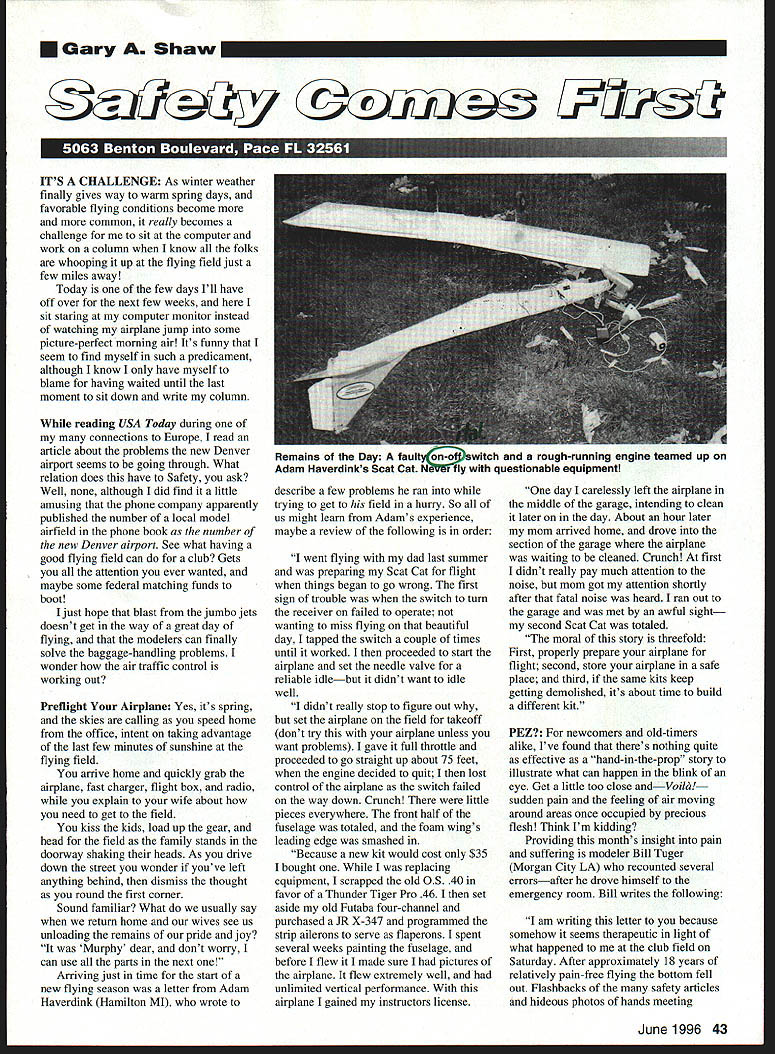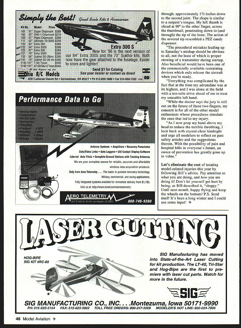 Gary Shaw LW ITS CHALLENGE As winter weather finally gives way warm spring days favorable flying conditions become more common really becomes challenge sit computer work column know folks whooping up flying field just few miles away Today few days Ill have off over next few weeks sit staring computer monitor instead watching airplane jump some picture-perfect morning air Its funny seem find myself such predicament although know have myself blame having waited until last moment sit down write column reading USA Today during connections Europe read article about problems new Denver airport seems going through What relation does have Safety ask Well although did find little amusing phone company apparently published number local model airfield phone book number new Denver airport See what having good flying field can club Gets attention ever wanted maybe some federal matching funds boot just hope blast jumbo jets doesnt get way great day flying modelers can finally solve baggage-handling problems wonder air traffic control working out Preflight Airplane Yes its spring skies calling speed home office intent taking advantage last few minutes sunshine flying field arrive home quickly grab airplane fast charger flight box radio explain wife about need get field kiss kids load up gear head field family stands doorway shaking heads As drive down street wonder youve left anything behind dismiss thought round first corner Sound familiar What usually say return home wives see us unloading remains pride joy Murphy dear dont worry can use parts next Arriving just time start new flying season letter Adam Haverdink Hamilton MI wrote describe few problems ran trying get field hurry So us might learn Adams experience maybe review following order went flying dad last summer preparing Scat Cat flight things began go wrong first sign trouble switch turn receiver failed operate wanting miss flying beautiful day tapped switch couple times until worked proceeded start airplane set needle valve reliable idlebut didnt want idle well didnt really stop figure out set airplane field takeoff dont try airplane unless want problems gave full throttle proceeded go straight up about 75 feet engine decided quit lost control airplane switch failed way down Crunch little pieces everywhere front half fuselage totaled foam wings leading edge smashed Because new kit would cost $35 bought replacing equipment scrapped old OS 40 favor Thunder Tiger Pro 46 set aside old Futaba four-channel purchased JR X-347 programmed strip ailerons serve flaperons spent several weeks painting fuselage before flew made sure pictures airplane flew extremely well unlimited vertical performance airplane gained instructors license day carelessly left airplane middle garage intending clean later day About hour later mom arrived home drove section garage airplane waiting cleaned Crunch first didnt really pay much attention noise mom got attention shortly after fatal noise heard ran out garage met awful sight second Scat Cat totaled moral story threefold First properly prepare airplane flight second store airplane safe place third same kits keep getting demolished its about time build different kit PEZ newcomers old-timers alike Ive found theres nothing quite effective hand-in-the-prop story illustrate what can happen blink eye Get little too close andVoili sudden pain feeling air moving around areas once occupied precious flesh Think Im kidding Providing months insight pain suffering modeler Bill Tuger Morgan City LA recounted several errorsafter drove himself emergency room Bill writes following am writing letter because somehow seems therapeutic light what happened club field Saturday After approximately 18 years relatively pain-free flying bottom fell out Flashbacks safety articles hideous photos hands meeting June1996 43 witch rough-running engine teamed up questionable equipment PLANEMATE WELDED STEEL CONSTRUCTION DURABLE ACRYLIC ENAMEL FINISH LIFE-TIME WARRANTY LIGHT-WEIGHT BUILT ROCK SOLID NO ASSEMBLY REQUIRED EASY TO SET UP QUALITY CRAFTSMANSHIP SOLID WOOD OAK FINISH URETHANE CLEARCOAT WORK TOP MADE IN THE USA PATENT PENDING FUSION WELDING INC 9916 COCHITI SE STE E ALBUQUERQUE NM 87123-3318 505 7594 ALLOW 4-6 WEEKS DELI VERY NO C OD ORDERS rotating propellers repeated minds eye sat emergency ward local hospital reminded myself never really taken safety procedures lightly yet instant time deal two severe cuts left hand However looking back yesterdays incident evident must least reconsider procedures should help eliminate repeat physical mental anguish could resist mostly perfect South Louisiana aulumn day feeling shared other club members would meeting club field Arriving first quickly assembled five-year-old pride joy P-5 1 Mustang Eager start engine make carburetor adjustments engine performance would match perfect flying day quickly got Ihe Mustang airborne As case last flying session 40-sized engine good lop end would die final approach idling third such adjustment pits starting procedure got sloppy Instead putting transmitter boxs designed holder simply leaned against box Taking glow battery electric starter engine came life effortlessly idling low smooth Returning battery starter box transmitter fell over its face advancing left stick full throttle engine quickly obliged reaction instantaneous though vain screaming engine sliced through left hand Seeing portions both blades departing aircraft knew hospital bound Im still amazed patterns cuts severity blink-of-an eye accident left index finger cut straight down middle nail clear 44 Model Aviation /Video Links Loggers Cockpit Display Software External Auto Pilots lete Groood Stations Tracking Auteonas complete source reliable accurate affordable through approximately 11/2 inches down second joint shape similar serpents tongue left thumb sliced 900 other finger across thumbnail penetrating down through tip bone action severed tip resembled PEZ candy dispenser procedural mistakes leading up Sa