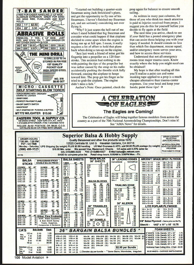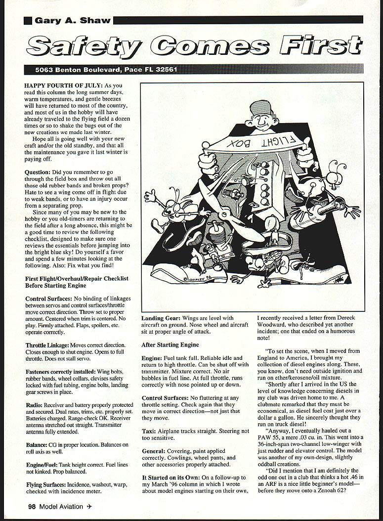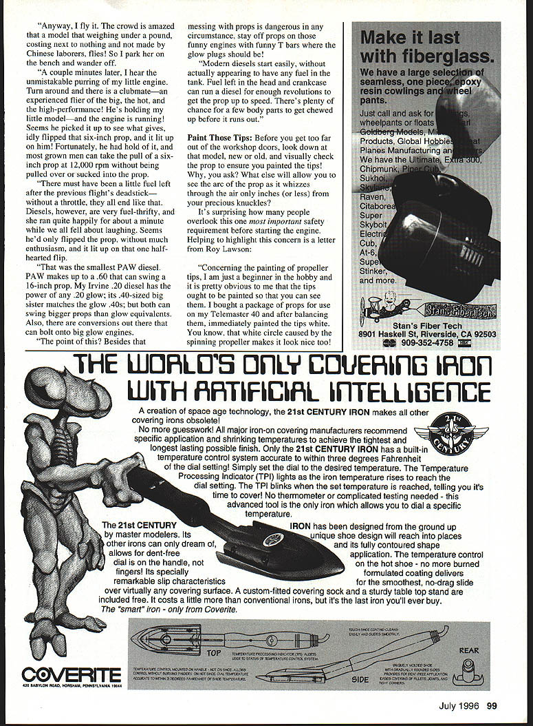 U Gary Shaw HAPPY FOURTH OF JULY As read column long summer days warm temperatures gentle breezes will have returned country us hobby will have already traveled flying field dozen times shake bugs out new creations made last winter Hope going well new craft and/or old standby maintenance gave last winter paying off Question Did remember go through field box throw out old rubber bands broken props Hate see wing come off flight due weak bands have injury occur separating prop Since may new hobby old-timers returning field after long absence might good time review following checklist designed make sure reviews essentials before jumping bright blue sky yourself favor spend few minutes looking following Also Fix what find First Flight/Overhaul/Repair Checklist Before Starting Engine Control Surfaces No binding linkages between servos control surfaces/throttle move correct direction Throw set proper amount Centered trim centered No play Firmly attached Flaps spoilers etc operate correctly Throttle Linkage Moves correct direction Closes enough shut engine Opens full throttle Does stall servo Fasteners correctly installed Wing bolts rubber bands wheel collars devises safety locked fuel tubing engine bolts landing gear screws place Radio Receiver battery properly protected secured Dual rates trims etc properly set Batteries charged Range-check OK Receiver antenna stretched out straight Transmitter antenna fully extended Balance CG proper location Balances roll axis well Engine/Fuel Tank height correct Fuel lines kinked Prop balanced Hying Surfaces Incidence washout warp checked incidence meter Landing Gear Wings level aircraft ground Nose wheel aircraft sit proper angle attack After Starting Engine Engine Fuel tank full Reliable idle return high throttle Can shut off transmitter Mixture correct No air bubbles fuel line full throttle runs correctly nose pointed up down Control Surfaces No fluttering throttle setting Check again move correct directionnot just move Taxi Airplane tracks straight Steering too sensitive General Covering paint applied correctly Cowlings wheel pants other accessories properly attached Started its Own follow-up March 96 column wrote about model engines starting own recently received letter Dereck Woodward described yet another incident ended humorous note set scene moved England America brought collection diesel engines along know dont need outside ignition run ether/kerosene/oil mixture Shortly after arrived US level knowledge concerning diesels club driven home clubmate remarked must economical diesel fuel cost just over dollar gallon sincerely thought run truck diesel Anyway eventually hauled out PAW 55 mere 03 cu went 36-inch-span two-channel low-winger just rudder elevator control model another own-design slightly oddball creations Did mention am definitely odd out club thinks hot 46 ARF nice little beginners model before move onto Zenoah 62 98 Model Aviation ay fly crowd amazed model weighing under pound costing next nothing made Chinese laborers flies So park bench wander off couple minutes later hear unmistakable puffing little engine Turn around clubmatean experienced flier big hot high-performance Hes holding little modeland engine running Seems picked up see what gives idly flipped six-inch prop lit up him Fortunately hold grown men can take pull sixinch prop 12000 rpm being pulled over sucked prop must have little fuel left after previous flights deadstick throttle end like Diesels however very fuel-thrifty ran quite happily about minute fell about laughing Seems hed flipped prop much enthusiasm lit up half hearted flip smallest PAW diesel PAW makes up 60 can swing 16-inch prop Irvine 20 diesel has power 20 glow its 40-sized big sister matches glow 40s both can swing bigger props glow equivalents Also conversions out can bolt onto big glow engines point Besides messing props dangerous circumstance stay off props funny engines funny T bars glow plugs should Modern diesels start easily actually appearing have fuel tank Fuel left head crankcase can run diesel enough revolutions get prop up speed Theres plenty chance few body parts get chewed up before runs out Paint Tips Before get too far out workshop doors look down model new old visually check prop ensure painted tips ask What else will allow see arc prop whizzes through air inches less precious knuckles Its surprising people overlook important safety requirement before starting engine Helping highlight concern letter Roy Lawson Concerning painting propeller tips am just beginner hobby pretty obvious tips ought painted can see bought package props use Telemaster 40 after balancing immediately painted tips white know white circle caused spinning propeller makes look nice too 21st CENTURYh designed ground up master modelers Itsue shoe design will reach places other irons can dream its fully contoured shape allows dent-freeapplication temperature control dial handle hot shoe no burned fingers Its specially ulated coating delivers remarkable slip characteristics smoothest no-drag slide over virtually covering surface custom-fitted covering sock sturdy table top stand included free costs little conventional irons its last iron youll ever buy smart iron Coverite July1996 99 HE WEJFLITS OFiLY EOUEFiIFiO IFiOFi WITH FiFiTIFIDiL IF1TELLIOEF1CE creation space age technology 21st CENTURY IRON makes other covering irons obsolete No guesswork major iron-on covering manufacturers recommend specific application shrinking temperatures achieve tightest longest lasting possible finish Only 21st CENTURY IRON has built-in temperature control system accurate within three degrees Fahrenheit dial setting Simply set dial desired temperature Temperature Processing Indicator TPI lights iron temperature rises reach dial setting TPI blinks set temperature reached telling its time cover No thermometer complicated testing needed advanced tool iron allows dial specific temperature TE IO44 Co IJ3 A- S S XC 5500 KXXXXX 41XXXX _ 9 M - 4D aI 2 