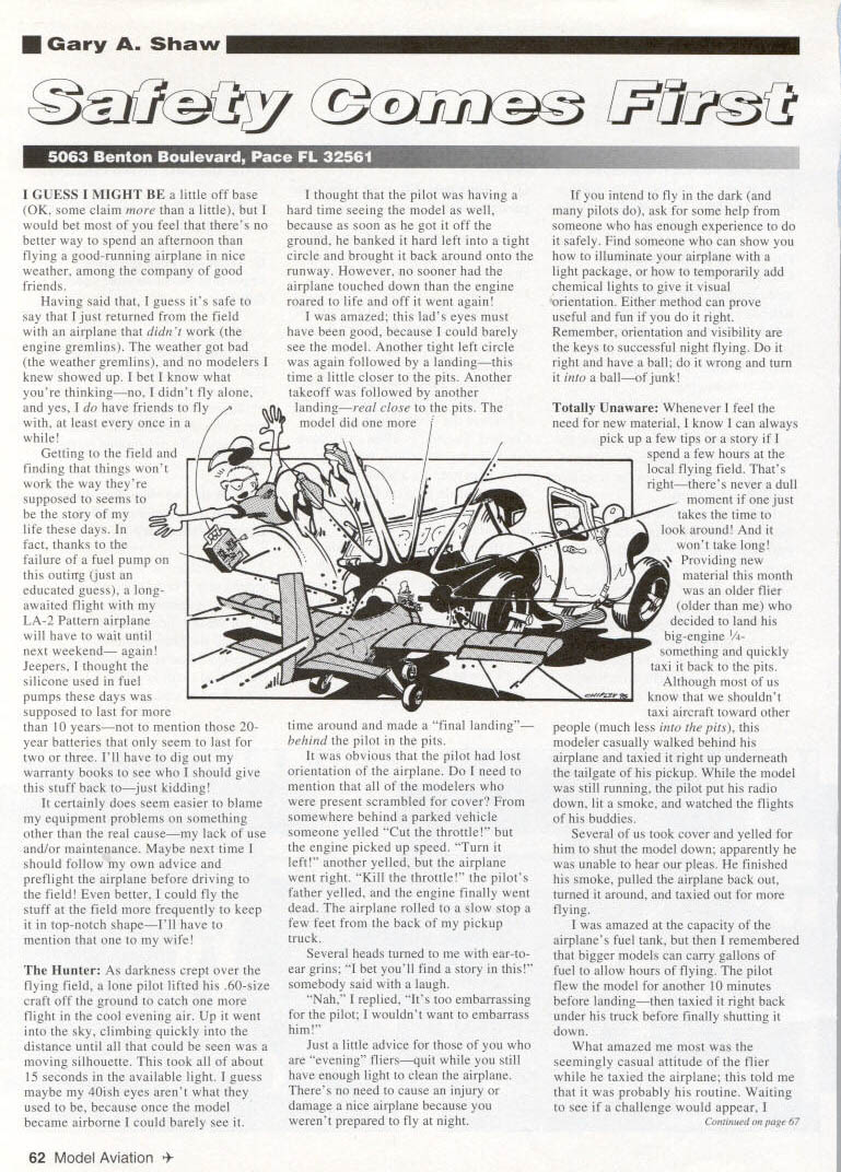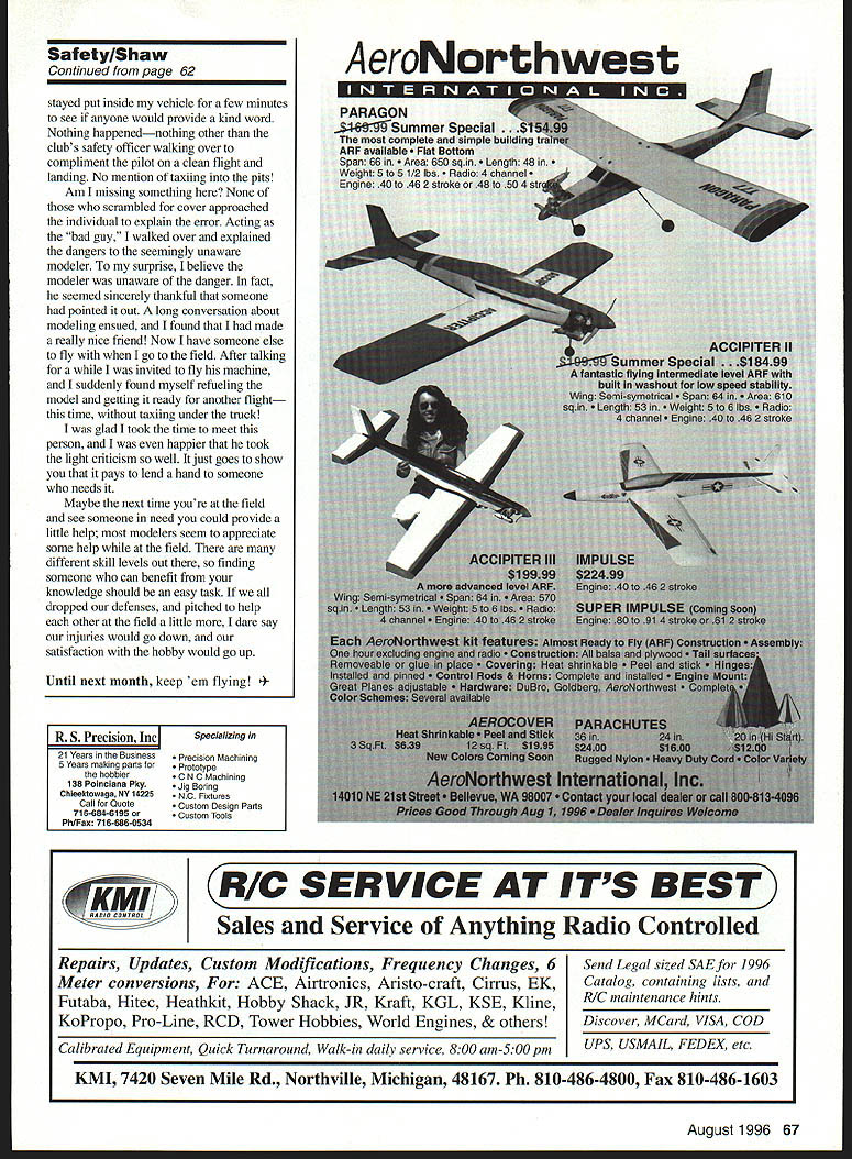 Gary Shaw GUESS MIGHT BE little off base OK some claim little would bet feel theres no better way spend afternoon flying good-running airplane nice weather among company good friends Having said guess its safe say just returned field airplane didnt work engine gremlins weather got bad weather gremlins no modelers knew showed up bet know what youre thinkingno didnt fly alone thought pilot having hard time seeing model well because soon got off ground banked hard left tight circle brought back around onto runway However no sooner airplane touched down engine roared life off went again amazed lads eyes must have good because could barely see model Another tight left circle again followed landingthis time little closer pits Another takeoff followed another yes have friends fly landingreal close pits least once model did Getting field finding things wont work way theyre [ supposed seems story life days fact thanks failure fuel pump outirrg just educated guess longawaited flight LA-2 Pattern airplane will have wait until next weekend again Jeepers thought silicone used fuel pumps days supposed last 10 yearsnot mention 20year batteries seem last two three Ill have dig out warranty books see should give stuff back tojust kidding certainly does seem easier blame equipment problems something other real causemy lack use and/or mainteflance Maybe next time should follow own advice preflight airplane before driving field better could fly stuff field frequently keep top-notch shapeIll have mention wife Hunter As darkness crept over flying field lone pilot lifted 60-size craft off ground catch flight cool evening air Up went sky climbing quickly distance until could seen moving silhouette took about 15 seconds available light guess maybe 40ish eyes arent what used because once model became airborne could barely see time around made final landing behind pilot pits obvious pilot lost orientation airplane need mention modelers present scrambled cover somewhere behind parked vehicle someone yelled Cut throttle engine picked up speed Turn left another yelled airplane went right Kill throttle pilots father yelled engine finally went dead airplane rolled slow stop few feet back pickup truck Several heads turned ear-toear grins bet youll find story somebody said laugh Nah replied Its too embarrassing pilot wouldnt want embarrass him Just little advice evening fliersquit still have enough light clean airplane Theres no need cause injury damage nice airplane because werent prepared fly night intend fly dark pilots ask some help someone has enough experience safely Find someone can show illuminate airplane light package temporarily add chemical lights give visual orientation Either method can prove useful fun right Remember orientation visibility keys successful night flying right have ball wrong turn ballof junk Totally Unaware Whenever feel need new material know can always pick up few tips story spend few hours local flying field Thats righttheres never dull moment just takes time look around wont take long Providing new material month older flier older decided land big-engine something quickly taxi back pits Although us know shouldnt taxi aircraft toward other people much less pits modeler casually walked behind airplane taxied right up underneath tailgate pickup model still running pilot put radio down lit smoke watched flights buddies Several us took cover yelled him shut model down apparently unable hear pleas finished smoke pulled airplane back out turned around taxied out flying amazed capacity airplanes fuel tank remembered bigger models can carry gallons fuel allow hours flying pilot flew model another 10 minutes before landingthen taxied right back under truck before finally shutting down What amazed seemingly casual attitude flier taxied airplane told probably routine Waiting see challenge would appear Continued page 67 62 Model Aviation fetylShaw Continued page 62 stayed put inside vehicle few minutes see anyone would provide kind word Nothing happenednothing other clubs safety officer walking over compliment pilot clean flight landing No mention taxiing pits Am missing something None scrambled cover approached individual explain error Acting bad guy walked over explained dangers seemingly unaware modeler surprise believe modeler unaware danger fact seemed sincerely thankful someone pointed out long conversation about modeling ensued found made really nice friend Now have someone else fly go field After talking invited fly machine suddenly found myself refueling model getting ready another flight time taxiing under truck glad took time meet person happier took light criticism well just goes show pays lend hand someone needs Maybe next time youre field see someone need could provide little help modelers seem appreciate some help field different skill levels out finding someone can benefit knowledge should easy task dropped defenses pitched help other field little dare say injuries would go down satisfaction hobby would go up Until next month keep em flying c SERVICE AT ITS BEST Sales Service Anything Radio Controlled Repairs Updates Custom Modifications Frequency Changes 6 Meter conversions ACE Airtronics Aristo-craft Cirrus EK Futaba Hitec Heathkit Hobby Shack JR Kraft KGL KSE Kline KoPropo Pro-Line RCD Tower Hobbies World Engines & others Calibrated Equipment Quick Turnaround Walk-in daily service 800 am-5OO pm Send Legal sized SAE 1996 Catalog containing lists RIC maintenance hints Discover MCard VISA COD UPS USMA IL FED EX etc August1996 67 eroNorthwest R S Precision Inc SPecializing Ifl 21 Years Business Precision Machining 5 Years making parts Prototype hobbier C N C Machining 138 Poinciana Pky Jig Boring Chieektowaga NY 14225 NC Fixtures Gall Quote Custom Design Parts 716-684-6195 Custom Tools Ph/Fax 716-686-0534 KMI 7420 Seven Mile Rd Northville Michigan 48167 Ph 810-486-4800 Fax 810-486-1603