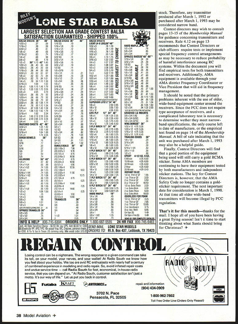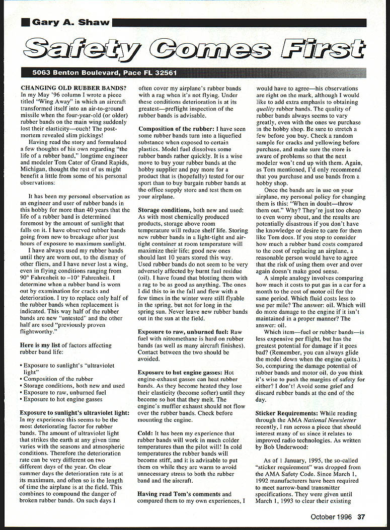 Gary Shaw CHANGING OLD RUBBER BANDS May 96 column wrote piece titled Wing Away aircraft transformed itself air-to-ground missile four-year-old older rubber bands main wing suddenly lost elasticityouch post mortem revealed slim pickings Having read story formulated few thoughts own regarding life rubber band longtime engineer modeler Tom Cater Grand Rapids Michigan thought rest us might benefit little some personal observations has personal observation engineer user rubber bands hobby 40 years life rubber band determined foremost amount sunlight falls have observed rubber bands going new breakage after just hours exposure maximum sunlight have always used rubber bands until worn out dismay other fliers have never lost wing flying conditions ranging 900 Fahrenheit l0O Fahrenheit determine rubber band worn out examination cracks deterioration try replace half rubber bands replacement indicated way half rubber bands new untested other half used previously proven flightworthy list factors affecting rubber band life Exposure sunlights ultraviolet light Composition rubber Storage conditions both new used Exposure raw unburned fuel Exposure hot engine gasses Exposure sunlights ultraviolet light experience seems deteriorating factor rubber bands amount ultraviolet light strikes earth given time varies seasons atmospheric conditions Therefore deterioration rate can very different two different days year clear summer days deterioration rate its maximum often length time airplane field combines compound danger broken rubber bands such days often cover airplanes rubber bands rag its flying Under conditions deterioration its greatestpreflight inspection rubber bands advisable Composition rubber have seen some rubber bands turn liquefied substance exposed certain plastics Model fuel dissolves some rubber bands rather quickly wise move buy rubber bands hobby supplier pay product hopefully tested sport buy bargain rubber bands office supply store test airplane Storage conditions both new used As chemically produced products storage above room temperature will reduce shelf life Storing new rubber bands light-tight air tight container room temperature will maximize life good new ones should last 10 years stored way Used rubber bands seem very adversely affected burnt fuel residue oil have found blotting rag good anything ones did fall flew few times winter still flyable spring long spring sun Never leave new rubber bands out sun field Exposure raw unburned fuel Raw fuel nitromethane hard rubber bands well aircraft finishes Contact between two should avoided Exposure hot engine gasses Hot engine-exhaust gasses can heat rubber bands As become heated lose elasticity become softer until become hot melt engines muffler exhaust should flow over rubber bands Check before mounting engine Cold has experience rubber bands will work much colder temperatures pilot will cold temperatures rubber bands will become stiff advisable put warm avoid unnecessary stress both rubber band aircraft Having read Toms comments compared own experiences would have agreehis observations right mark although would like add extra emphasis obtaining quality rubber bands quality rubber bands always seems vary greatly ones purchase hobby shop sure stretch few before buy Check random sample cracks yellowing before purchase make sure store aware problems next modeler wont end up Again Tom mentioned Id recommend purchase use bands hobby shop Once bands use airplane personal policy changing doubtthrow out Theyre just too cheap worry about results potentially disastrous dont have knowledge desire care like Tom does stop consider much rubber band costs compared cost replacing airplane reasonable person would have agree risk using over over again doesnt make good sense simple analogy involves comparing much costs put gas car month cost motor oil same period Which fluid costs less use per mile answer oil Which will damage engine isnt maintained proper manner answer oil Which itemfuel rubber bandsis less expensive per flight has greatest potential damage goes bad Remember can always glide model down engine quits So comparing damage potential rubber bands motor oil think its wise push margins safety either dont Avoid some grief discard rubber bands end day Sticker Requirements reading through AMA National Newsletter recently ran across piece should interest us since relates improved radio technologies As written Bob Underwood As 1 January 1995 so-called sticker requirement dropped AMA Safety Code Since March 1 1992 manufacturers have required meet narrow-band transmitter specifications given until March 1 1993 clear existing October 1996 37 50 3050 4661 4965 6074 Sisso6090 3/0s286110 1/2523011042143 1/32 x 336 43 50 60 1/20 x 336 43 50 60 1/16 s 336 44 50 60 3/325343 52 61 67 1/85352 63 73 04 3/165362 76 64 101 1/4s376 04113136 5/16x3199152 3/Ox 3105115140170 1/2s3135150175205 3/4x3225310 1/32s456667992 1/20s456607992 1/16s456607992 3/32s46002106114 1/0s47693112134 3/16x467109140150 1/4x4196152162179 5/16x4102234 3/Ox 4165210239265 1/2s4249205315336 3/4x4350471 MATCHED SHEETS 42 48 3/32x4125142 1/0x4150169 3/16s4104109 1/454176205 BIRCH DOWELS36 1/616 3/1617 1/420 5/1627 3/037 1/254 5/674 AILERONS3648 1/4515762 1/4s1-1/46590 1/4x1-1/274105 1/4s200115 5/16s1-1/474105 5/16x1-1/275106 5/16x266120 3/Osl-1/460115 3/6x1-1/263116 3/Ox 295135 1/2x1-1/295140 1/252106150 1/4x275 1/4s3109 3/0x290 3/6x3131 1/253154 ADO FOR SHAPES LEA 0/05 OBOE 2530 SPRUCE TRIANGLES 36 3/6x3/654 1/2o1/275 T/4s5/496 1/lOx 1/2 3/32 SQ 3/32s 1/4 3/3253/0 3/32x1/2 1/8 SQ 1/0x3/16 1/051/4 1/Ox 3/6 1/Ox 1/2 1/653/4 1/651 3/16 SQ 3/165 1/4 3/1653/6 3/lOx 1/2 3/1653/4 3/1651 1/4 SQ 1/453/0 1/451/2 1/453/4 1/45 1 5/16 50 3/6 SQ 3/851/2 3/653/4 3/051 1/2 SQ 1/253/4 1/251 5/6 SQ 3/4 SQ 3/451 BUNDLE DEALS 20 1/16o3 203/32s3 151/6 53 153/1653 101/453 103/653 51/2 53 20 1/165 4 10 1/lOx 4 153/32s4 103/32 54 101/0 54 51/054 103/1654 53/1654 101/454 51/4x4 53/0x4 51/2o4 TRIANGLES 1/4 3/6 1/2 3/4 1