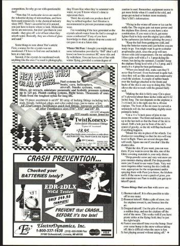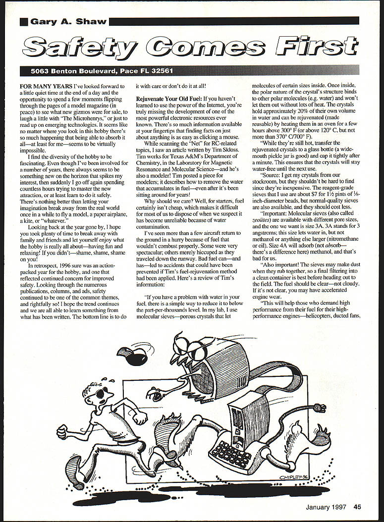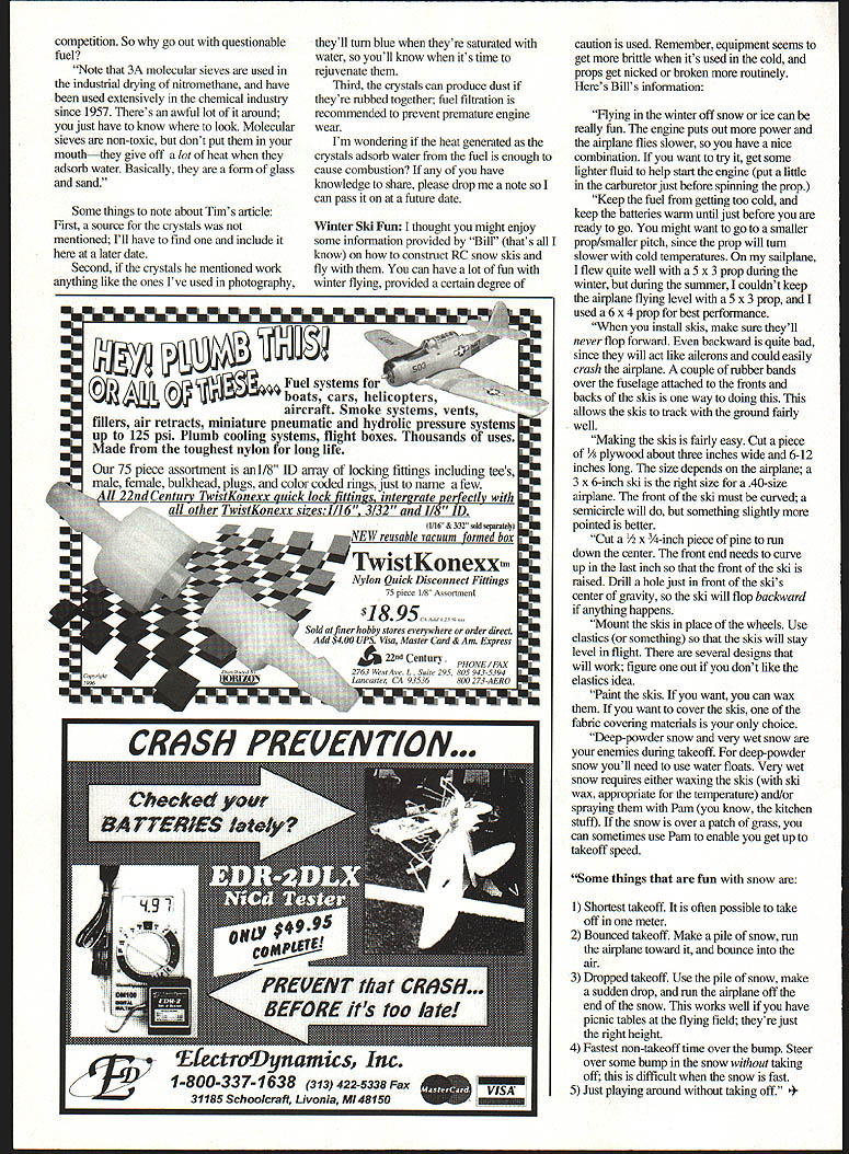 U Gary Shaw -ieT*U I-I ml @lU FOR MANY YEARS Ive looked forward little quiet time end day opportunity spend few moments flipping through pages model magazine peace see what new gizmos sale laugh little Microhenrys just read up emerging technologies seems like no matter look hobby theres much happening being able absorb allat least meseems virtually impossible find diversity hobby fascinating though Ive involved number years always seems something new horizon spikes interest suddenly go off again spending counfless hours irying master new attraction least learn safely Theres nothing better letting imagination break away real world once fly model paper airplane kite whatever Looking back year gone hope took plenty time break away family friends let yourself enjoy what hobby really abouthaving fun relaxing didntshame shame shame retrospect 1996 sure actionpacked year hobby reflected continued concern improved safety Looking through numerous publications columns ads safety continued common themes rightfully hope trend continues able learn something what has written bottom line care dont Rejuvenate Old Fuel havent leamed use power Internet youre truly missing development powerful electronic resources ever known Theres much information available fingertips finding facts just about anything easy clicking mouse scanning Net RC-related topics saw article written Tim Skloss Tim works Texas A&Ms Department Chemistry Laboratory Magnetic Resonance Molecular Scienceand hes also modeler Tim posted piece modelers describes remove water accumulates fueleven after its sitting around years should care Well starters fuel certainly isnt cheap makes difficult us dispose suspect has become unreliable because water contamination Ive seen few aircraft return ground hurry because fuel wouldnt combust properly Some very spectacular others merely hiccuped traveled down runway Bad fuel canand hasled accidents could have prevented Tims fuel-rejuvenation method applied Heres review Tims information have problem water fuel simple way reduce below part-per-thousands level lab use molecular sievesporous crystals let molecules certain sizes inside Once inside polar nature crystals structure binds other polar molecules eg water wont let out lots heat crystals hold approximately 20% own volume water can rejuvenated made reusable heating oven few hours above 3)0 F above 1200 C 3700 C/7000 F theyre still hot transfer rejuvenated crystals glass bottle widemouth pickle jar good cap tightiy after minute ensures crystals will stay water-free until next use Source get crystals stockroom shouldnt hard find since theyre inexpensive reagent-grade sieves use about $7 1 /i pints inch-diameter beads normal-quality sieves also available should cost less Important Molecular sieves also called zeolites available different pore sizes want size 3A 3A stands 3 angstroms size lets water methanol anything else larger nitromethane oil Size 4A will adsorb absorbtheres difference methanol thats bad us Also important sieves may make dust rub together final filtering clean container best before heading out field fuel should clearnot cloudy its clear may have accelerated engine wear will help demand high performance fuel highperformance engineshelicopters ducted fans January1997 45 -a competition So go out questionable fuel Note 3A molecular sieves used industrial diying nitromethane have used extensively chemical industry since 1957 Theres awful lot around just have know look Molecular sieves non-toxic dont put mouththey give off lot heat adsorb water Basically form glass sand Some things note about Tims article First source crystals mentioned Ill have find include later date Second crystals mentioned work anything like ones Ive used photography m theyll turn blue theyre saturated water youll know its time rejuvenate Third crystals can produce dust theyre rubbed together fuel filtration recommended prevent premature engine wear Im wondering heat generated crystals adsorb water fuel enough cause combustion have knowledge share please drop note can pass future date Winter Ski Fun thought might enjoy some information provided Bill thats know construct RC snow skis fly can have lot fun winter flying provided certain degree m Fuel systems boats cars helicopters aircraft Smoke systems vents uses fillers air retracts miniature pneumatic hydrolic pressure systems up 125 psi Plumb cooling systems flight boxes Thousands Made toughest nylon long life 75 piece assortment 1/8 ID array locking fittings including tees male female bulkhead plugs color coded rings just name few 411 22ndCenturv TwistKonexx quick lock fittinrs intergrate perfectly other TwistKonexx sizes1/16 3/32 1/8 ID 1/16 &3t32 soldseparately reusable vacuum formed box UTwistKonexxm Nylon Quick Disconnect Fittings 75 pecc I/S A.ortment 1895 Salt finer hobby stores everywhere order direct Add $400 UPS Visa Master Card & An Express 22nd Century PHONE/FAX tAr L Siw 295 905 943-5394 CA 93536900 273 -A ERO uIwaEh caution used Remember equipment seems get brittle its used cold props get nicked broken routinely Heres Bills information Eying winter off snow ice can really fun engine puts out power airplane flies slower have nice combination want try get some lighter fluid help start engine put little carburetor just before spinning prop Keep fuel getting too cold keep batteries warm until just before ready go might want go smaller prop/smaller pitch since prop will turn slower cold temperatures sailplane flew quite well aS x 3 prop during winter during summer couldnt keep airplane flying level aS x 3 prop used 6 x 4 prop best performance install skis make sure theyll never flop forward backward quite bad since will act like ailerons could easily crash airplane couple rubber bands over fuselage attached fronts backs skis way doing allows skis track ground fairly well Making skis fairly easy Cut piece ood about three inches wide 6-12 inches long size depends airplane 3 x 6-inch ski right size 40-size airplan
