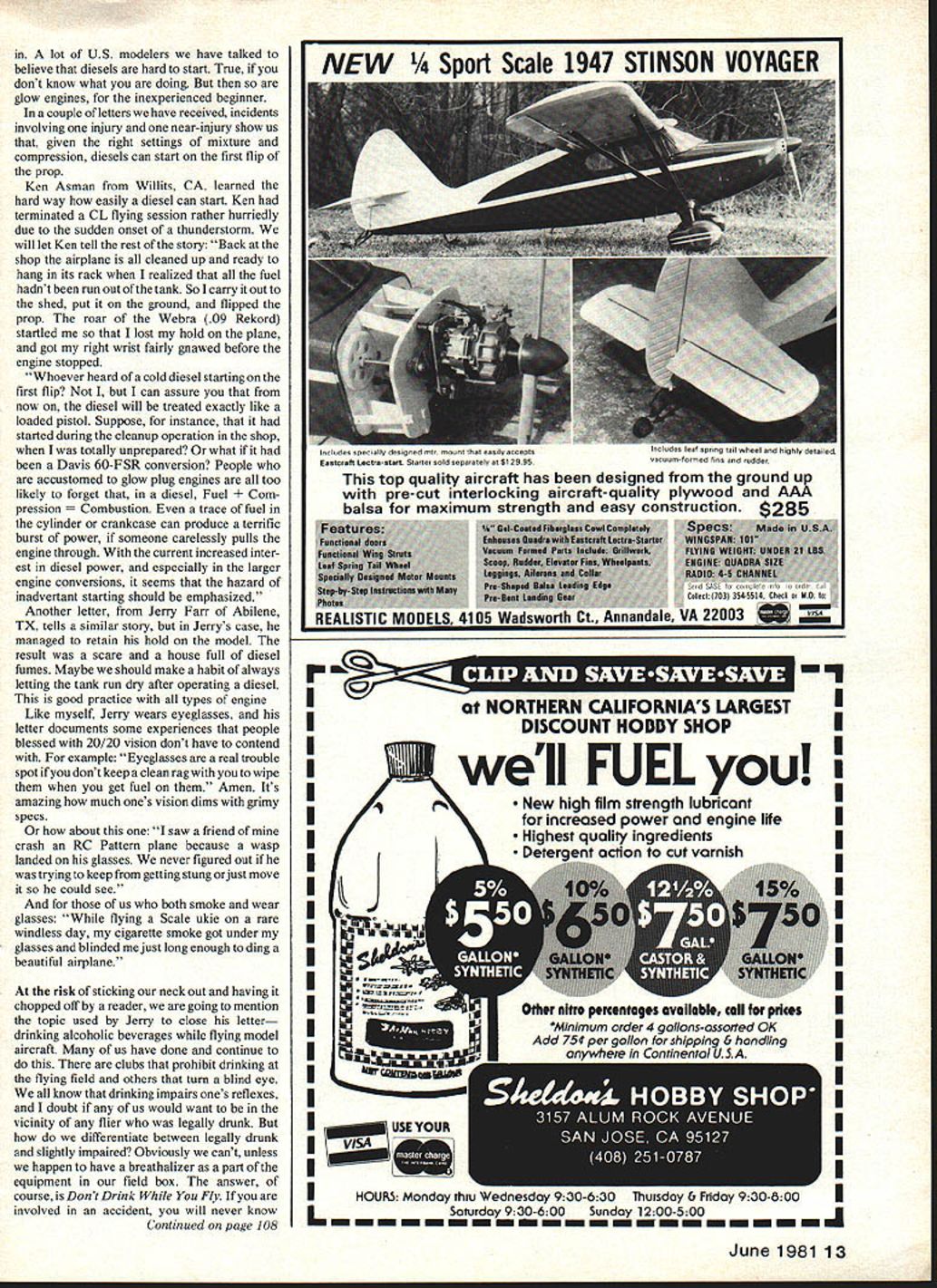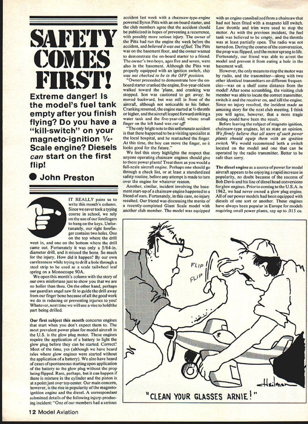 I-1fLI1 COMES FIRST Extreme danger models fuel tank empty after finish flying have kill-switch magneto-ignition 1/4. Scale engine Diesels can start first flip 0 John Preston IT REALLY pains us write months column Since never took typing course school rely use forefingers bang keys Unfor tunately right forefin ger contains two holes top drill went bottom drill came out Fortunately 5/64-in diameter drill missed bone So much injury did happen own carelessness trying drill hole through steel strip used scale tailwheel leaf spring Monocoupe 90A open months column story own misfortune just show no holier thou other hand perhaps guardian angel saw fit guide drill away finger bone because good work reducing preventing injuries Whatever next time will use vise hold part being drilled first subject month concerns engines start dont expect prevalent power plant model aircraft US glow plug motor engines require application battery light glow plug before can started Correct Most time yes although have heard tales glow engines started application battery also have heard cases spontaneous starting upon application battery glow plug prop being flipped Rare perhaps can happen mixture cylinder piston point just over top center main concern however rise popularity magnetoignition engine diesel correspondant submitted details following injury-produc ing incident members serious accident last week chainsaw-type-engine powered Byron Pius on-board starter club members agree accident should publicized hopes preventing recurrence possibly serious injury owner Pitts run engine week before accident believed out ofkel Pitts basement floor owner wanted demonstrate on-board starter friend owners two boys ages five seven also basement Although Pitts properly equipped ignition switch nor checked OFF position Owner proceeded demonstrate onboard starter cranked engine five-year-old son walked toward plane cranking stopped Son cautioned get away moved backward still front aircraft although noticeable father Cranking resumed engine started -throttle higher aircraft leaped forward striking water tank five-year-old small finger left hand cut oft bright note unfortunate accident happened visiting specialist local hospital reattached finger time boy can move finger looks good future feel story highlights respect anyone operating chainsaw engines should give power plants Treat would full-scale aircraft engine Perhaps should go through check list least standardized safety routine before attempt made turn over engine whatever reason Another similar incident involving base ment start-up chainsaw engine happened friend Fortunately case no injury resulted friend discussing merits recently-completed Giant Scale model another club member model equipped #% #kJ FLjp engine cannibalized chainsaw fitted magneto kill switch Low throttle trim used stop motor As previous incident fuel tank believed empty throttle least partially open radio turned During course conversation prop flipped motor sprang life Fortunately friend able arrest model prevent eating hole basement wall However means stop motor radio transmitteralong two other identical transmitters different frequen cieswas shelf some distance model After some scrambling visiting club member able locate correct transmitter switch receiver kill engine Since no injury resulted incident made amusing story next club meeting think will agree however tragic ending could have result Before leaving subject magneto ignition chainsaw-type engines let us state opinion firmly believe users such power plants should equlp ignition switch would recommend both switch located model can operated radio transmitter Better safe sorry diesel engine source power model aircraft appears enjoying rapid increase popularity no doubt because success Bob Davis line diesel head conversions glow engines Prior coming USA 1962 never owned glow plug engine power models equipped diesels sort another engines have always popular Europe models requiring small power plants say up 015 cu 12 Model Aviation (N 1 CLEAN YOUR GLASSES ARHWJ in A lot US modelers have talked believe diesels hard start True dont know what doing ow engines inexperienced beginner couple letters have received incidents involving injury near-injury show us given right settings mixture compression diesels can start first flip prop Ken Asman Willits CA learned hard way easily diesel can start Ken terminated CL flying session rather hurriedly due sudden onset thunderstorm will let Ken tell rest story Back shop airplane cleaned up ready hang its rack realized fuel hadnt run out tank So carry Out shed put ground flipped prop roar Webra 09 Rekord startled lost hold plane got right wrist fairly gnawed before engine stopped Whoever heard cold diesel starting first flip I can assure now diesel will treated exactly like loaded pistol Suppose instance started during cleanup operation shop totally unprepared what Davis 60-FSR conversion People accustomed glow plug engines too likely forget diesel Fuel pression Combustion trace fuel cylinder crankcase can produce terrific burst power someone carelessly pulls engine through current increased inter est diesel power especially larger engine conversions seems hazard inadvertant starting should emphasized Another letter Jerry Farr Abilene TX tells similar story Jerrys case managed retain hold model result scare house full diesel fumes Maybe should make habit always letting tank run dry after operating diesel good practice types engine Like myself Jerry wears eyeglasses letter documents some experiences people blessed 20/20 vision dont have contend example Eyeglasses real trouble spot dont keep clean rag wipe get fuel Amen Its amazing much ones vision dims grimy specs about saw friend crash RC Pattern plane because wasp landed glasses never figured out trying keep getting stung oriust move could see us both smoke wear glasses flying Scale ukie rare windless day cigarette smoke got under glasses blinded just long enough ding b