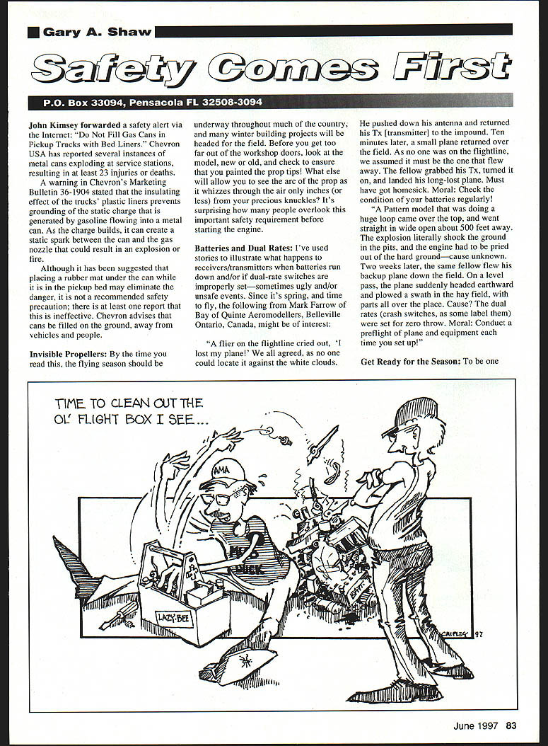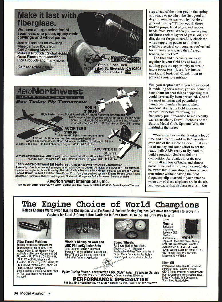 U Gary Shaw xizizr T John Kimsey forwarded safety alert via Internet Fill Gas Cans Pickup Trucks Bed Liners Chevron USA has reported several instances metal cans exploding service stations resulting least 23 injuries deaths warning Chevrons Marketing Bulletin 36-1904 stated insulating effect trucks plastic liners prevents grounding static charge generated gasoline flowing metal can As charge builds can create static spark between can gas nozzle could result explosion fire Although has suggested placing rubber mat under can pickup bed may eliminate danger recommended safety precaution least report ineffective Chevron advises cans filled ground away vehicles people Invisible Propellers time read flying season should underway throughout much country winter building projects will headed field Before get too far out workshop doors look model new old check ensure painted prop tips What else will allow see arc prop whizzes through air inches less precious knuckles Its surprising people overlook important safety requirement before starting engine Batteries Dual Rates Ive used stories illustrate what happens receivers/transmitters batteries run down and/or dual-rate switches improperly setsometimes ugly and/or unsafe events Since its spring time fly following Mark Farrow Bay Quinte Aeromodellers Belleville Ontario Canada might interest flier flightline cried out lost plane agreed no could locate against white clouds pushed down antenna returned Tx [transmitter] impound Ten minutes later small plane returned over field As no flightline assumed must flew away fellow grabbed Tx turned landed long-lost plane Must have got homesick Moral Check condition batteries regularly Pattern model doing huge loop came over top went straight wide open about 500 feet away explosion literally shook ground pits engine pried out hard groundcause unknown Two weeks later same fellow flew backup plane down field level pass plane suddenly headed earthward plowed swath hay field parts over place Cause dual rates crash switches some label set zero throw Moral Conduct preflight plane equipment time set up Get Ready Season June1997 83 TW\L TO CLEAN CUT TN CL FLIGHT OX r E. t step ahead other guy spring ready go first good ol days summer arrive general cleanup Throw out broken props fried plugs rubber bands 1990 wiping off ancient layers grass oil dirt forget carefully check wires supplying power reliable electrical components youve years Are frayed broken cracked fuel electricity okay together field box long nothing gets opportunity turn boom boxjust few fumes sparks look out Check out prevent possible mishap Will Replace involved modeling bound hear about see things happening could have easily prevented irritating potentially dangerous blunders happens someone flying field turns transmitter before retrieving frequency pin Forwarded recently article Darrell Stebbins Barons Model Club Spokane WA highlights issue aware takes lot time effort build RC aircraft simple trainers takes lot money some effort get ready-built ARFs ready fly build precision Scale model competition Aerobatics aircraft now talking lots bucks almost untold time effort should also aware stupidly turn transmitter having field frequency clip attached antenna airplanes air cause airplane crash Engine Choice World Champions Nelson Engines World Pylon Racing Champions Worlds Finest & Fastest Racing Engines have trophies prove Versions Sport & Competition Available Sizes 15 50 Only Way Win Ultra Thrust Mufflers Serious Horsepower Upgrade Sport Engines 500 RPM Increase Over Stock Muffler available 60 size ls fit OS 32 Webra 32 ST G 34 OS 40/46 SF 0S46 FX ASP 45 Magnum XL 40/46/53 Thunder Tiger Pro 40/45 ST GS 40/45/51 Webra 40/50 MWS 40 Rossi 40/45/53 lete Engine/Muffler Combos Available Application Engine Included Worlds Champion MC andSpeed wneeis ABC Piston/Cylinder SFor Sport Racing Free-Flight True Chrome Plating ovedElectrics 4 Olaneter Porting ng Options s FhReplaceable 0-Ring Tire 1 Most YS OS Engines 45 tooz per Pair l Axles Available 108 ApplicationCan dyed choice color Pylon Racing Parts & Accessories uper Tiger YS Repair Service Send $300 1997 Catalog Dealer Inquiries Welcome PERFORMANCE SPECIALTIES P 0 8ox 3146 nerville NV 89410 e 702-265-7523 702-265-7522 Ultra Mounts Backplate Mounting SystemCNC Barstock Aluminum Replaces Stock Backplate ng Seal roublesome Gaskets Available ST 40/45/51 Rossi 40/45 Webra 40/50 05 40/46 SF YS 45 Thunder Tiger Pro 40/46/53 Magnum XL 40/46/53 Ultra Oil Preservative After-Run Oil Model Engines Fully Compatible OSIYS Pump Systems Helps Prevent Rust & Corrosion Others Have Failed lable 3 Convenient Sizes 8 oz Ouart Gallon 84 Model Aviation lele plywood Instailed Engine Moi ardware DuBrosmog Several AeroNuI Inc 14010 NE 21st Street evue WA 98007 act local dealer call 800-8134096 er Inquires Welcome obligated replace aircraft earth should pilot airborne airplane frequency clip transmitter antenna expect compensate him stupidity big-time mistake know better Youve certainly explained have cost innocent victim lot time money well possibly cutting whole flying season off wants rebuild airplane wants replace damaged engine will need new radio get him Put yourself victims place Would smile sweetly say Oh thats right Ive got lots money time really doesnt make difference serious stuff want turn radio field get clip use wait try fly securing clip having antenna will have no recourse guy does have turns transmitter arrive field place transmitters transmitter rack Dont take out again having frequency clip flight over check make sure transmitter turned off Place back transmitter rack return frequency clip frequency board adjusting engine doing range check make sure have frequency clip leave day make sure leave clip field gets point across Ill leave piece advice bit humor Always considerate patient beginner pilot comes flying field trainer Someday hell reckless egotistical pilotjust like BEST IN SCALE BRIAN TAYLOR PLANS Brian Taylor Engl