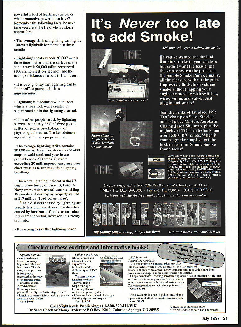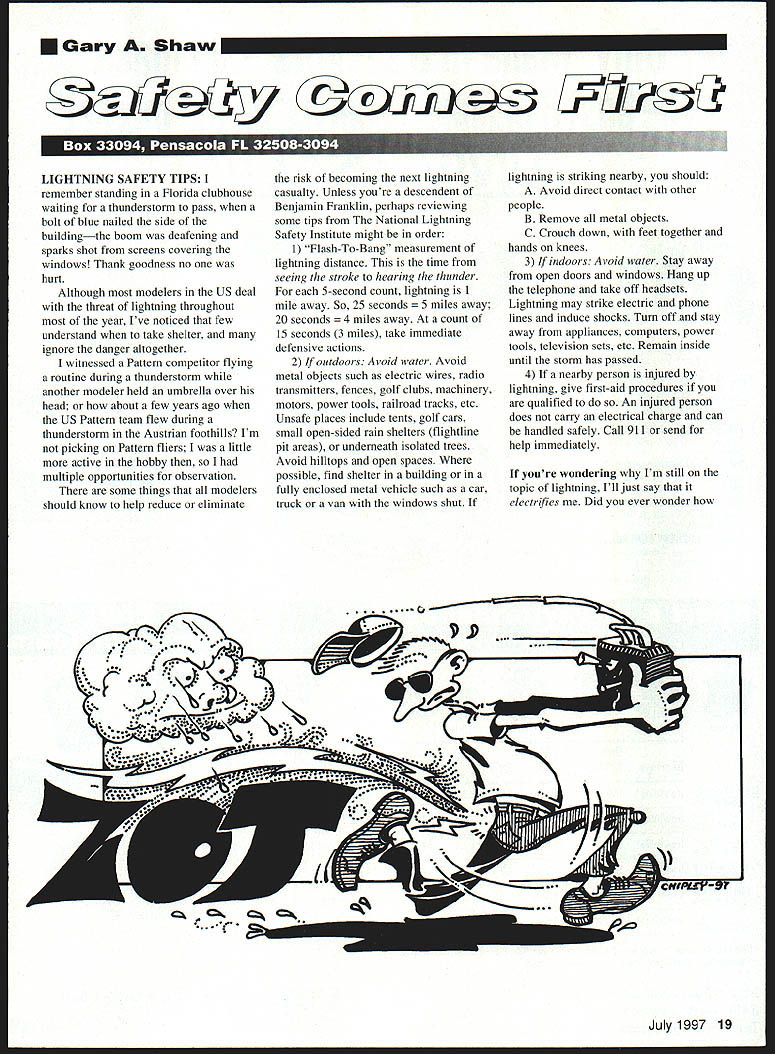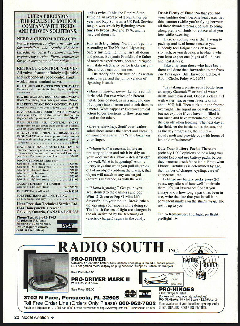 Gary Shaw LIGHTNING SAFETY TIPS remember standing Florida clubhouse waiting thunderstorm pass bolt blue nailed side buildingthe boom deafening sparks shot screens covering windows Thank goodness no hurt Although modelers US deal threat lightning throughout year Ive noticed few understand take shelter ignore danger altogether witnessed Pattern competitor flying routine during thunderstorm another modeler held umbrella over head about few years ago US Pattern team flew during thunderstorm Austrian foothills Im picking Pattern fliers little active bobby multiple opportunities observation some things modelers should know help reduce eliminate risk becoming next lightning casualty Unless youre descendent Benjamin Franklin perhaps reviewing some tips National Lightning Safety Institute might order 1 Flash-To-Bang measurement lightning distance time seeing stroke hearing thunder 5-second count lightning 1 mile away So 25 seconds les away 20 seconds les away count 15 seconds 3 miles take immediate defensive actions 2 If outdoors Avoid water Avoid metal objects such electric wires radio transmitters fences golf clubs machinery motors power tools railroad tracks etc Unsafe places include tents golf cars small open-sided rain shelters flightline pit areas underneath isolated trees Avoid hilltops open spaces possible find shelter building fully enclosed metal vehicle such car truck van windows shut lightning striking nearby should A Avoid direct contact other people B Remove metal objects C Crouch down feet together hands knees 3 If indoors Avoid water Stay away open doors windows Hang up telephone take off headsets Lightning may strike electric phone lines induce shocks Turn off stay away appliances computers power tools television sets etc Remain inside until storm has passed 4 If nearby person injured lightning give first-aid procedures qualified An injured person does carry electrical charge can handled safely Call 911 send help immediately youre wondering Im still topic lightning Ill just say electrifies Did ever wonder -r July1997 19 -1~ powerful bolt lightning can what destructive power can have Remember following facts next time field storm approaches average flash lightning will light 100-watt lightbulb three months Lightnings heat exceeds 500000—it three times hotter surface sun travels 90000 miles per second 100 million feet per second average thickness bolt 1-2 inches wrong say lightning can stopped preventedit unpredictable Lightning associated thunder shock wave created superheated air lightning channel Nine ten people struck lightning survive nearly 25% people suffer long-term psychological physiological trauma best defense against lightning preparedness average lightning strike contains 20000 amps An arc welder uses 250-400 amps weld steel house probably uses 200 amps Currents exceeding 20 milliamperes can cause chest muscles contract thus stopping breathing worst lightning incident US New Jersey July 10 1926 Navy ammunition arsenal hit killing 19 people destroying property valued at $17 million 1986 dollar value Single disasters caused lightning usually less dramatic single disasters caused hurricanes floods tornadoes victim however plenty dramatic wrong say lightning never Building Flying RC Sailplanes Electric Gliders explores intricacies different type R/G flying Chapters include Landing methods Thermal flying Slope soaring Operating electric motors power systems Choosing hatteries charging Also availahle pocket guide containing Building tips techniquesreproduction of aerohatic maneuvers Cost $1195 Cost $299 Call Nighthawk Publishing 1-800-390-HAWK Send Check Money Order P 0 Box 15019 Colorado Springs CO 80935 Shipping & Handling charge $250 added hook purchased July 1997 21 Safe Easy RC Flying has heen RIG Sport favorite manyCompetition Aerabatics heginning pilots comprehensive manual takes pitt instructors sixinto exciting world RC aerohatics intricacies step tested programaerohatic flight presented easy understand steps have nero completelyproven time again under actual training conditionr presented easy Chapters include Choosing aerohatic airplanes understand guideand precisely trimming airplanes Several Chapters includeaerohatic maneuvers detailed instructions AerodynamicsContest preparation actual competition tips Selecting trainer Cost $1395 plane c flight orming take offs Landing pattems ly landing plane Leaming ahout Safety Cost $995 RETRACT CONT valves feature independent speed work standard s UP1 ADJUSTABLE SPEEI retract use air movements UP2 RETRACT AND DO Doors close gear b UP3 RETRACT AND DO Doors stay open gear UP4 SECONDARY DO use UP2 valve stay open gears dow UPS SPRING AIR Independent up down sj air up spring dowr UP6 VARIABLE PRF5 TROL VALVE minia give smooth hreaking coi movement UP7 LOW PRESSURE insurance policy against runi tem monitors on-board air pi gear down pressure gets too DOOR CYLINDERS Metal 5/l6 dia x inch stroke .. 5/16 dia x 1-5/16 inch stroke 5/16 dia x 1-1/2 inch stroke 7/16 dia x 1 inch stroke .. 7/16 dia x 1-1/4 inch stroke 7/16 dia x 1-1/2 inch stroke CANOPY OPENING CYL 7/16 dia x 3-1/4 inch stroke . TEE FITTINGS metal .. POLYURETHANE AIRLINE 2xSftorangeandgrey Ultra Precision Te 1244 Honeysuckle Cresce Oakville Ontario CANA Phone/Fax 905-842-1703 prices US funds Shipping $450 world wide Dealer Inquiries welcome Send Free Catalog strikes twice hits Empire State Building average 21-25 times per year Ray Sullivan US Park Service ranger struck lightning seven times between 1942 1976 survived Fun Lightning No didnt get hit According National Lightning Safety Institute lightning isnt doom gloom Benjamin Franklin father modern experiments became intrigued static-electricity parlor tricks early life can too theory electrification lies within static charge junior version lightning static Make electric lemon Lemons contain citric acid Put two wires different metals steel nail copper lemon attach meter What happens Electrochemical action forces elec
