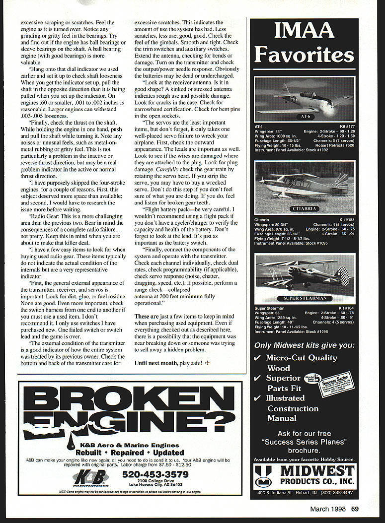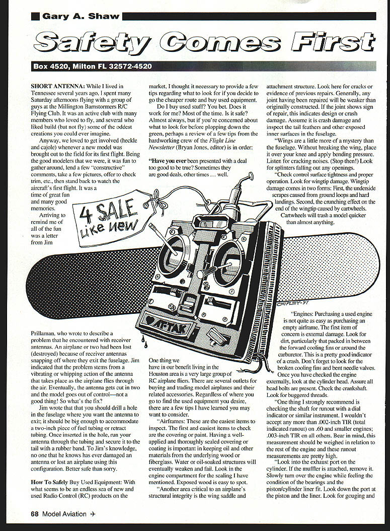 Gary Shaw SHORT ANTENNA lived Tennessee several years ago spent Saturday afternoons flying group guys Millington Barnstormers RIC Flying Club active club members loved fly several liked build fly some oddest creations could ever imagine Anyway loved get involved heckle cajole whenever new model brought out field its first flight Being good modelers fun gather around lend few constructive comments take few pictures offer check trim etc stand hack watch aircrafts first flight time great fun good memones Arriving remind of fun letter Jim antennas An airplane two lost destroyed because receiver antennas snapping off exit fuselage Jim indicated problem stems vibrating whipping action antenna takes place airplane flies through air Eventually antenna gets cut two model goes out controlnot good thing So whats fix Jim wrote that should drill hole fuselage want antenna exit should big enough accommodate two-inch piece fuel tubing retract tubing Once inserted hole run antenna through tubing secure tail rubber band Jims knowledge no knows has ever damaged antenna lost airplane using configuration Better safe sorry Safely Buy Used Equipment what seems endless sea new used Radio Control RC products market thought necessary provide few tips regarding what look decide go cheaper route buy used equipment buy used stuff bet Does work Most time safe Almost always youre concerned about what look before plopping down green perhaps review few tips hardworking crew Flight Line Newsletter Bryan Jones editor order Have ever presented deal too good nije Sometimes good deals other times . well thing have benefit living Houston area very large group RC airplane fliers several outlets buying trading model airplanes related accessories Regardless go find used equipment desire few tips have learned may want consider Airframes easiest items inspect first easiest items check covering paint Having wellapplied thoroughly sealed covering coating important keeping oil other materials underlying wood fiberglass Water oil-soaked structures will eventually weaken fail Look engine compartment sealing have mentioned Exposed wood easy spot Another area critical airplanes structural integrity wing saddle attachment structure Look cracks evidence previous repairs Generally joint having repaired will weaker originally constructed joint shows sign repair indicates design crash damage Assume crash damage inspect tail feathers other exposed inner surfaces fuselage Wings little mystery fuselage Without breaking wing place over knee apply bending pressure Listen cracking noises Stop Look splinters falling out openings Check control surface tightness proper operation Look wingtip damage Wingtip damage comes two forms First underside scrapes caused ground loops hard landings Second crunching effect end wingtip caused cartwheels Cartwheels will trash model quicker almost anything . . . . . . 7 Engines Purchasing used engine quite easy purchasing empty airframe first item concern external damage Look dirt particularly packed between forward cooling fins around carburetor pretty good indicator crash Dont forget look en cooling fins bent needle valves Once have checked engine externally look cylinder head Assure head bolts present Check crankshaft Look buggered threads thing strongly recommend checking shaft runout dial indicator similar instrument wouldnt accept 002-inch TIR total indicated runout 60 smaller engines 003-inch TIR others Bear mind measurement should weighed relation rest engine runout measurements pretty high Look exhaust port cylinder muffler attached remove Slowly turn over engine feeling condition bearings piston/cylinder liner fit Look down port piston liner Look gouging 68 Model Aviation laman wrote describe problem encountered receiver excessive scraping scratches Feel engine turned over Notice grinding gritty feel bearings Try find out engine has ball bearings sleeve bearings shaft ball bearing engine good bearings valuable Hang onto dial indicator used earlier set up check shaft looseness get indicator set up pull shaft opposite direction being pulled set up indicator engines 60 smaller 001 002 inches reasonable Larger engines can withstand 003-005 looseness Finally check thrust shaft holding engine hand push pull shaft turning Note noises unusual feels such metal-onmetal rubbing gritty feel particularly problem inactive reverse thrust direction may real problem indicator active normal thrust direction have purposely skipped four-stroke engines couple reasons First subject deserved space available second would have research issue before writing Radio Gear challenging area previous two Bear mind consequences complete radio failure . pretty Keep mind about make killer deal have few easy items look buying used radio gear items typically indicate actual condition internals very representative indicator First general external appearance transmitter receiver servos important Look dirt glue fuel residue None good important check switch harness end another must use used item dont recommend use switches have purchased new failed switch switch lead game over external condition transmitter good indicator entire system treated its previous owner Check bottom back transmitter case excessive scratches indicates amount use system has Less scratches less use good good Check feel gimbals Smooth tight Check trim switches auxiliary switches Extend antenna checking bends damage Turn transmitter check output/power needle response Obviously batteries may dead undercharged Look receiver antenna good shape kinked stressed antenna indicates rough use possible damage Look cracks case Check narrowband certification Check bent pins open sockets servos least important items dont forget takes well-placed servo failure wreck airplane First check outward appearance leads important well Look see wires damaged attached plug Look plug damage Carefully check gear train rotating servo head strip servo may have buy wrecked servo Dont step dont feel sure wha