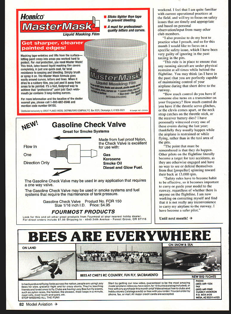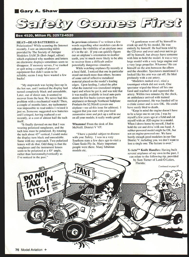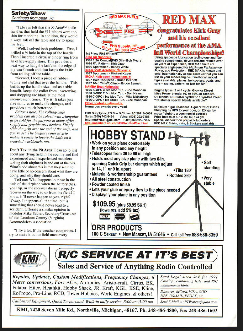 U Gary Shaw ElVWil.WSMflmTrU DEAD BATTERIES Polarization scanning Internet recently saw interesting tidbit provided Society Antique Modelers SAM 26 Bob Angel editor explained numbers letters electronic displays sometimes seem disappear memory serves Ive trashed quit using couple pieces equipment didnt seem reliable seems may have wasted few bucks stopwatch laying face-up hot sun noticed display turned completely black unreadable Later out direct sun seemed recover heat never bad problem mechanical watch couple months later tachometer impossible read unless twisted just Someone suggested new batteries cringed having replaced set recently cost almost half tach itself finally dawned wearing polarized sunglasses tach lens must polarized rotating tach about 450 vertical could make display turn black unreadable Same stopwatch Two polarized lenses will Odd thing sunglasses instrument lenses seem polarized 450 angle rather horizontally/vertically Ive noticed past previous columns Ive written few words regarding what modelers can enhance visibility airplane once its air can quickly figure out airplanes orientation mother earth youre much likely able recover difficult and/or potentially dangerous situation watching airplanes fly recently local field noticed particular stood out much others because some sort reflective metalized material placed models leading edges Upon landing asked pilot what material metalized striping tape got told readily available local auto parts stores five bucks covers up five airplanes through Northeast Sailplane Products $250/roll covers airplanesee ad issue address suggest start local automotive store pick up roll use models really works great Whammo desk Jim McNeill District V VP have painful subject discuss Safety very Southern state few days ago visit Giant Scale Fly-In important people fabulous models etc gentleman went off himself crank up fly model entirely himself told CD over over over go off himself always have someone him hold model very large model very large engine very large propeller Whammo cut himself arm between elbow shoulder Spectators mentioned looked like arm cut off bled profusely cut artery Modelers rushed over tried tourniquet did work spectator wiped blood off hand reached squeezed artery Within two minutes clock ambulance arrived trained medical personnel hustled off clinic center now OK could have easily bled death Keep mind engine doesnt have large cut myself few years ago field cut myself 020 engine model drove home myself hold cut drive hand rubber-powered model might OK engine-powered have barely enough good modelers fine District V including dont want lose single lecture over XActoTM Knife Handles Having built several airplanes own past can relate following tip provided -by Sam Turner Land-O-Lakes Florida 1 76 Model Aviation ontinued page 81 Safety/Shaw Continued paqe 76 always felt XActoTM knife handles hold #11 blades too thin modeling addition would always roll off table try spear feet Well solved both problems First drilled /s hole top handle inserted circular binder ring office-supply store provides neat way hang knife edge workbench also keeps knife rolling off table Second took piece rubber tubing slid over handle builds up handle size side benefit keeps collet unscrewing dropping blade inconvenient times Try takes just five minutes make changes provides much better tool Editors note rolling-knife problem can also solved triangular grips sold purpose mony officesupply graphic-arts dealers Simply slide grip over end knife youre set brightly colored grip makes easier locate knife crowded workbench too Dont Taxi Pit Area can go just about flying field country find experienced inexperienced modelers taxiing airplanes out pits Whats odd about seem have little no concern about what doing should care Tell What happens path airplane battery dies trip receiver doesnt properly receive way field know itll never happen right Wrong happens time something should never lead accident Offering similar opinion modeler Mike Sauter Secretary/Treasurer Loudoun County Virginia Aeromodelers Association 1 fly lot weather cooperates try make out field once RED MAX FUELS excdllteutt upply Ifl4 Ver SC 803 2221 1st Place FHS WinnersUUIUPIUUIi1U]IU54 AMA Air Nationals 1997 112A CombatFHS Oil Bob Mears 1996 PAl Pattern Kirk Gray 1996 Sportsman Randy Wolfe MAC Scale Aerobatic Nationals 1997 Sportsman Michael Kuper IRCHA Helicoter Internationals 1997 10cc TopSpeed Bruce Bennett 1997 10cc TimeToClib Bruce Bennett NAMBA Boat Nationals 1996 A-OPC 35cc Mod Tun Joe Monohan 1996 B-OPC 75cc Mod Tun Don Hirami 1996 C-OPC 11cc Mod Tun Mike McKabney 1996 C-OPC 11cc Stock Tun Joe Monohan Other contests nationwide Numerous awards year FHS Supply lncPO Box 9CloverSC 2971 0-0009 Sales800 742-8484 Voice 803 222-7488 lnternetFHSoiIaolcom Fax803 222-7285 htto/Imembersaolcom/FHSoil/RedMax html World CL Using spaceage lubrication tecVnology top quality components developed refined over 28 years experience RED MAX fuels specially engineered Maximum Performance Power Protection RED MAX known sold internationally best fuel can use model engine Fuel model types available planes helicopters boats cars ng pattern just fun Engine types 2 4 cycle Glow Diesel Nitro Power blends 0% 75% 5% Oil blends RED MAX Synthetic Syn-Cas Blend **Customer special blends available Minimum gal Standard 4-gal 20-qt Cases Shipping UPS door 12 gal motorfreight commercial address Price breaks 4 12 20 60124 gal Special discount prepaid club orders RED MAX Shirts Hats & Stickers available HOBBY Work plane comfortably position height eTelescopes 30 60 high Holds size plane two 6-in opening Quick Grip bar clamps adjust 14 11 or9in apartTilts 1800 Material & workmanship guaranteed tes 3600 steel construction Powder coated finish Lets glue epoxy flow place needed Displays plane position $10995 plus $995 S&H Iowa res add 5% tax 41 Self standing Very ~yable ORR PRODUCTSI 100 C STREET MARKET IA 51646 toll free 888-588-33