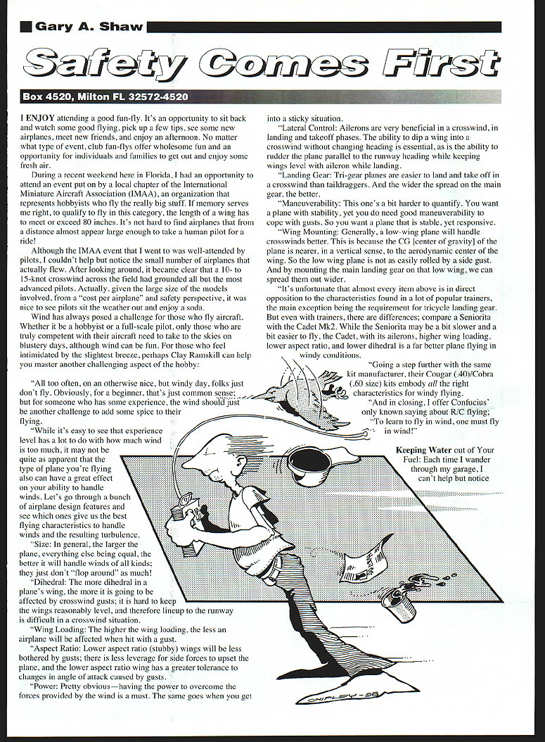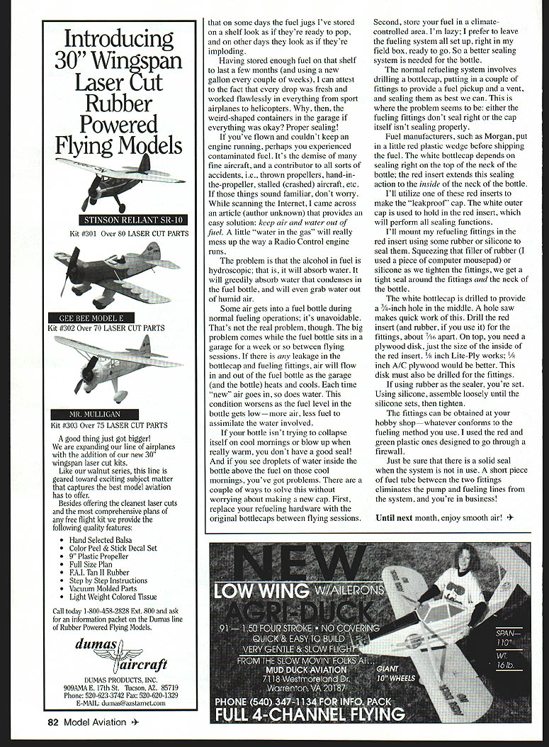 Gary Shaw U riw LV21 Liii IqiIE d Although IMAA event went well-attended pilots couldnt help notice small number airplanes actually flew After looking around became clear 10- 15-knot crosswind across field grounded advanced pilots Actually given large size models involved cost per airplane safety perspective nice see pilots sit weather out enjoy soda Wind has always posed challenge fly aircraft Whether hobbyist full-scale pilot truly competent aircraft need take skies blustery days although wind can fun feel intimidated slightest breeze perhaps Clay Ramskill can help master another challenging aspect hobby too often otherwise nice windy day folks just ENJOY attending good fun-fly Its opportunity sit backinto sticky situation watch some good flying pick up few tips see some new ral Control Ailerons very beneficial crosswind airplanes meet new friends enjoy afternoon No matterlanding takeoff phases ability dip wing what type event club fun-flys offer wholesome fun ancrosswind changing heading essential ability opportunity individuals families get out enjoy somerudder plane parallel runway heading keeping fresh airwings level aileron landing During recent weekend Florida opportunity ing Gear Tn-gear planes easier land take off attend event put local chapter Internationala crosswind taildraggers wider spread main Miniature Aircraft Association IMAA organization thatgear better represents hobbyists fly really big stuff memory serves uverability ones bit harder quantify want right qualify fly category length wing hasa plane stability yet need good maneuverability to meet exceed 80 inches Its hard find airplanes fromcope gusts So want plane stable yet responsive distance almost appear large enough take human pilot Mounting Generally low-wing plane will handle ridecrosswinds better because CG [center gravity] plane nearer vertical sense aerodynamic center wing So low wing plane easily rolled side gust mounting main landing gear low wing can spread Out wider Its unfortunate almost item above direct opposition characteristics found lot popular trainers main exception being requirement tricycle landing gear trainers differences compare Seniorita Cadet Mk2 Seniorita may bit slower bit easier fly Cadet its ailerons higher wing loading lower aspect ratio lower dihedral far better plane flying windy conditions Going step further same kit manufacturer Cougar 40/Cobra ~60sizekitsembodyalltheright dont fly Obviously beginner thats just common sense.jcharacteristics windy flying someone has some experience wind should Just closing offer Confucius another challenge add some spice theironly known saying about R/C flying flying To learn fly wind must fly its easy see experience level has lot much wind too much may quite apparent type plane youre flying also can have great effect ability handle winds Lets go through bunch airplane design features see ones give us best flying characteristics handle winds resulting turbulence Size general larger plane everything else being equal better will handle winds kinds just dont flop around much Dihedral dihedral planes wing going affected crosswind gusts hard keep wings reasonably level therefore lineup runway difficult crosswind situation Wing Loading higher wing loading less airplane will affected hit gust Aspect Ratio Lower aspect ratio stubby wings will less bothered gusts less leverage side forces upset plane lower aspect ratio wing has greater tolerance changes angle attack caused gusts Power Pretty obvioushaving power overcome forces provided wind must same goes get Keeping Water out Fuel Each time wander through garage cant help notice Introducing 30 Wingspan Laser Cut Rubber Powered Flying Models 4 Kit #301 Over 80 LASER CUT PARTS Kit #302 Over 70 LASER CUT PARTS Kit #303 Over 75 LASER CUT PARTS good thing just got bigger expanding line airplanes addition new 30 wingspan laser cut kits Like walnut series line geared toward exciting subject matter captures best model aviation has offer Besides offering cleanest laser cuts comprehensive plans free flight kit provide following quality features Hand Selected Balsa Color Peel & Stick Decal Set 9 Plastic Propeller Full Size Plan EAL Tan II Rubber Step Step Instructions Vacuum Molded Parts Light Weight Colored Tissue Call today 1-800-458-2828 Ext 800 ask information packet Dumas line Rubber Powered Flying Models dumas aircraft DUMAS PRODUCTS INC 9O9AMA E 17th St Tucson AZ 85719 Phone 520-623-3742 Fax 520-620-1329 E-MAIL dumas@azstametcom 82 Model Aviation 4that some days fuel jugs Ive stored shelf look theyre ready pop other days look theyre imploding Having stored enough fuel shelf last few months using new gallon couple weeks can attest fact drop fresh worked flawlessly everything sport airplanes helicopters weird-shaped containers garage everything okay Proper sealing youve flown couldnt keep engine running perhaps experienced contaminated fuel Its demise fine aircraft contributor sorts accidents ie thrown propellers hand-inthe-propeller stalled crashed aircraft etc things sound familiar dont worry scanning Internet came across article author unknown provides easy solution keep air water out fuel little water gas will really mess up way Radio Control engine runs problem alcohol fuel hydroscopic will absorb water will greedily absorb water condenses fuel bottle will grab water out humid air Some air gets fuel bottle during normal fueling operations its unavoidable Thats real problem though big problem comes fuel bottle sits garage week between flying sessions leakage bottlecap fueling fittings air will flow out fuel bottle garage bottle heats cools time new air goes does water condition worsens fuel level bottle gets lowmore air less fuel assimilate water involved bottle isnt trying collapse itself cool mornings blow up really warm dont have good seal see droplets water inside bottle above fuel cool mornings youve got problems couple ways solve worrying about making new cap First replace refueling hardware original b