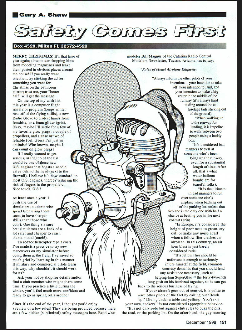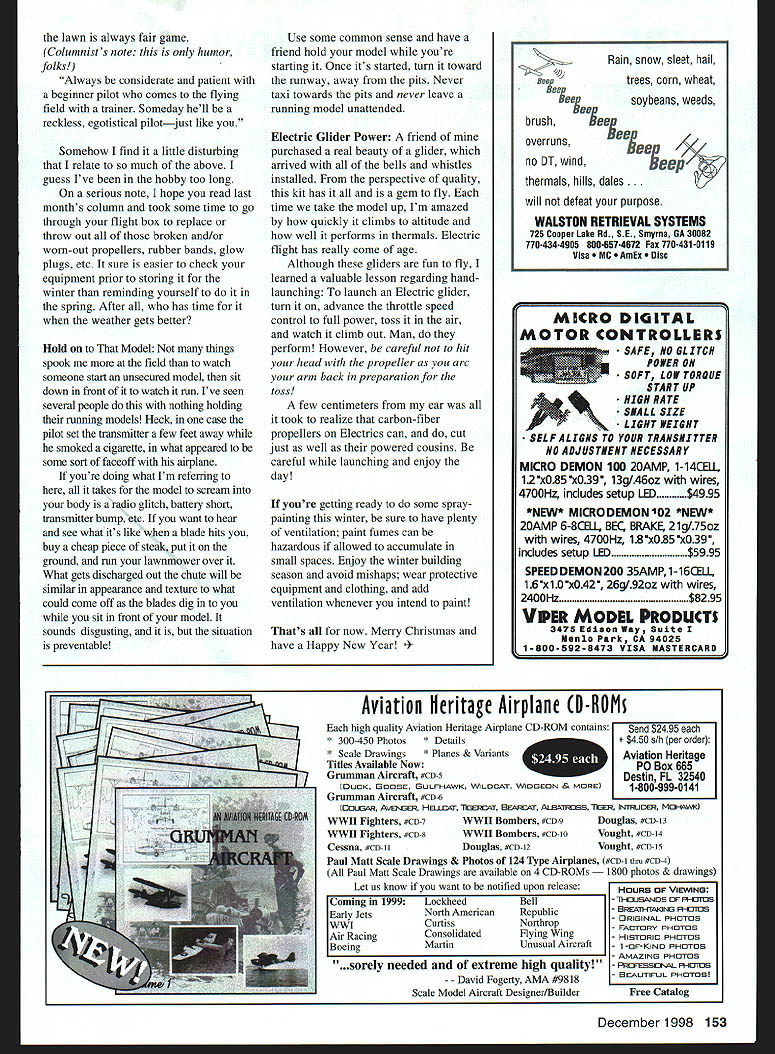 U Gary Shaw fiyW IV4Ifl ni II] MERRY CHRISTMAS Its time year again time tear shopping hints modeling magazines leave posted obvious places around house really want attention try sticking ad something want Christmas bathroom mirror trust better half will get message top wish list year computer flight simulator program keeps winter rust off flying skills new Radio Glove protect hands frostbite foam glider grin Okay maybe Ill settle few favorite glow plugs couple propellers case two reliable fuel Guess Im just optimist knows maybe can count glow plugs really wanted get serious top list would new OS engines boasts needle valve behind head next firewall believe its now standard OS engines thereby reducing risk fingers propeller Nice touch OS least once year push use simulators students spend time using seem have sharper skills dont things sure bet simulators heck lot safer cheaper crash model ouch reduce helicopter repair costs Ive made practice try new maneuvers simulator before doing field Ive saved much grief learning manner military commercial pilots learn way shouldnt should work us Ask hobby shop details and/or find club member might share some time practice little during winter youll feel much confident ready go spring rolls around Since its end year thought youd enjoy review few rules being provided because few hidden subliminal safety messages Read what 4 modeler Bill Magnus Catalina Radio Control Modelers Newsletter Tucson Arizona has say Rules Model Airplane Etiquette Always inform other pilots intentionsyour intention take off intention land intention make big crater middle runway its always hard taxiing around fuselage tails sticking out ground walking up runway landing impolite walk between two people using buddy box Its considered bad manners yell someone whos tying up runway substantial length time After thats what water balloon bombs careful folks ultimate bad manners run over someone elses airplane backing out parking lot unless airplane half chance beating next contest grin Europe its considered height poor taste groan cry out make noise fellow flier crashes airplane country air horn blast just barely considered rude fellow flier should unfortunate enough seriously injure himself field common courtesy demands should lend assistance necessary such helping him SuperGlueTM forty-two-inch long gash forehead together can get back serious business flying aircraft goes out control polite warn other pilots fact calling out Heads up Diving under table yelling Youre own suckers considered appropriate behavior rude against club rules buzz pits road parking lot other hand guy mowing December 1998 151 lawn always fair game Columnists note humor folks Always considerate patient beginner pilot comes flying field trainer Someday hell reckless egotistical pilotjust like Somehow find little disturbing relate much above guess Ive hobby too long serious note hope read last months column took some time go through flight box replace throw out broken and/or worn-out propellers rubber bands glow plugs etc sure easier check equipment prior storing winter reminding yourself spring After has time weather gets better Hold Model things spook field watch someone start unsecured model sit down front watch run Ive seen several people nothing holding running models Heck case pilot set transmitter few feet away smoked cigarette what appeared some sort faceoff airplane youre doing what Im referring takes model scream body radio glitch battery short transmitter bump etc want hear see what its like blade hits buy cheap piece steak put ground run lawnmower over What gets discharged out chute will similar appearance texture what could come off blades dig you sit front model sounds disgusting situation preventable Use some common sense have friend hold model youre starting Once its started turn toward runway away pits Never taxi towards pits never leave running model unattended Electric Glider Power friend purchased real beauty glider arrived bells whistles installed perspective quality kit has gem fly time take model up Im amazed quickly climbs altitude well performs thermals Electric flight has really come age Although gliders fun fly learned valuable lesson regarding handlaunching launch Electric glider turn advance throttle speed control full power toss air watch climb out Man perform However careful hit head propeller arc arm back preparation toss few centimeters ear took realize carbon-fiber propellers Electrics can cut just well powered cousins careful launching enjoy day youre getting ready some spraypainting winter sure have plenty ventilation paint fumes can hazardous allowed accumulate small spaces Enjoy winter building season avoid mishaps wear protective equipment clothing add ventilation whenever intend paint Thats now Merry Christmas have Happy New Year snow sleet hail trees corn wheat soybeans weeds Bee brushbeeep Beep overrunsBee eep no DT wind thermals hills dales . will defeat purpose WALSTON RETRIEVAL SYSTEMS 725 Cooper Lake Rd SE Smyrna GA 30082 770-434-4905 800-657-4672 Fax 770-431-0119 Visa AmEx MICRO DIGITAL MOTOR CONTROLLERS SAFE NO GLITCH POWER ON SOFT LOW TORQUE START UP HIGH RATE SMALL SIZE LIGHT WEIGHT SELF ALIGNS TO YOUR TRANSMITTER NO ADJUSTMENT NECESSARY MICRO DEMON 100 2OAMP 1-14CELL 12 xO85 xO39 13g/46oz wires 4700Hz includes setup LED 995 *N* MICRO DEMON 102 *NSIJ* 2OAMP 6-8cELL BEC BRAKE 21g175oz wires 4700Hz 18 xOR5 x039 includes setup LED$5995 SPEED DEMON 200 35AMP 1-16CELL 16 xl 0 x042 26g192oz wires 2400Hz$8295 VIPER MODEL PRODUCTS 3475 Edison Way Suite Menlo Park CA 94025 1-aoo-5g2-8473 VISA MASTERCARD Aviation heritage Airplane D-ROM high quality Aviation Heritage Airplane CD-ROM contains Send $2495 * 300-450 Photos * Details $450 s/h per order * Scale Drawings * Planes & VariantsAviation Heritage Titles Available Now ox 665 Grumman Aircraft #D-5Destin FL 32540 DUCK EDOSE GULF-HAWK WILDCAT WIDGEON & MORE 1-800-999-0141 Grumman Aircraft #co-s C~Afl Avaus HELLC4T liGERCAT B