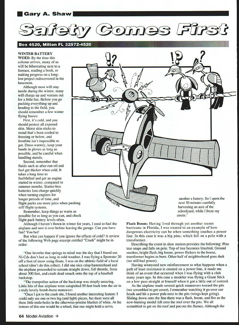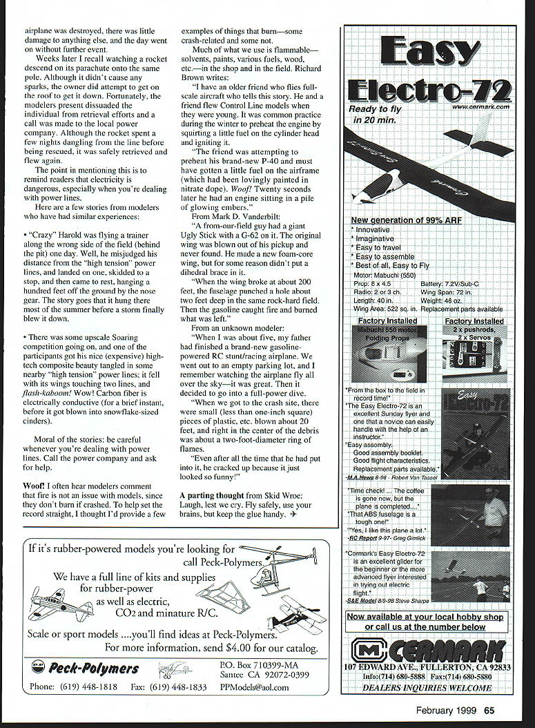 U Gary Shaw WINTER BATTERY WOES time column arrives us will hibernating next furnace reading hook making progress longlost project rediscovered basement Although will stay inside during winter will charge up venture out little fun Before go packing everything up heading field should remember few winter flying basics First its cold should protect exposed skin Moist skin sticks metal thats cooled freezing below frostbite isnt impossible get Dress warmly keep hands gloves long possible careful handling metals Second remember fluids such after-run oil fuel get thicker cold takes long time to __________________________ fuelldefuel get engine started winter compared summer months Starter-box batteries lose charge quickly turning engines longer periods time flight packs use juice pushing stiff flight systems Remember keep things warm possible long can check flight pack battery levels often Although havent flown winter years used fuel airplane turn over before leaving garage Can have fun bet what can happen ignore effects cold review following Web page excerpt entitled Crash might order favorite springs mind day found out Ni-Cds dont last long cold weather flying Sportster 20 off foot snow using floats athletic field local school dont either did nice crisp hammerhead airplane proceeded scream straight down full throttle about 300 feet crash dead smack onto top baseball backstop trampoline action backstop simply amazing Little bits airplane catapulted 50 feet back air truly lovely bomb-burst maneuver Once got crash site found another interesting feature could see two big light pieces little mole-holes otherwise-pristine blanket white bottom would wheel might hold servo 01 f/f her battery So spent next 30 minutes carefully harvesting acre schoolyard froze assets Flash Boom Having lived through yet another recent hurricane Florida treated example dangerous electricity can something touches power line case big pine fell pole transformer Describing event slow motion provides following Pine tree snaps falls pole Top tree becomes blue/red Ground smokes bright flash big boom power flickers house transformer begins burn Other half neighborhood goes dark still power Having witnessed new reinforcement what happens path least resistance created power line made think event occurred flying club years ago case modeler flying Giant Stick low pass straight himself got little out control As airplane made several quick maneuvers toward pits scrambled get cover remember watching go over heads hit power pole next pits wings kept going Sliding down onto line flash boom fire now-burning model fell onto roof over pits scrambled get roof put out flames Although 64 Model Aviation * airplane destroyed little damage anything else day went further event Weeks later recall watching rocket descend its parachute onto same pole Although didnt cause sparks owner did attempt get roof get down Fortunately modelers present dissuaded individual retrieval efforts call made local power company Although rocket spent few nights dangling line before being rescued safely retrieved flew again point mentioning remind readers electricity dangerous especially youre dealing power lines few stories modelers have similar experiences Crazy Harold flying trainer along wrong side field behind pit day Well misjudged distance high tension power lines landed skidded stop came rest hanging hundred feet off ground nose gear story goes hung summer before storm finally blew down some upscale Soaring competition going participants got nice expensive hightech composite beauty tangled some nearby high tension power lines fell its wings touching two lines flash-kaboom Wow Carbon fiber electrically conductive brief instant before got blown snowflake-sized cinders Moral stories careful whenever youre dealing power lines Call power company ask help Woof often hear modelers comment fire issue models since dont bum crashed help set record straight thought Id provide few examples things bumsome crash-related some Much what use flammablesolvents paints various fuels wood etc-in shop field Richard Brown writes have older friend flies fullscale aircraft tells story friend flew Control Line models young common practice during winter preheat engine squirting little fuel cylinder head igniting friend attempting preheat brand-new P-40 must have gotten little fuel airframe lovingly painted nitrate dope Woof Twenty seconds later engine sitting pile glowing embers Mark D Vanderbilt from-our-field guy giant Ugly Stick G-62 original wing blown out pickup never found made new foam-core wing some reason didnt put dihedral brace wing broke about 200 feet fuselage punched hole about two feet deep same rock-hard field gasoline caught fire burned what left unknown modeler about five father finished brand-new gasolinepowered RC stunt/racing airplane went out empty parking lot remember watching airplane fly over sky-it great decided go full-power dive got crash site small less one-inch square pieces plastic etc blown about 20 feet right center debris about two-foot-diameter ring flames after time put cracked up because just looked funny parting thought Skid Wroe Laugh lest cry Fly safely use brains keep glue handy 4If its rubber-powered models youre looking call Peck-Polymers have full line kits supplies rubber-power well electric C02 minature R/G Polyme Scale sport models ull find ideas Peck information send $400 catalog $,PO Box710399-MA J Peck-Pone Santee CA 92072-0399 Phone 619 448-1818Fax 619 448-1833PPMode1s@ao1com Easy Ready flywwwcermarkcom 20 mm * Innovative * Imaginative * Easy travel * Easy assemble * Best Easy Fly Motor Mabuchi 550 Prop 8 x 45Battery 72 V/Sub-C Radio 2 3 chWing Span 72 Length 40 inWeight 46 oz Wing Area 522 sq Replacement pails available I Prom box field record time Easy Electro-72 excellent Sunday flyer novice can easily handle help instructor Easy assembly Good assembly booklet Good flight characteristics Replacement parts available AANeji 8-98 Robert Va