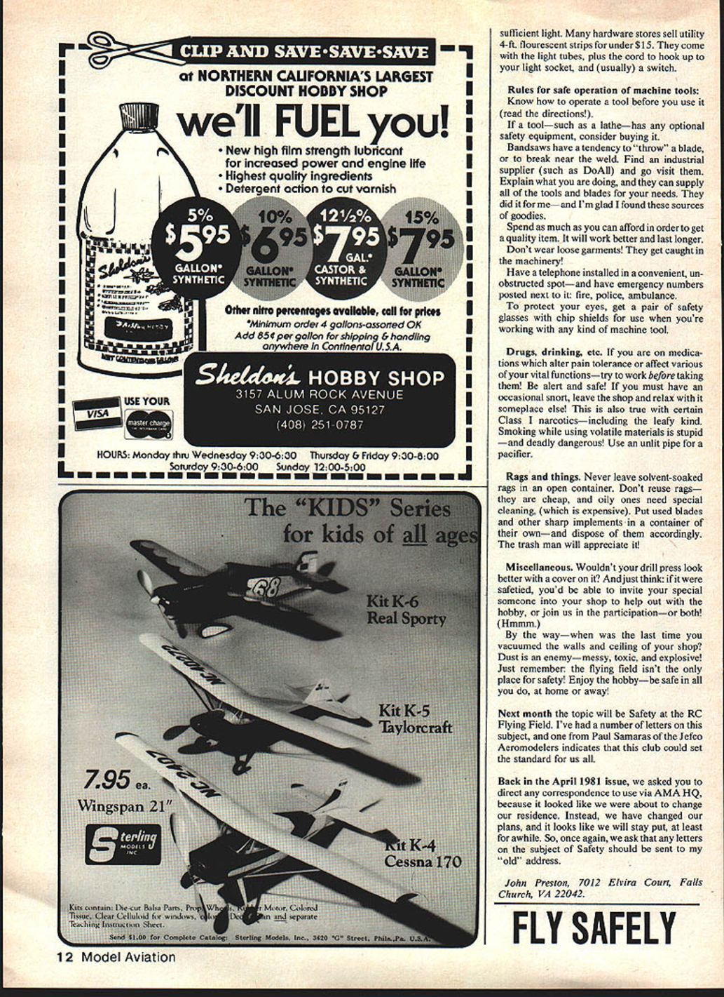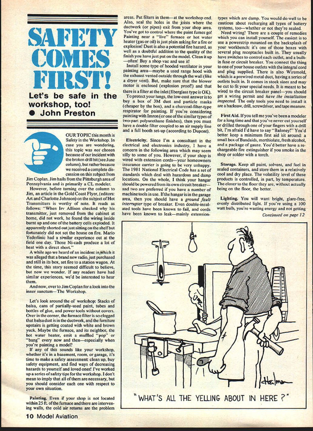 QAUUET ~LtILI1 COMES FIRST Lets safe workshop too 0 John Preston OUR TOPIC month Safety Workshop case wondering topic chosen because incident broken drill bit see June column rather because received complete dis cussion subject Jim Coplan Jim hails Pittsburgh area Pennsylvania primarily CL modeler However before turning over column Jim article Gold Coast Flyer editors Art Charlotte Johnson subject Hot Transmitters worthy note reads follows Irv Allison checked transmitter just removed cabinet home did work found wiring inside burnt up battery cells exploded apparently shorted Out just sitting shelf fortunately did set house fire Mario Yederlinic similar experience out field day Ni-cads produce lot heat direct short ago heard incident inwhich alleged brand new radio just purchased still its box set fire station wagon time story seemed difficult believe now wonder readers have similar experiences wed interested hear now over Jim Coplan look inner sanctumThe Workshop Lets look around ol workshop Stacks balsa cans partially-used paint tubes bottles glue power tools covers Over corner furnace filter clogged balsa dust ductwork furniture upstairs getting coated white brown yuck Maybe furnace its neighbor hot water heater emit muffled pop bang now thenespecially youre painting model sounds like workshop whether its basement room garage its time make safety assessment clean up buy safety equipment find ways decreasing hazards yourself loved ones Ive worked up series safety tips workshop dont mean imply necessary should consider respect own situation Painting shop located within 25 ft furnace interven ing walls cold air returns problem areas Put filters themat workshop end Also seal holes joists ductwork pipes exit shop area Youve got control paint fumes go Painting near live furnace hot water heater gas oil just plain asking fire explosion Dust also potential fire hazard well doubtful addition quality finish have just put model Clean up often Buy shop vac use Install some type hooded ventilator painting areamaybe used range hood exhaust vented outside through wall like dryer vent make sure blower motor enclosed explosion proot filter inlet fiberglass type OK protect lungs low-cost answer buy box 3M dust particle masks cheaper box charcoal-filter-type respirator painting youre considering painting Imron ofthe similar types two-part polyurethane finishes must have double filter coupled air supply line full booth set-up according Dupont Electricity Since Im consultant electrical electronics industry have concern following area may seem silly some However shop wired extension cordsyour homeowners insurance carrier going very unhappy 1981 National Electrical Code has set standards deal hazardous damp locations whole think hangar should powered its own circuit breaker two preferred have number machine tools use hangar garage area should have ground fault interrupter type breaker double-insul ated tools have known fall cords have known leakmainly extensiontypes damp would well cautious about recharging types battery systems toowhether theyre sealed Need wiring couple remedies can install yourself easiest use powerstrip mounted backsplash workbench its boxes several plug receptacles built usually have switches control outlet builtin fuse circuit breaker connect thing house outlets integral cord plug supplied also Wiremold prewired metal duct having series outlets built comes stock sizes may cut fit special needs meant wired circuit breaker panelyou should get wiring permit have installation inspected tools need install hacksaw drill screwdriver tape measure First Aid tell youve modeler long time youve never cut yourself drilled through fingers drill bit Im afraid Id have say Baloney Youd better keep minimum first aid kit around small box ofBandaids merthiolate fresh alcohol package gauze Youd better have re chargeable fire extinguisher smoke shop solder torch Storage Keep palnt solvent fuel sealed containers store relatively cool dry place volatility level products controlled part temperature closer floor actually being floor better Lighting will want bright glare-free evenly distributed light youre using 100 watt bulb youre wasting energy getting Continued page 12 10 Model Aviation WHAT S THE YELLING ABOUT IN HERE HERN CALIFORNIAS LARGESTU DISCOUNT HOBBY SHOPI I well FUELyou New high film strength lubricant power engine life quolily ingredientsI ochon cut varnish 1K I II II II II II II II II II IHOURS Monday thru Wednesday 930-630 Thursday & FrIday 9I L - day93a-600 Sunday 1200-500- - 2 Model Aviation sufficient light hardware stores sell utility 4-ft flourescent strips under $15 come light tubes plus cord hook up light socket usually switch Rules safe operation machine tools Know operate tool before use read directions toolsuch lathehas optional safety equipment consider buying Bandsaws have tendency throw blade break near weld Find industrial supplier such DoAII go visit Explain what doing can supply tools blades needs did meand Im glad found sources goodies Spend much can afford order get quality item will work better last longer Dont wear loose garments get caught machinery Have telephone installed convenient un obstructed spotand have emergency numbers posted next fire police ambulance protect eyes get pair safety glasses chip shields use youre working kind machine tool Drugs drinking etc medica tions alter pain tolerance affect various vital functionstry work before taking alert safe must have occasional snort leave shop relax someplace else also true certain Class narcoticsincluding leafs kind Smoking using volatile materials stupid deadly dangerous Use unlit pipe pacifier Rags things Never leave solvent-soaked rags open container Dont reuse rags cheap oily ones need special cleaning expensive Put used blades other sharp implements container ownand dispose accordingly trash man will appreciate Miscellaneous Wouldnt drill press look better cover just think safetied youd able invite special someone