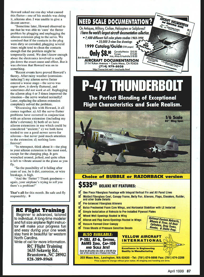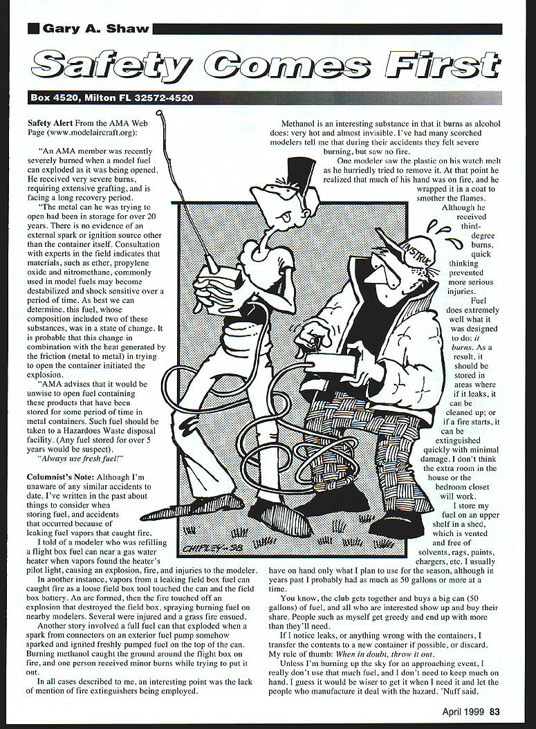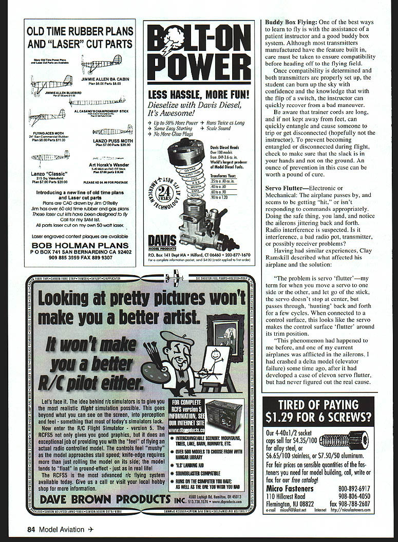 Gary Shaw flLy Safety Alert AMA Web Page wwwmodelaircraftorg An AMA member recently severely burned model fuel can exploded being opened received very severe burns requiring extensive grafting facing long recovery period metal can trying open storage over 20 years no evidence external spark ignition source other container itself Consultation experts field indicates materials such ether propylene oxide nitromethane commonly used model fuels may become destabilized shock sensitive over period time As best can determine fuel composition included two substances state change probable change combination heat generated friction metal metal trying open container initiated explosion AMA advises would unwise open fuel containing products have stored some period time metal containers Such fuel should taken Hazardous Waste disposal facility Any fuel stored over 5 years would suspect Always use fresh fuel Columnists Note Although Im unaware similar accidents date Ive written past about things consider storing fuel accidents d occurred because leaking fuel vapors caught fire told modeler refilling flight box fuel can near gas water heater vapors found heaters pilot light causing explosion fire injuries modeler another instance vapors leaking field box fuel can caught fire loose field box tool touched can field box battery An arc formed fire touched off explosion destroyed field box spraying burning fuel nearby modelers Several injured grass fire ensued Another story involved full fuel can exploded spark connectors exterior fuel pump somehow sparked ignited freshly pumped fuel top can Burning methanol caught ground around flight box fire person received minor burns trying put out cases described interesting point lack mention fire extinguishers being employed Methanol interesting substance burns alcohol does very hot almost invisible Ive scorched modelers tell during accidents felt severe burning saw no fire modeler saw plastic watch melt hurriedly tried remove point realized much hand fire wrapped coat smother flames Although received third ee burns quick thinking prevented serious injuries Fuel does extremely well what designed burns As result should stored areas leaks can cleaned up fire starts can extinguished quickly minimal damage dont think extra room house bedroom closet will work store fuel upper shelf shed vented free solvents rags paints chargers etc usually have hand what plan use season although years past probably much 50 gallons time know club gets together buys big can 50 gallons fuel interested show up buy share People such myself get greedy end up theyll need notice leaks anything wrong containers transfer contents new container possible discard rule thumb doubt throw out Unless Im burning up sky approaching event really dont use much fuel dont need keep much hand guess would wiser get need let people manufacture deal hazard Nuff said April 1999 83 OLD TIME RUBBER PLANS AND LASER CUT PARTS Yoav~ L1 JMMIEAUIII mUEIRD TJ FLYSNOACES MOTh 24 5n CoevwaI Robber P1nOOOO Parts Oil 00 Lanzo Classic 21$ Sq VAOdd PIa $700 Pb $2000 JIMMIE ALLEN BA CABIN P1n 800 P05 $800 Al CASANOS CHAMPIONSHIP STICK 4tflIITEIFL5O LANZO PUSS MOTh Plan $700 Pt $2000 Art Horaks Wander 3-E MAN Sn FAC OT 0108 Plan 0700 part 01500 PtEAS0 AD $4 N FOR POSTAGK Introducing new line old time plans Laser cut parts Plans CAD ckawn Jim OReilly Jim has over 60 old lime rubber gas plans laser cut kits te designed fly Call SAM list pans laser cut own 50 walt laser Laser engraved contest plaques available BOB HOLMAN PLANS P 0 BOX 741 SAN BERNARDINO CA 92402 909 885 3959 FAX 889 9307 Buddy Box Flying best ways learn fly assistance patient instructor good buddy box system Although transmitters manufactured have feature built care must taken ensure compatibility before heading off flying field Once compatibility determined both transmitters properly set up student can burn up sky confidence knowledge flip switch instructor can quickly recover bad maneuver aware trainer cords long kept away feet can quickly entangle cause someone trip get disconnected hopefully instructor prevent becoming entangled disconnected during flight check make sure slack hands ground An ounce prevention case can worth pound cure Servo FlutterElectronic Mechanical airplane passes seems getting hit isnt responding commands appropriately Doing safe thing land notice ailerons jittering back forth Radio interference suspected interference bad radio pot transmitter possibly receiver problems Having similar experiences Clay Ramskill described what affected airplane solution problem servo fluttermy term move servo side other let go stick servo doesnt stop center passes through hunting back forth few cycles connected control surface looks like servo makes control surface flutter around its trim position phenomenon happened before current airplanes afflicted ailerons crashed delta model elevator failure some time ago after developed case elevon servo flutter never figured out real cause fair prices sensible quanlities fas teners need model building call write fax Free catalog Micro Fasteners800-892-6917 110 Hillcrest Road908-806-4050 Flemington NJ 08822fax 908-788-2607 e-mail microf@blaofnef Internelhffp//mkrefasfenerorom 84 Model Aviation OWER LESS HASSLE MORE FUN Dieselize Davis Diesel Its Awesome * Up 50% Power Twice Long Same Easy Starting e Sound No Glow Plugs Davis Diesel Heads Over 100 models 049-36w Worlds largest prodocer Model Diesel Fuels Transforms 25 to 40 Cu 40 to 60 040506t 90 71\YEMl/k.RO5A90 too 12$ 4cHwol c DAVIS P0 Box 141 Dept MA evi CT 06460 877-1670 rCpe$0 Fo rot pocLer errd 54OOcrtdiroppIiedrofirtordel EI\ Uur 4-40x1/2 socket caps sell S435/1 00 alloy steel S665/100 stainless S750/50 aluminum Howard asked day what caused flutterone models doing ailerons also unable give decent answer Sometime later Howard observed able cure flutter problem plugging unplugging aileron extension plug servo surmised contacts plug dirty corroded plugging several time