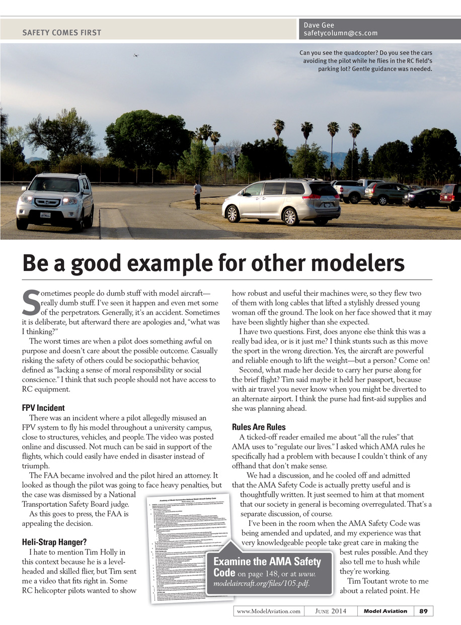 We had a discussion, and he cooled off and admitted that the AMA Safety Code is actually pretty useful and is thoughtfully written. It just seemed to him at that moment that our society in general is becoming overregulated. That’s a separate discussion, of course.