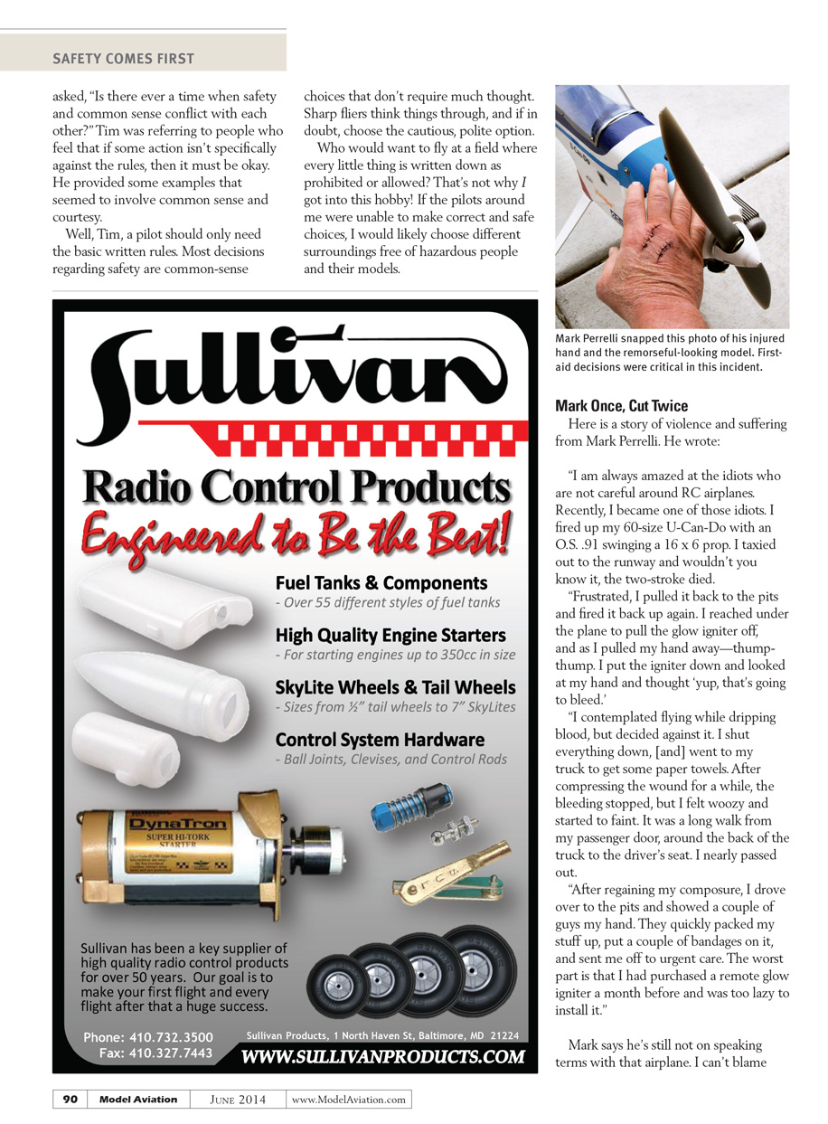 “I am always amazed at the idiots who are not careful around RC airplanes. Recently, I became one of those idiots. I fired up my 60-size U-Can-Do with an O.S. .91 swinging a 16 x 6 prop. I taxied out to the runway and wouldn’t you know it, the two-stroke died. Frustrated, I pulled it back to the pits and fired it back up again. I reached under the plane to pull the glow igniter off, and as I pulled my hand away—thump-thump. I put the igniter down and looked at my hand and thought ‘yup, that’s going to bleed.’