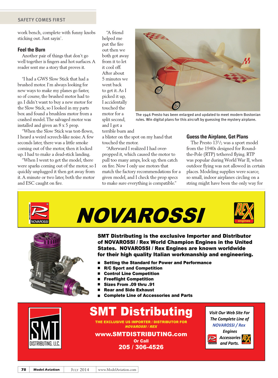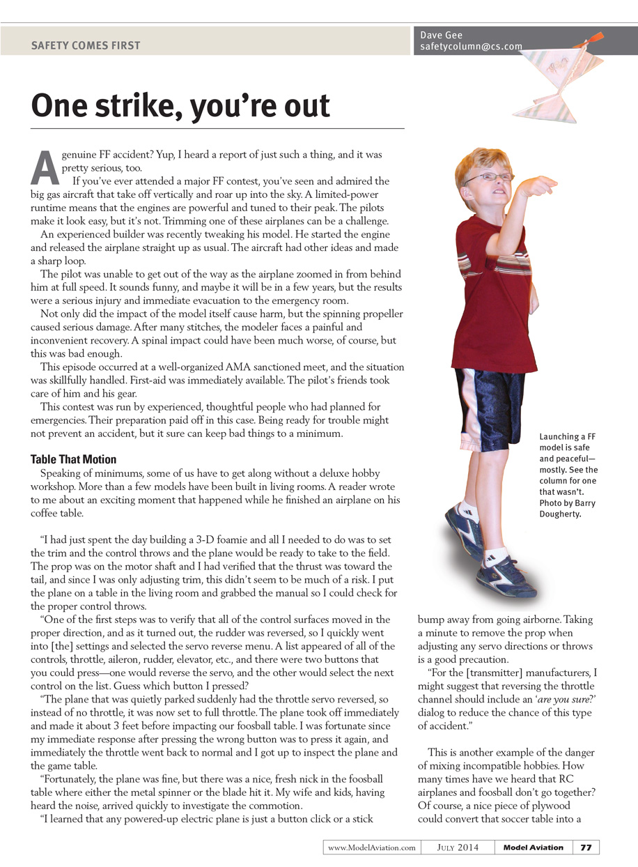 “I learned that any powered-up electric plane is just a button click or a stick bump away from going airborne. Taking a minute to remove the prop when adjusting any servo directions or throws is a good precaution. For the [transmitter] manufacturers, I might suggest that reversing the throttle channel should include an ‘are you sure?’ dialog to reduce the chance of this type of accident.”
