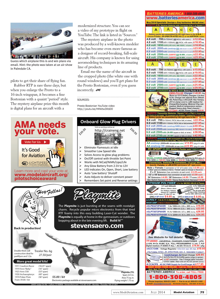 Rubber RTP is rare these days, but when you enlarge the Presto to a 16-inch wingspan, it becomes a fine Bostonian with a quaint “period” style. The mystery airplane prize this month is digital plans for an aircraft with a modernized structure. You can see a video of my prototype in flight on YouTube. The link is listed in “Sources.”