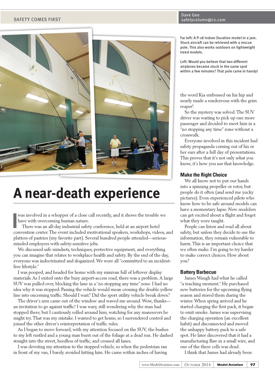 We all know not to put our hands into a spinning propeller or rotor, but people do it often (and send me yucky pictures). Experienced pilots who know how to be safe around models can have a momentary lapse. New modelers can get excited about a flight and forget what they were taught.