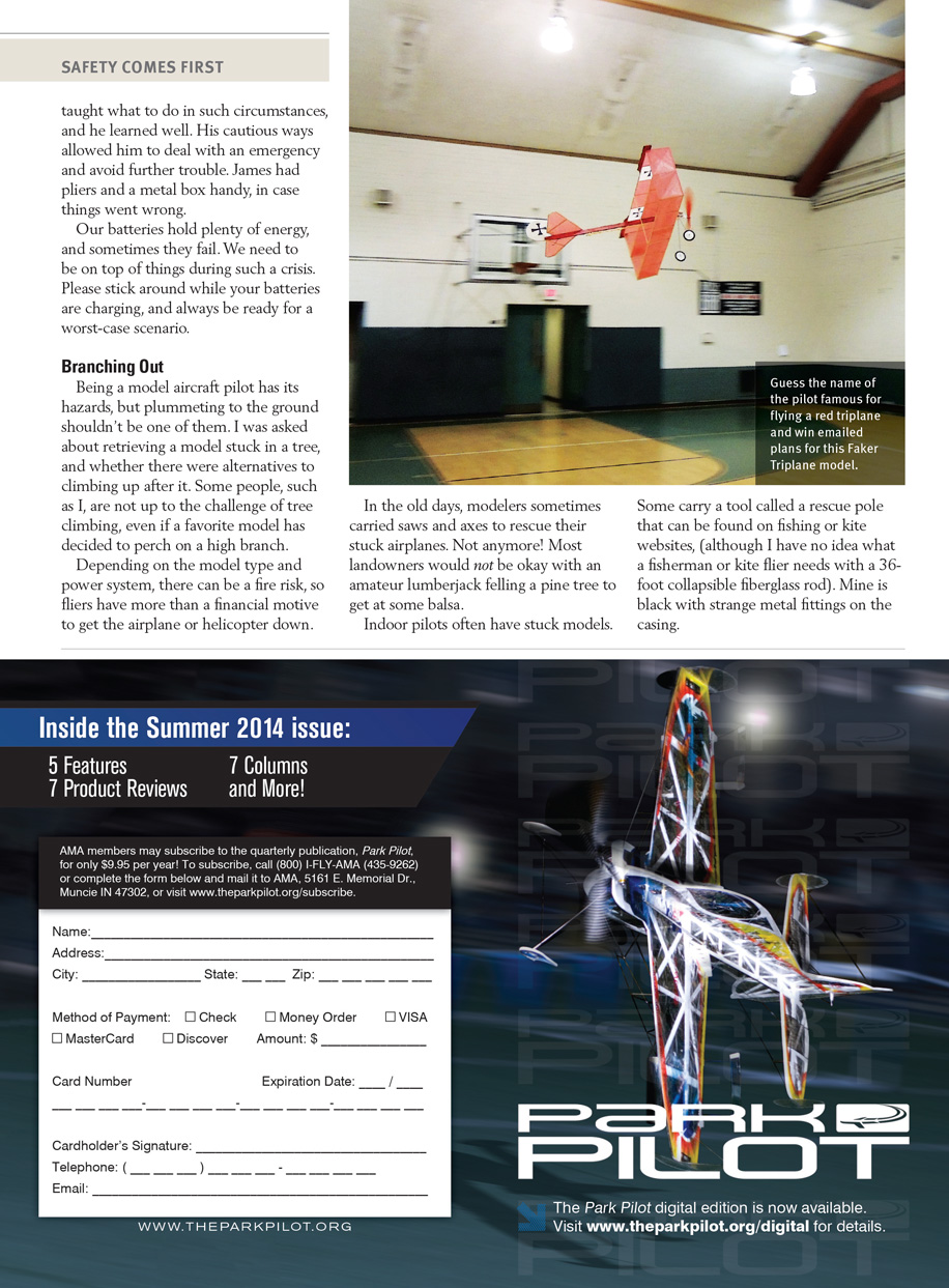 Being a model aircraft pilot has its hazards, but plummeting to the ground shouldn’t be one of them. I was asked about retrieving a model stuck in a tree, and whether there were alternatives to climbing up after it. Some people, like I, are not up to the challenge of tree climbing, even if a favorite model has decided to perch on a high branch. Depending on the model type and power system, there can be a fire risk, so fliers have more than a financial motive to get the airplane or helicopter down.