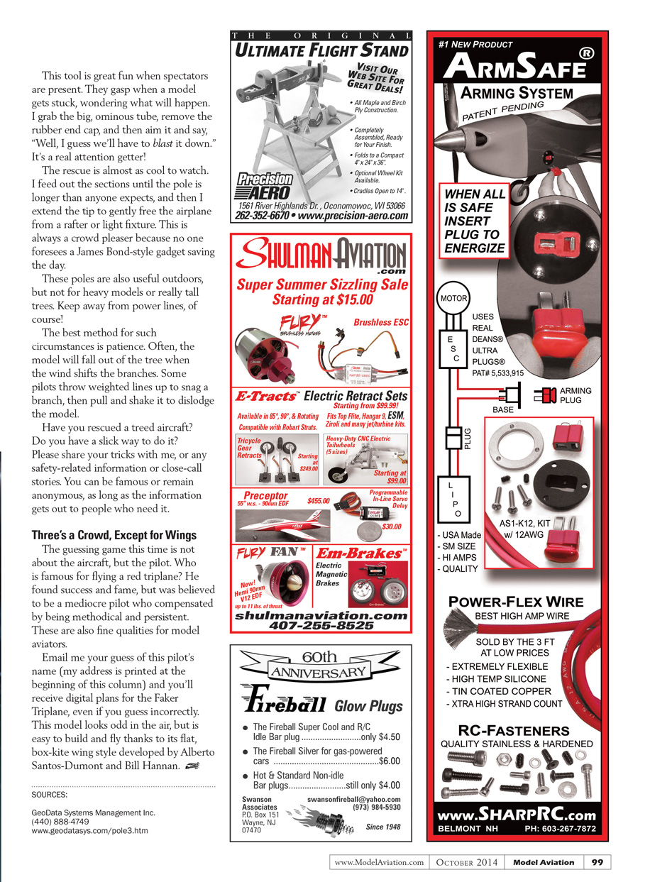 Email me your guess of this pilot’s name (my address is printed at the top of this column) and you’ll receive digital plans for the Faker Triplane, even if you guess incorrectly. This model looks odd in the air, but is easy to build and fly thanks to the flat, box-kite wing style developed by Alberto Santos-Dumont and Bill Hannan.[dingbat]