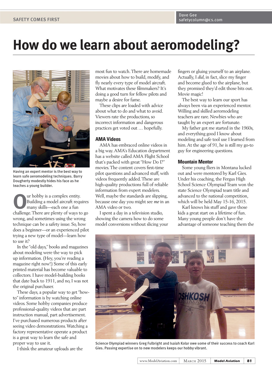 AMA has embraced online videos in a big way. AMA’s Education department has a website called AMA Flight School that’s packed with great “How Do I?” movies. The content covers first-time pilot questions and advanced stuff, with videos frequently added. These are high-quality productions full of reliable information from expert modelers. Well, maybe the standards are slipping, because one day you might see me in an AMA video or two.