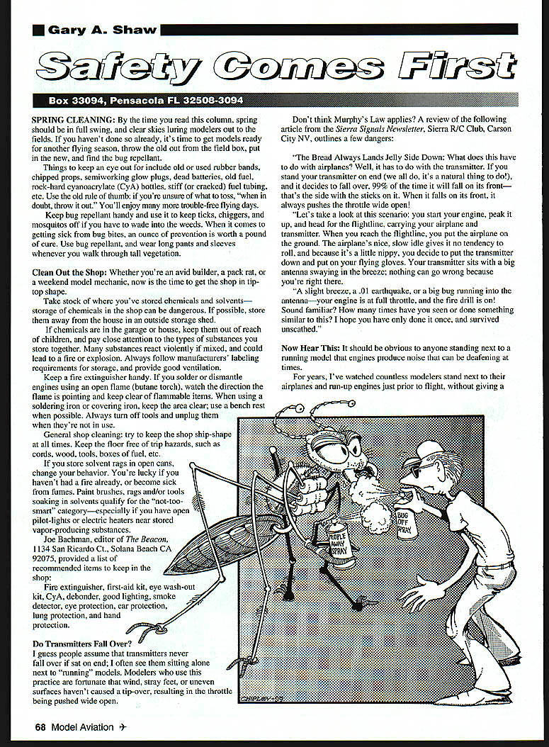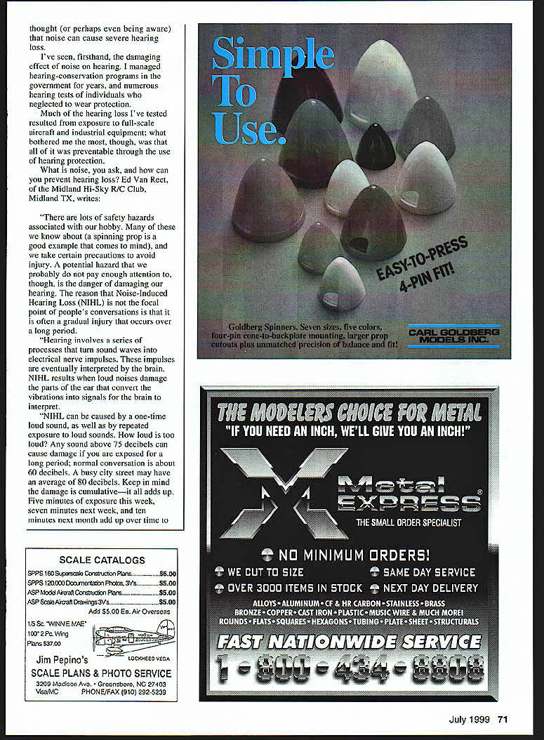 Gary Shaw SPRING CLEANING time read column spring should full swing clear skies luring modelers out fields havent done already its time get models ready another flying season throw old out field box put new find bug repellant Things keep eye out include old used rubber bands chipped props semiworking glow plugs dead batteries old fuel rock-hard cyanoacrylate CyA bottles stiff cracked fuel tubing etc Use old rule thumb youre unsure what toss doubt throw out Youll enjoy trouble-free flying days Keep bug repellant handy use keep ticks chiggers mosquitos off have wade weeds comes getting sick bug bites ounce prevention worth pound cure Use bug repellant wear long pants sleeves whenever walk through tall vegetation Clean Out Shop Whether youre avid builder pack rat weekend model mechanic now time get shop tip top shape Take stock youve stored chemicals solvents storage chemicals shop can dangerous possible store away house outside storage shed chemicals garage house keep out reach children pay close attention types substances store together substances react violently mixed could lead fire explosion Always follow manufacturers labeling requirements storage provide good ventilation Keep fire extinguisher handy solder dismantle engines using open flame butane torch watch direction flame pointing keep clear flammable items using soldering iron covering iron keep area clear use bench rest possible Always turn off tools unplug theyre use Dont think Murphys Law applies review following article Sierra Signals Newsletter Sierra R/C Club Carson City NV outlines few dangers Bread Always Lands Jelly Side Down What does have airplanes Well has transmitter stand transmitter end its natural thing decides fall over 99% time will fall its front thats side sticks falls its front always pushes throttle wide open Lets take look scenario start engine peak up head flightline carrying airplane transmitter reach flightline put airplane ground airplanes nice slow idle gives no tendency roll because its little nippy decide put transmitter down put flying gloves transmitter sits big antenna swaying breeze nothing can go wrong because youre right slight breeze 01 earthquake big bug running antennayour engine full throttle fire drill Sound familiar times have seen done something similar hope have done once survived unscathed Now Hear should obvious anyone standing next running model engines produce noise can deafening times years Ive watched countless modelers stand next airplanes run-up engines just prior flight giving General shop cleaning try keep shop ship-shap times Keep floor free trip hazards such cords wood tools boxes fuel etc store solvent rags open cans change behavior Youre lucky havent fire already become sick fumes Paint brushes rags and/or tools soaking solvents qualify not-toosmart categoryespecially have open pilot-lights electric heaters near stored vapor-producing substances Bachman editor Beacon 1134 San Ricardo Ct. Solana Beach CA 92075 provided list recommended items keep shop Fire extinguisher first-aid kit eye wash-out kit CyA debonder good lighting smoke detector eye protection ear protection lung protection hand protection Transmitters Fall Over guess people assume transmitters never. fall over sat end often see sitting alone next running models Modelers use practice fortunate wind stray feet uneven surfaces havent caused tip-over resulting throttl being pushed wide open 68 Model Aviation ght perhaps being aware noise can cause severe hearing loss Ive seen firsthand damaging effect noise hearing managed hearing-conservation programs government years numerous hearing tests individuals neglected wear protection Much hearing loss Ive tested resulted exposure full-scale aircraft industrial equipment what bothered though was preventable through use hearing protection What noise ask can prevent hearing loss Ed Van Reet Midland Hi-Sky RIC Club Midland TX writes lots safety hazards associated hobby know about spinning prop good example comes mind take certain precautions avoid injury potential hazard probably pay enough attention though danger damaging hearing reason Noise-Induced Hearing Loss NIHL focal point peoples conversations often gradual injury occurs over long period Hearing involves series processes turn sound waves electrical nerve impulses impulses eventually interpreted brain NIHL results loud noises damage parts ear convert vibrations signals brain interpret NIHL can caused one-time loud sound well repeated exposure loud sounds loud too loud Any sound above 75 decibels can cause damage exposed long period normal conversation about 60 decibels busy city street may have average 80 decibels Keep mind damage cumulativeit adds up Five minutes exposure week seven minutes next week ten minutes next month add up over time SCALE CATALOGS SPPS 160 Superscaie Constxucon Plans$500 SPPS 1200 Docunerflaljcn Phot 3Vs$500 ASP Model Adraaft Cons5ucon Plans$500 ASP Scale Afroetl Drawings 3Vs$500 Add $500 Es Air Overseas 1/5 Sc WINNIE MAE 1002Pc Wing Ir.r fl $ ad ISUZV2VS.~ Plans $3700 Jim PepinosLOCKHEED VEGA SCALE PLANS & PHOTO SERVICE 3209 Madison Ave Greensboro NC 27403 VisMCPHONE/FAX 9101 2925239 July 1999 71 cause irreparable damage hearing Exposure very loud noises 120 decibels like gunfire firecrackers some types power tools some model airplane engines can cause immediate damage Some symptoms NIHL include ringing buzzing both ears trouble hearing people talk distorted muffled sounds could signs hearing deteriorating Did know about one-third hearing disorders have affected noise good news about NIHL can prevented Some simple steps include knowing loud noises can cause damage wearing ear protection involved loud activities protecting young children loud noises until old enough protect themselves Thats month Hope use ear plugs muffs next time youre fieldyour family friends will glad did youre wondering obtain appropriate hearing-protection devices consult audiologist area physician neither available tak