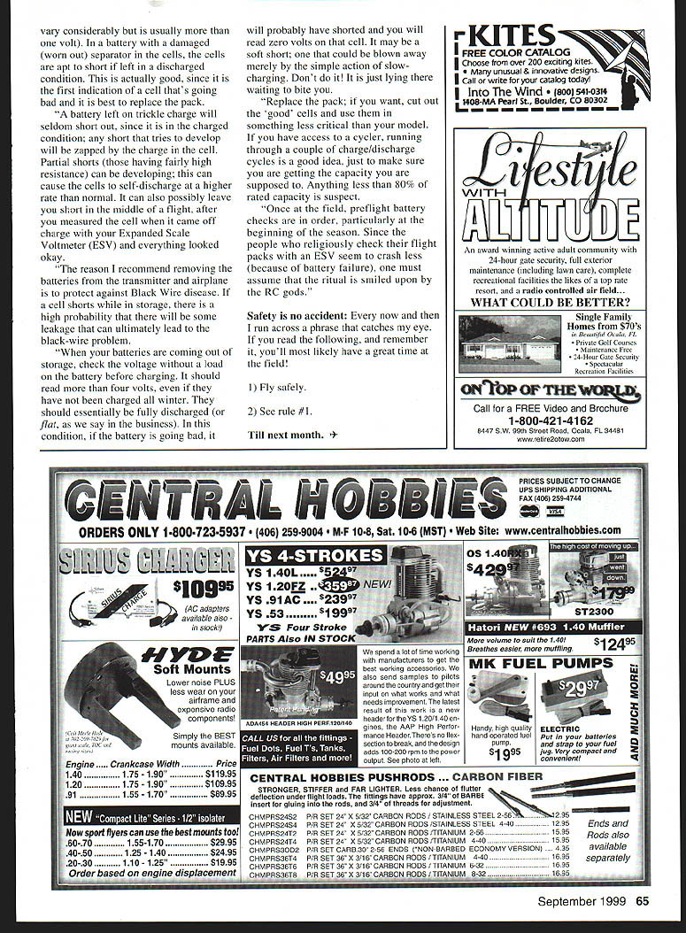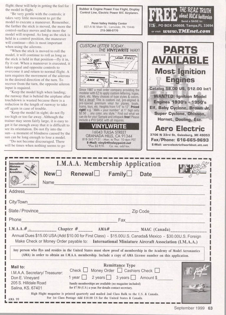 U Gary Shaw CHECK IT OUT Ive modeling years wasnt until began fullscale flying tbat learned appreciate purpose using checklists full-scale flying checklists used ensure pilots conduct review aircraft systems and/or procedures prior flight Using manner almost always guarantees airworthy aircraft anything deemed meeting standards during preflight general terms either gets fixed airplane doesnt go air nice would modelers followed same path taught similar values newcomers Although use checklists recognized necessary full-scale ensure safe flying modeling its experience unless checklists found newsletters magazines columns general review its rare find someone actually using field Maybe thats because doesnt take modelers long get procedure down because fly different types aircraft think need numerous lists overwhelming too timeconsuming Whatever reason stick hobby length time youve just started youll definitely benefit use list scanning Radio Control RC links Internet clicked list Chester County PA RC Club can help get started Feel free modify own situation use field Think Preflight Checklist walk-around check done full-scale aircraft Propeller a Nicks cracks b Tight prop nut spinner hub Engine a Engine mount tight b Muffler mount tight c Secure throttle hookup Fuel Tank a Check fuel line splits holes b Foam used around tank dry Landing Gear a Nose wheel main gear secure b Axles wheel collars secure c Nose wheel steering hookup Fuselage a Cracks breaks b Tail section secure fuselage c Wing dowels bolts secure d Firewall integrity Vertical Fin/Rudder a Cracks breaks b Hinges devises horns c Pushrod slop/keepers Wing a Cracks breaks especially center section b Hinges c Aileron servo hookup secure d Aileron servo tight Radio Check a No loose servo/battery wires b Plugs tight c Battery pack secure d Servos servo rail secure fuselage e Clevises servo wheels/arms secure Engine Running/Radio Operation Bubbles around glow plug head bolts muffler needle valve b Bubbles fuel line c Control surfaces move smoothly full throttle . glitches New Student Hints Tips reviewing Official Newsletter Greenville Flying Pirates Model Aircraft Club read paragraph explained what behavior expect airplane during its first flight remember first flight during after release [hand launching] airplane covered entire sky like party balloon losing air prior crashing heap end ball field days much sophistication [money] lost although safety people gathered around factor loss model took significant time build Horizontal Stabilizer/Elevatorcover paper Cracks breaksIve always believer passing b Hinges devises hornsknowledge make learning easier c Pushrod slop/keepers prevent mishaps [mistakes] perhaps review following order AT ~/There few things tudent pilot Q Pfpreparing lWflJ r7 - . Model Aviation ht will help getting feel model flight very gentle controls takes very little movement get model execute maneuver Remember farther stick moved the control-surface moves the model will respond As long stick held control position maneuver will continuethis important using ailerons stick moved roll model will continue roll long stick held positionfly fly out maneuver executed takes equal opposite controls overcome return normal flight turn requires movement ailerons desired direction turn recover turn opposite aileron input required Keep model high landing runway behind airplane after touchdown wasted because reduction length runway take off again case trouble Keep model sight fly too high too far away Although trainer may seem fairly large easy get far enough away difficult see its orientation fly suna moment blindness caused sun can long enough lose model become discouraged will times nothing seems go IIMAA Membership Application NewEl Renewal LI FamilyLl Date________ Name I Address City/Town State/ Province_________________ Zip Code__________ I Phone_______________________________________________________[v33][b9172224;114719120]]Fax____________________________________ _____________________[v33][b20292228114819150]]I IMAA#Chapter #AMA#MAAC Canada Annual Dues $1500 USA Add $1000 First Class $15OOUS Canada& Mexico $30OOUS Foreign j Make Check Money Order payable International Miniature Aircraft Association IMAA Any person flys resides United States must show proof membership Academy Model Aeronautics AMA order obtain LMAA membership Include copy AMA License number application Mail toRemittance Type IMAA Secretary/Treasurer Check D Money Order LI Cashiers Check LI Don E Vineyard1 year LI 2 years LI 3 years LI Amount $_______ 205 5 HilIdale Road Family memberships available no magazine included Sauna KS 67401 for $750 US year details contact secretary I High Flight magazine printed quarterly mailed 2nd Class Bulk US & Canada AMA 99 1st Class Postage Add $1000 US United States & Canada September 1999 63 Rubber & Engine Power Free Flight Display Control Line Electric Power R/C Airplanes Penn Valley Hobby Center 837A W Main St Lansdale PA 19446 215-368-0770 Horn Aero Electric 3706 N 33rd St Galesburg Ml 49053 Fax/Phone 616-665-9693 E-Mail aero-electricwarldnet att net f ON OWEN LESS HASSLE MORE FUN Dieselize Davis Diesel Its Awesome 4- Up 50% Power Twice Long 4- Same Easy Starting 4- Scale Sound 4- No Glow Plugs OSOeSO YeaR/OR faiN 5ROYAL AL DAVIS MOU PUflK8 P0 Box 141 DOpCMA MlfordC706460 877-1670 Apoend 5400 bred/I opplied f/rot ordotl Davis Diesel Heads Over itO models 049-36 015 Worlds largest producer Model Diesel Fuels Transforms 25 tee 40 cv 40 toe 60 60 toe 90 90 toe 20 right maneuver results near-catastrophe Everyone flies RC models has through learning flydo give up next sessson will better panic maneuver goes wrong take time necessary recover mistake Panic will cause student overcontrol attempt recover cause condition worsen opposite direction Although instructor may seem casual observer standing side student will watching will take over get model dangerous situation Storing Ni-Cd Packs Although usually put piece column end flying sea