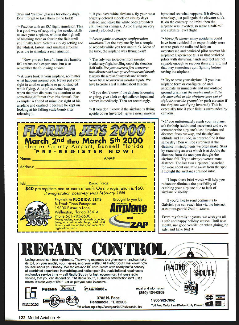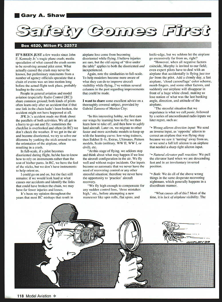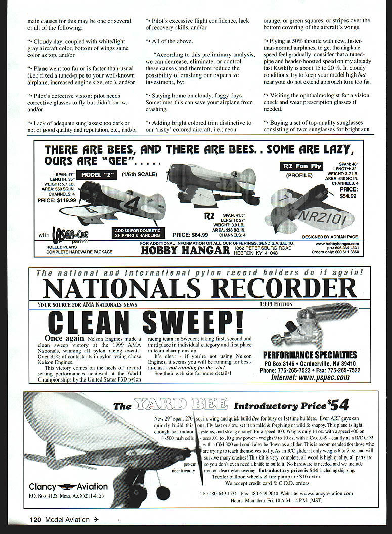 Gary Shaw BEEN JUST few weeks since John F Kennedy Jrs tragic plane crash media speculation what caused crash seems revolving around pilot error What actually caused crash may never known preliminary statements number agency officials speculate chain events set motion long before actual flight took place probably leading crash People general aviation model aviation especially Radio Control [RC] share common ground both kinds pilots often learn after accident that link chain hadnt broken accident might have happened JFK Jrs accident made think about parallels both activities get huny go out fly sometimes checklist overlooked often RC dont check weather get air become disoriented try solve dilemma yanking stick around see orientation airplane often resulting crash full-scale pilot becomes disoriented during flight he/she has know rely instruments rather seat his/her pants RC have feel sticks dont have instruments help orient us could go on fact still remains would look hard what causes accidents identify links could have broken chain may have far fewer injuries losses Its opinion throughout years RC mishaps result airplane loss come becoming disoriented flying believe injuries rare old saying dive under table applies both disoriented inexperienced Again note similarities full-scale help modelers become aware what can improve aircraft visibility flying Ive written several columns past regarding improvements could made want share some excellent advice thoroughly covered subject provided Gabriel Zamora Mexico City interesting hobby first earn wings learning fly learn take off safely land aircraft Later migrate other faster acrobatic models keep up learning curve low-wing trainers Sukhoi B-4s Extras Ultimates Pattern models Scale military WW II WW civil etc stage flying seldom stop think about what may happen lose aircraft configuration air fly well major incidents inputs become automatic never have need recovering control other stressful situation therefore never have opportunity practice aircraft recovery fly high enough compensate sudden control loss three mistakes high etc before attempting new maneuver like spin rolls flat spins knife-edge seldom let airplane go excessively far us right However negative factors coincide Murphy invited field expert pilots have deal airplane accidentally flying just too far pilot Add cloudy day fast airplane cloud camouflage color scheme numb fingers some other factors suddenly airplane will disappear front huge white cloud making us lose notion what last banking angle direction attitude airplane stressful situation experience what call panic followed series uncoordinated radio inputs later regret such g aileron direction input send inverse input opposite aileron correct airplane flying okay because saw turning away us send full left aileron airplane needed sharp right aileron input ral elevator pull reaction pull elevator hard descending fast involuntary inverted position Both above wrong things same desperate recovering nightmare generally happens disordinate manner What causes Most time lack airplane visibiliiy 118 Model Aviation causes may several following dy day coupled white/light gray aircraft color bottom wings same color top and/or Plane went too far faster-than-usual ie fixed tuned-pipe well-known airplane increased engine size etc and/or Pilots defective vision pilot needs corrective glasses fly didnt know and/or Lack adequate sunglasses too dark good quality reputation etc and/or ts excessive flight confidence lack recovery skills and/or e According preliminary analysis can decrease eliminate control causes therefore reduce possibility crashing expensive investment ing home cloudy foggy days Sometimes can save airplane crashing ng bright colored trim distinctive risky colored aircraft ie neon orange green squares stripes over bottom covering aircrafts wings ng 50% throttle new fasterthan-normal airplanes get airplane speed feel gradually consider tunedpipe header-boosted speed already fast Kwikfly about 15 20 % cloudy conditions try keep model high near extend approach turn too far ting ophthalmologist vision check wear prescription glasses needed ng set top-quality sunglasses consisting two sunglasses bright sun THERE ARE BEES AND THERE ARE BEES. SOME ARE LAZY OURS ARE DEE.. SPAN 57 1/5th SCALE LENGTH 35 WEIGHT 57 LB AREA 550 SOIN CHANNELS 4 PRICE $11999 IiSER rJaS U ROLLED PLANS COMPLETE HARDWARE PACKAGE FOR ADDITIONAL INFORMAllON ON ALL OUR OFFERINGS SEND SASE TO HOBBY HANGAR 1862 PETERSBURG ROAD national international pylon record holders again NATIONALS RECORDER YOUR SOURCE FOR AMA NATIONALS NEWS CLEAN SWEEP Once again Nelson Engines made racing team Sweden taking first second clean sweep victory 1999 AMA third place individual category first place Nationals winning pylon racing events team championship Over 95% contestants pylon racing chose Its clear youre using Nelson PERFORMANCE SPECIALTIES Nelson EnginesEngines seems will running best-PG Box 3146 nerville NV 89410 victory comes heels record in-class running win Phone 775-265-7523 775-265-7522 setting performances achieved World See web site details Internet wwwpspec cam Championships United States F3D pylon WMIID oductory prce54 New 29 span 270 sq wing quick build Bee busy isi time builders ARE guys can quickly build Fly fast slow set up mild & forgiving wild & snappy plane light enough indoor systems strong enough speed 400 Weighs 14 oz speed 400 8-500 mab cells - uses 01 10 glow power weighs 9 10 oz Cox 049 can fly R/C C02 GM 300 could also flown glider recommended trying teach themselves fly As RIC glider weighs 6 7 oz will survive crashes kit very complete wood high quality parts pre-cut dont need knife build No hardware needed include user friendly iron-on clearmylarcovering Introductory price $44 including shipping Trexler balloon wheels & tire pump $10 extra accept credit card & COD orders Tel 480-649 1534 Fax 480-649 9040 Web site wwwclancyaviationcom Hours Mon thin Fri 10AM -