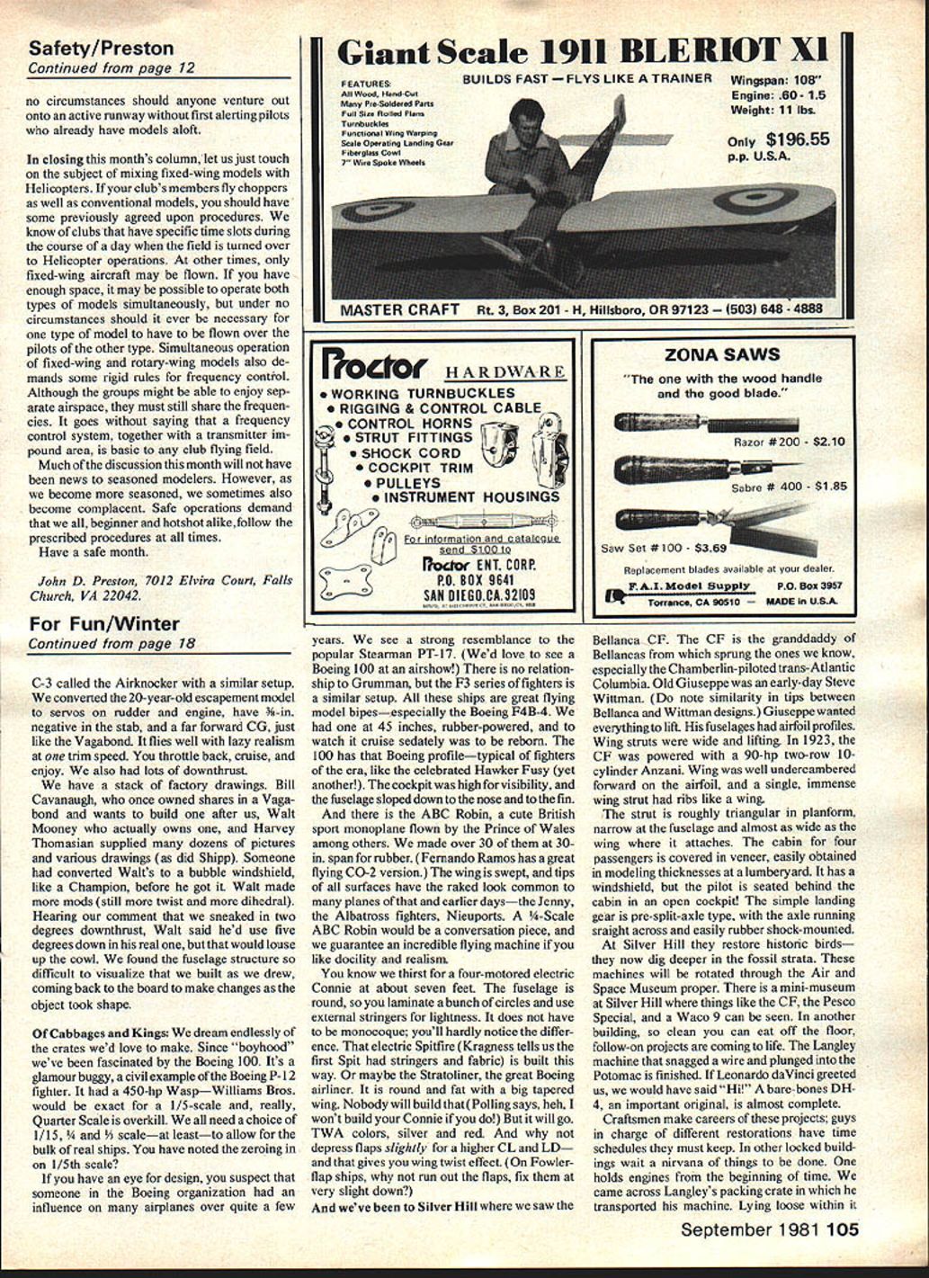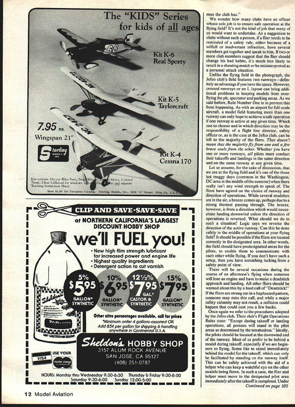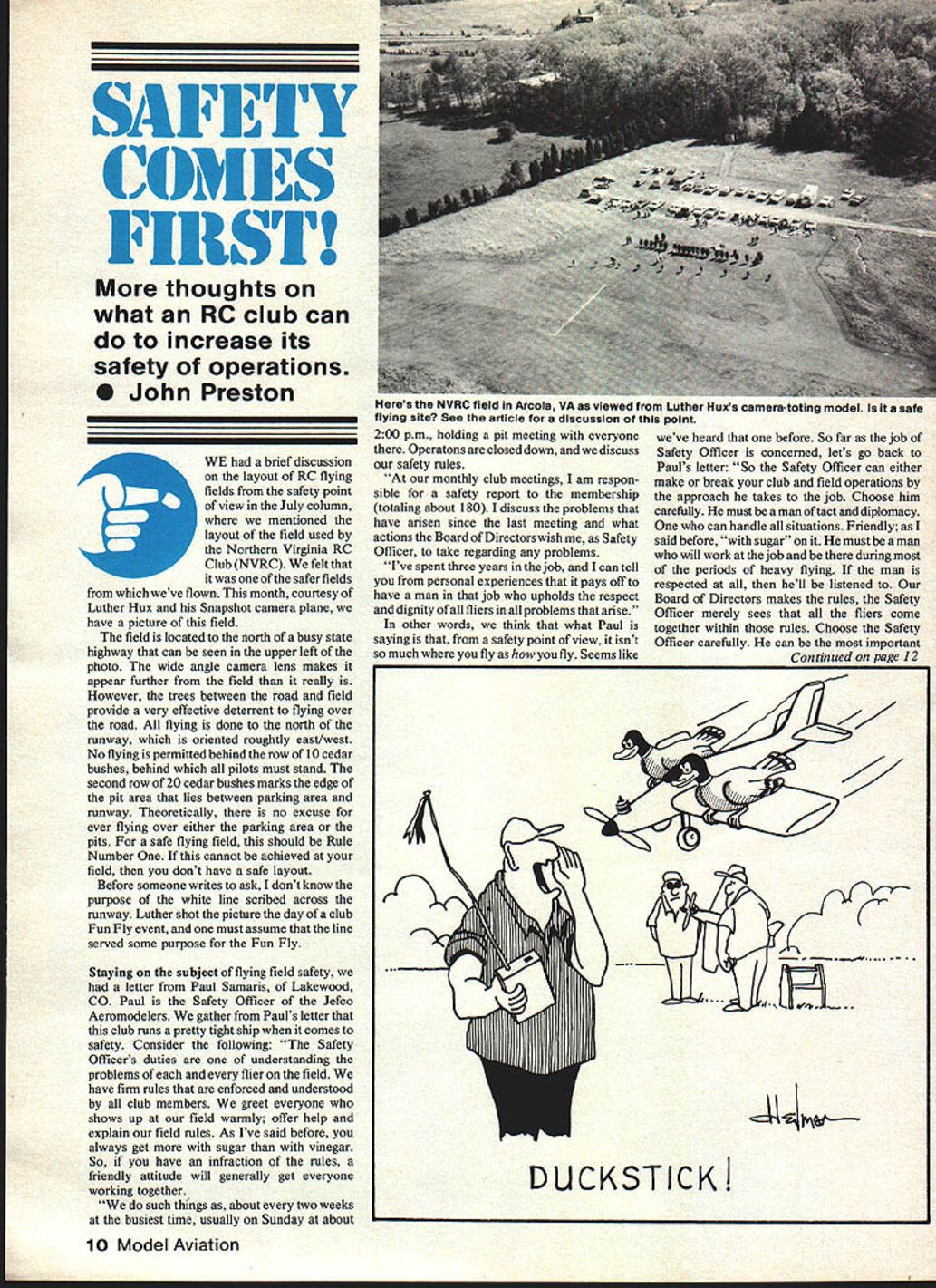 1tILI1 COMES FIRST thoughts what RC club can increase its safety operations S John Preston WE brief discussion layout RC flying fields safety point view July column mentioned layout field used Northern Virginia RC Club NVRC felt safer fields weve flown month courtesy Luther Hux Snapshot camera plane have picture field field located north busy state highway can seen upper left photo wide angle camera lens makes appear further field really However trees between road field provide very effective deterrent flying over road flying done north runway oriented roughtly east/west No flying permitted behind row 10 cedar bushes behind pilots must stand second row 20 cedar bushes marks edge pit area lies between parking area runway Theoretically no excuse ever flying over either parking area pits safe flying field should Rule Number cannot achieved field dont have safe layout Before someone writes ask dont know purpose white line scribed across runway Luther shot picture day club Fun Fly event must assume line served some purpose Fun Fly Staying subject flying field safety letter Paul Samaris Lakewood CO Paul Safety Officer Jefco Aeromodelers gather Pauls letter club runs pretty tight ship comes safety Consider following Safety Officers duties understanding problems flier field have firm rules enforced understood club members greet everyone shows up field warmly offer help explain field rules As Ive said before always get sugar vinegar So have infraction rules friendly attitude will generally get everyone working together such things about two weeks busiest time usually Sunday about 200 pm holding pit meeting everyone Operatons closed down discuss safety rules monthly club meetings am respon sible safety report membership totaling about 180 discuss problems have arisen since last meeting what actions Board Directors wish Safety Officer take regarding problems Ive spent three years job can tell personal experiences pays off have man job upholds respect dignity fliers problems arise other words think what Paul saying safety point view isnt much fly fly Seems like weve heard before So far job Safety Officer concerned lets go back Pauls letter So Safety Officer can either make break club field operations approach takes job Choose him carefully must man tact diplomacy can handle situations Friendly said before sugar must man will work job during periods heavy flying man respected hell listened Board Directors makes rules Safety Officer merely sees fliers come together within rules Choose Safety Officer carefully can important Continued page 12 10 Model Aviation neros tne NVHt tiela Arcota VA viewed Luther Huxs camera-toting model safe flying site See article discussion point DUCKSTICK Iat NORTHERN CAUFORNIAS LARGEST1 IDISCOUNT HOBBY SHOPI I well FUELyou New high film strength lubricantU increased power engine lifeI Highest aualily ingredientsI Ii Deteiaction cut varnish I II II II II II II II II II II IHOURS Monday thru Wednesday 930-630 Thursday & Friday 930-800I L - -- S~uay9300 Sunday 1200-500J man club has wonder clubs have officer sole job ensure safe operation flying field Its kind job us would want undertake As suggestion clubs such person flier needs reminded safety rule either because wilfull inadvertant infraction have several members get together speak him two club members suggest flier should change bad habits its much less likely result shouting match misinterpreted personal attack situation Unlike flying field photograph Jefco clubs field features two runwaysdefin itely advantage have space However crossed runways L layout can bring addi tional problems keeping models overflying pit spectator parking areas As said before Rule Number prevent happening As airport full-scale aircraft model field featuring runway can hope achieve safe operation runway active given time Which choose direction may responsibility flight line director safety officer case Jefco club can left majority fliers doesnt mean majority fly afew brave souls other Whether have runways pilots must conduct takeoffs landings same direction same runway given time Let us assume sake discussion flying field its hot muggy days common Washington DC area middle sumemr really isnt wind strength speak fliers have agreed choice runway direction operations several modelers air breeze comes up perhaps due strong thermal passing through breeze however direction would neces sitate landing downwind unless direction operations reversed What should such situation Logic says reverse direction active runway Can done safely middle operations flying field should possible fliers located correctly designated area other words field should have predesignated areas pilots enable communicate other flying dont have such setup have something lacking safety point view will several occasions during course afternoons flying someone will lose engine have make deadstick approach landing other fliers should warned about loud call ofDeadstick fliers strung out haphazard pattern someone may miss call major safety calamity may result collision could happen could cost few bucks Once again refer procedures adopted Jefco club clubs Flight Operations Rules state Except during takeoff landing operations persons will stand pilot areas determined tetrahedron Ideally pilots should located downwind end runway Most us prefer behind model during takeoff especially begin ners flying Some like stand immediately behind model takeoff can facilitated standing runway itself can safely achieved aid helper can keep watchful eye other models being flown such case flier helper must move designated pilot area immediately after takeoff completed Under Continued page 105 1 2 Model Aviation Safety/Preston Continued page 12 no circumstances should anyone venture out onto active runway first alerting pilots already have models aloft closing months column let us just touch subject mixing fixed-wing models Helicopters clubs members fly choppers well conventional models should have some previou