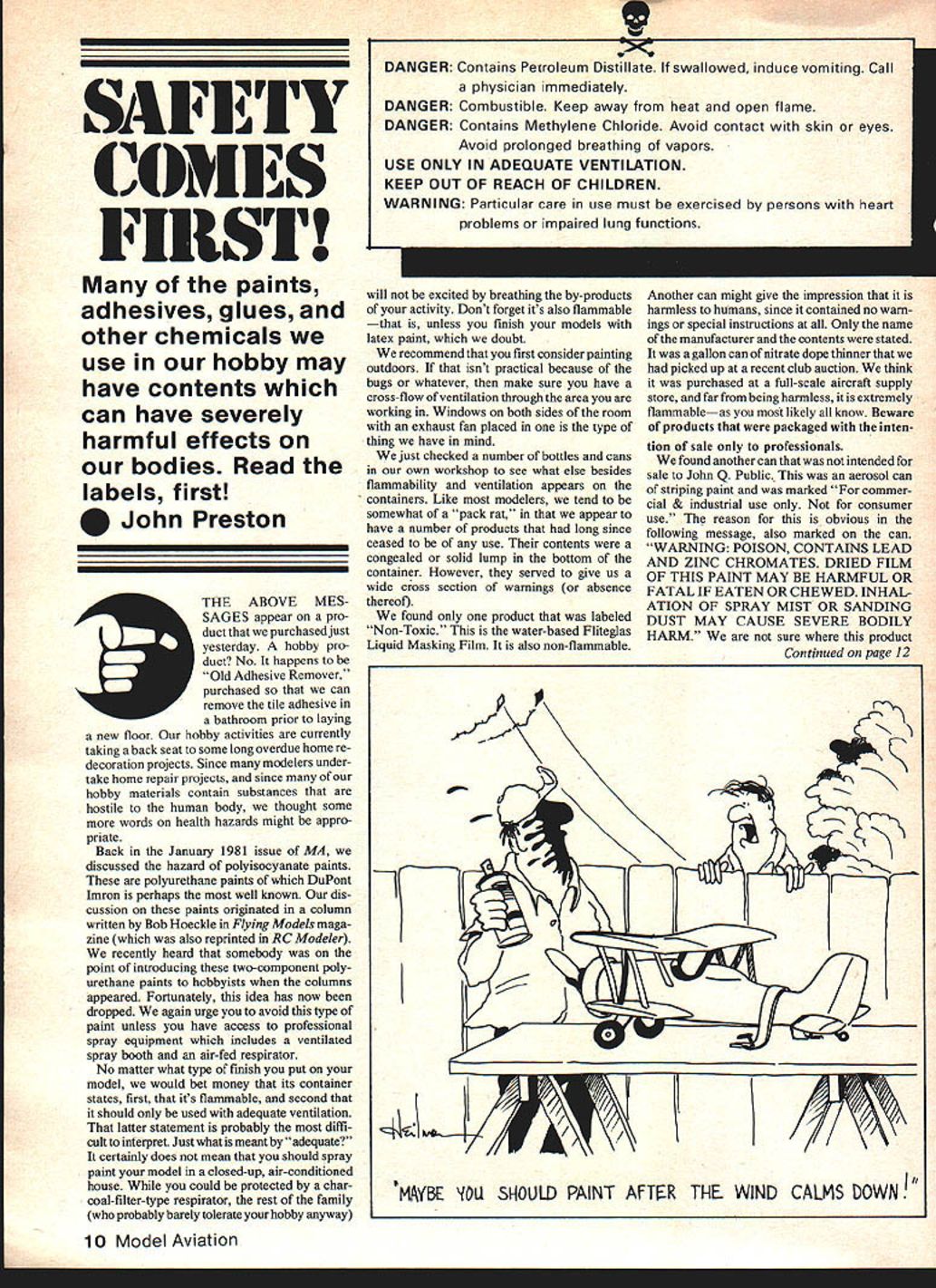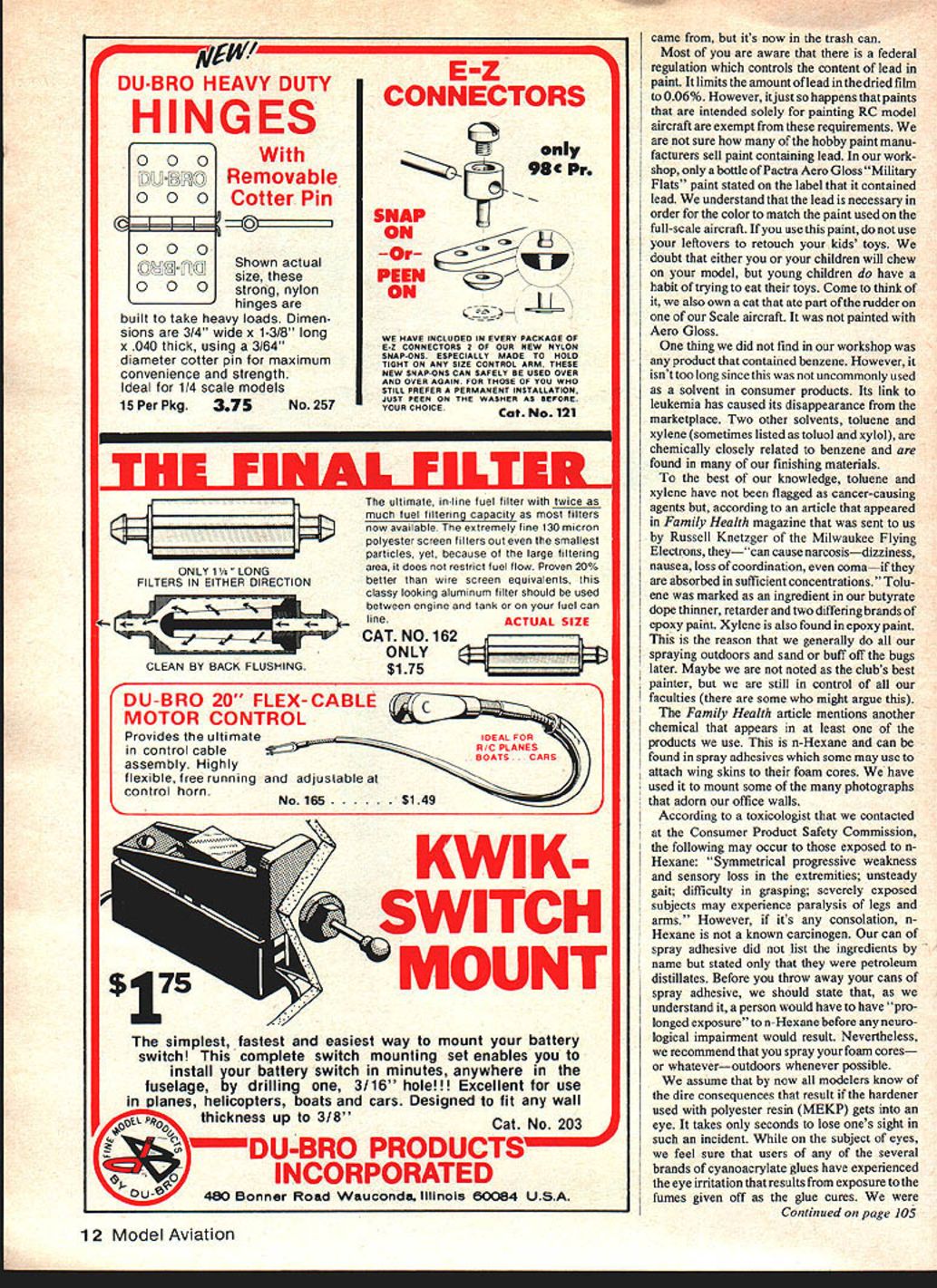 SAFElY COMES FIRST paints adhesives glues other chemicals use hobby may have contents can have severely harmful effects bodies Read labels first John Preston THE ABOVE MES SAGES appear pro duct purchased just yesterday hobby pro duct No happens Old Adhesive Remover purchased can remove tile adhesive bathroom prior laying new floor hobby activities currently taking back seat some long overdue home re decoration projects Since modelers under take home repair projects since hobby materials contain substances hostile human body thought some words health hazards might appro priate Back January 1981 issue MA discussed hazard polyisocyanate paints polyurethane paints DuPont Imron perhaps well known dis cussion paints originated column written Bob Hoeckle Flying Models maga zine also reprinted RC Modeler recently heard somebody point introducing twocomponent poly urethane paints hobbyists columns appeared Fortunately idea has now dropped again urge avoid type paint unless have access professional spray equipment includes ventilated spray booth air-fed respirator No matter what type finish put model would bet money its container states first its flammable second should used adequate ventilation latter statement probably diffi cult interpret Just what meant adequate certainly does mean should spray paint model closed-up air-conditioned house could protected char coal-filter-type respirator rest family probably barely tolerate hobby anyway DANGER Contains Petroleum Distillate swallowed induce vomiting Call physician immediately DANGER Combustible Keep away heat open flame DANGER Contains Methylene Chloride Avoid contact skin eyes Avoid prolonged breathing vapors USE ONLY IN ADEQUATE VENTILATION KEEP OUT OF REACH OF CHILDREN WARNING Particular care use must exercised persons heart problems impaired lung functions will excited breathing by-products activity Dont forget its also flammable unless finish models latex paint doubt recommend first consider painting outdoors isnt practical because bugs whatever make sure have cross-flow ventilation through area working Windows both sides room exhaust fan placed type thing have mind just checked number bottles cans own workshop see what else besides flammability ventilation appears containers Like modelers tend somewhat pack rat appear have number products long since ceased use contents congealed solid lump bottom container However served give us wide cross section warnings absence thereof found product labeled Non-Toxic water-based Flitegias Liquid Masking Film also non-flammable Another can might give impression harmless humans since contained no warn ings special instructions Only name manufacturer contents stated gallon can nitrate dope thinner picked up recent club auction think purchased full-scale aircraft supply store far being harmless extremely flammableas likely know Beware products packaged listen tion sale professionals found another can intended sale John Q Public aerosol can striping paint marked commer cial & industrial use consumer use reason obvious following message also marked can WARNING POISON CONTAINS LEAD AND ZINC CHROMATES DRIED FILM OF THIS PAINT MAY BE HARMFUL OR FATAL IF EATEN OR CHEWED INHAL ATION OF SPRAY MIST OR SANDING DUST MAY CAUSE SEVERE BODILY HARM sure product Continued page 12 -7 // / /1 MAYBE iOU SHOULD PAINT AFTER THE WIND CALMS DOWN 10 Model Aviation uuvb DUBRO HEAVY DUTY HINGES 000 000 000 KTi II]Shown actual size 0 0 0strong nylon hinges built take heavy loads Dimen sions 3/4 wide x 1-3/8 long x 040 thick using 3/64 diameter cotter pin maximum convenience strength Ideal 1/4 scale models 15 Per Pkg 375No257 Removable Cotter Pin E-Z CONNECTORS SNAP ON -Or PEEN ON 98c Pr zv ~3- WE HAVE INCLUDED IN EVERY PACKAGE OF E-Z CONNECTORS 2 OF OUR NEW NYLON SNAP-ONS ESPECIALLY MADE TO HOLD TIGHT ON ANY SIZE CONTROL ARM THESE NEW SNAP-ONS CAN SAFELY BE USED OVER AND OVER AGAIN FOR THOSE OF YOU WHO STILL PREFER PERMANENT INSTALLATION JUST PEEN ON THEWASHER AS BEFORE YOUR CHOICECat No 121 THE FINAL FILTR p ON LY 11/4 FILTERS IN EITHER DIRECTION CLEAN BY BACK FLUSHING ultimate in-line fuel filter twice much fuel filtering capacity filters now available extremely fine 130 micron polyester screen filters out smallest particles yet because large filtering ares does restrict fuel flow Proven 20% better wire screen equivalents classy looking aluminum filter should used between engine lank fuel can lineACTUAL SIZE CAT NO 162 ONLY $175 DU-BRO 20 FLEX-CABLE TOR CONTROL Provides ultimate control cable assembly Highly flexible free running adjuslable control horn KWIK SWITCH T simplest fastest easiest way mount battery switch complete switch mounting set enables install battery switch minutes anywhere fuselage drilling 3/16 hole Excellent use olanes helicopters boats cars Designed fit wall thickness up 318 RO PRODUCTS INCORPORATED Bonner Road Wauconda Illinois 60084 U S came its now trash can Most aware federal regulation controls content lead paint limits amount lead dried film 006% However itjust happens paints intended solely painting RC model aircraft exempt requirements sure hobby paint manu facturers sell paint containing lead work shop bottle Pactra Aero Gloss Military Flats paint stated label contained lead understand lead necessary order color match paint used full-scale aircraft use paint use leftovers retouch kids toys doubt either children will chew model young children have habit trying eat toys Come think also own cat ate part rudder Scale aircraft painted Aero Gloss thing did find workshop product contained benzene However isnt too long since uncommonly used solvent consumer products Its link leukemia has caused its disappearance marketplace Two other solvents toluene xylene sometimes listed toluol xylol chemically closely related benzene found finishing materials best knowledge toluene xylene have flagged cancer-causing agents according article appeared Family Health magazine sent us Russell Knetzger Milwaukee Flying Electrons