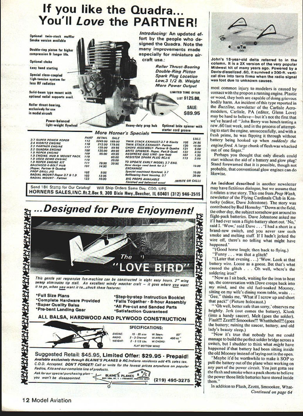 JMES FIRST ever safe know ingly fly model over other persons Also watch out whirling props shorted batteries John Preston THE DOPESHEET news letter Terre Haute IN RC Club editor Don May following say column titled Safe Flying Obviously nobody will aim five- sixpound 70 mph projectile head intentionally consider solder joint breaks elevator flutters rips off servo motor hits dead spot someone else turns transmitter having frequency pin best pilot world can nothing before inevitable happens way assure inevit able happens safe spot never allow model fly over innocent heads Amen personal experience flying field just week ago drove home message no matter what fly never fly over people friend visiting Australia flying big 60powered 18-year-old delta sudden didnt have What went wrong doubt will ever know result loss radio response crasha vertical dive about 200 feet Surprisingly model suffered little damage thanks wetter-than-normal summer kept ground relatively soft nose model buried itself field depth about 4 behind engine two us couldnt pull free until dug away dirt around engine telling Because want too ponder what could have result model descended crowded pit area instead out boondocks some trouble finding record upon retrieval found radio working flawlessly range check made both antenna showed adequate signal strength Violent flutter control surfaces occurred well death dive before started Radio interference another transmitter frequency Perhaps well never know sure doubt readers have hobby length time havent some time other put ground because loss tenuous link between pilot model radio signal Doesnt matter what brand buy operate same principle use basically similar components Should components fail safety fellow model ers yourself could compromised happen over pits spectator area time happens Staying subject never flying over people back July issue ModelAviation published letter reader spoke Out against RC flying moving vehicle public highway Since have addi tional letters conversations question safety such activity intended raise issue first meeting AMA Safety Committee committee estab lished Executive Council vote meeting November 1980 However since Chairman has resign replacement has yet named first meeting committee has yet take place Perhaps will criticized discussing cross-country racing RC models maga zine since take title column seriously feel safer ways bring model aircraft publics eye also raising money charitable organizations readers have different opinions lets hear Changing subject old favorite propel ler safety buzz saw front of models some fly ducted fans continues prime topic correspondence recent letter Tony Paolillo flies Richmond Model Flying Club Staten Island NY asks information safety plastic props Tonys club like number others know has outlawed use plastic props engines above specified displacement case Richmond club 015 cu limit before wooden prop must used present time position either endorse condemn plastic props would like run some tests would provide objective data strength blade separation point view ofplastic versus wooden props hesitant absence facility would give us controlled safe environment prop manufacturers have such data would welcome letter can say present have heard incidents blade separation props made synthetic materials wooden props However wooden props entirely exempt problem advice has stated previous columns subject namely dont stand line prop arc tweaking needle valve full throttle Control Line Free Flight modelers should especi ally careful since generally dont use throttleequipped engines have read articles indicate brands plastic props will outperform wooden counterparts such case club bans use plastic props may penalizing competition modeler may need ounce thrust can find However part popularity plastic prop stems its ability take abuse damage does wooden variety Could contributing factor reports blade shedding plastic props have seen plastic prop driven ground during poor landing sign damage could damage although invisible Comments plastics ex perts welcomed Weve said before well say again Continued page 12 10 Model Aviation T II I4EY BUDDY 4AVE rU SEtN tAODEL AI1PLANE like Quadra. Youll Love PARTNER Optional twin-stack muffler Smoke version available Double-ring piston higher compression er life Optional choke easy hand starting Special close-coupled high-tension system less RF radiation Solid-beam type mount optional radial supports avail Roller thrust-bearing exclusively use model aircraft Power-balanced light-weight flywheel 37 SUPER POWER ROPER 24 KIORITZ ENGINE 22 PARTNER ENGINE 22 QUADRA ENGINE 19 ROPER ENGINE 79 ENGINE HUB & MOUNT PACK 79 USED DEMO ENGINE 19 ROPER ENGINE KIT BALENCED 6-BOLT HUB Ropa Part,, & Quadra PROP DRILL JIG RADIAL MOUNT-Roper 27 & 79 RADIAL MOUNT- Pane, 702995 1037295 7237000 Introducing An updated ef fort people de signed Quadra Note improvements made especially miniature air craft use Roller Thrust-Bearing Double-Ring Piston Spark Plug Location Low3 1/2 lb Weight Power Output LIMITED TIME OFFER LIST $12500 SALE 5 prop hub Optional brite spinner starter cord eroove SALE 2495 7000 500 ESO 795 250 7000 7000 2000 WRITE OR CALLI Send 18 Stamp Catalog Will Ship Orders Same Day COD UPS I HORNERS SALESINCRt2eax 9 300 Dixie HwyBeecher IL 00401 312 940-25151 Suggested Retail $4595 Limited Offer $2995 Prepaid Available eXclusively through BLAINES PLANES & AC Indiana residents add 4% sales taX C 0 D Accepted DONT FORGE77 Call write lowest prices anywhere popular Radios Kits comolete line products Ask specialpurchasing plan-- eLAINE" S PLANES YOU wont disappointedSOS flO SS tt ~ 21 9 495-3275 0 Common injury modelers caused contact prop running engine Plastic wood both Capable doing grievous bodily harm An incident type reported Buzzline newsletter Carlisle Aero modelers Carlisle PA editor Glenn Love may hard believebut its first weve heard John Berry bench testing new 60 last week process attempt ing start engine u