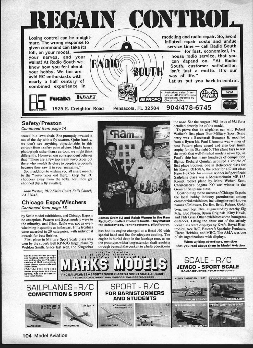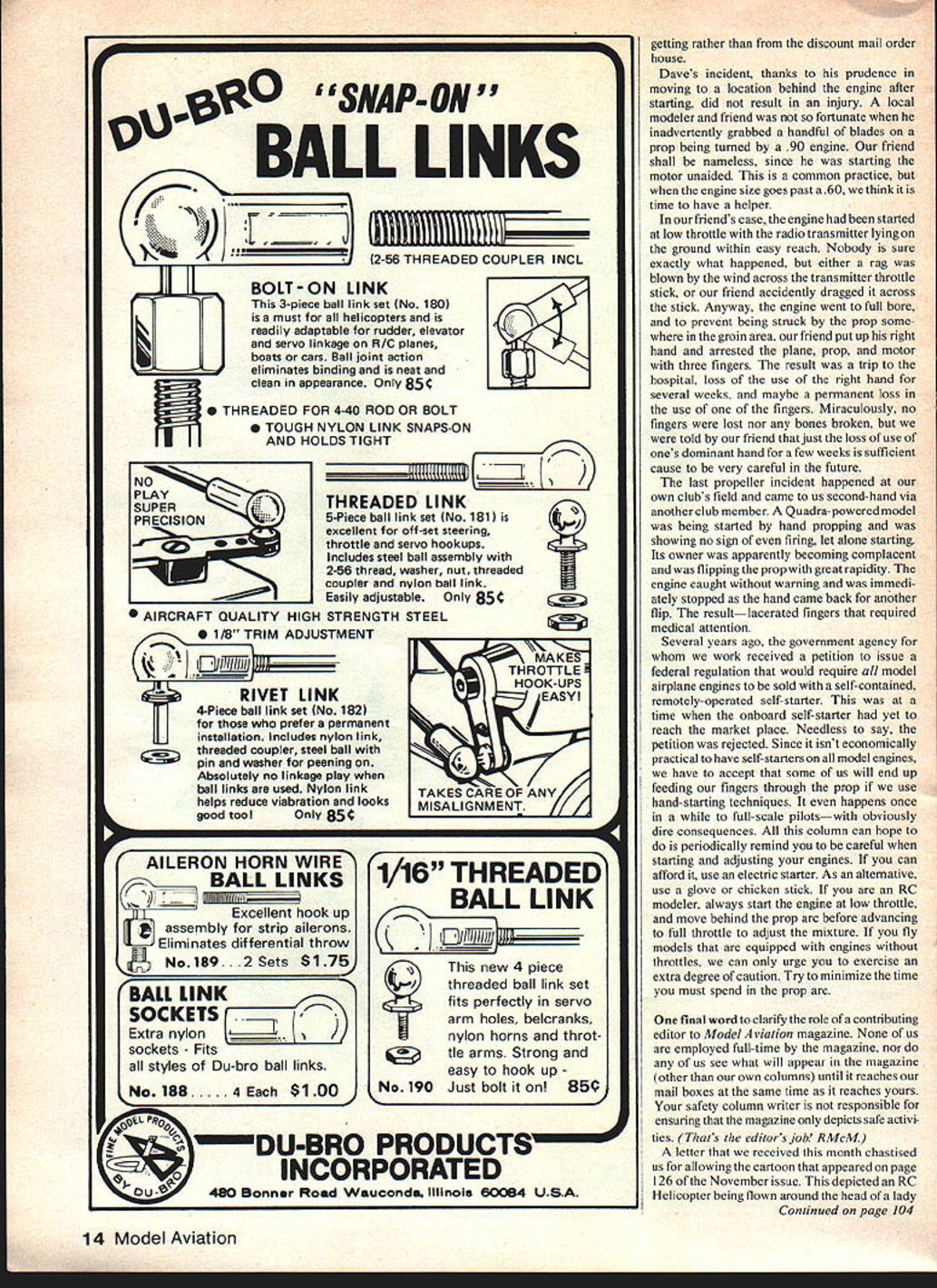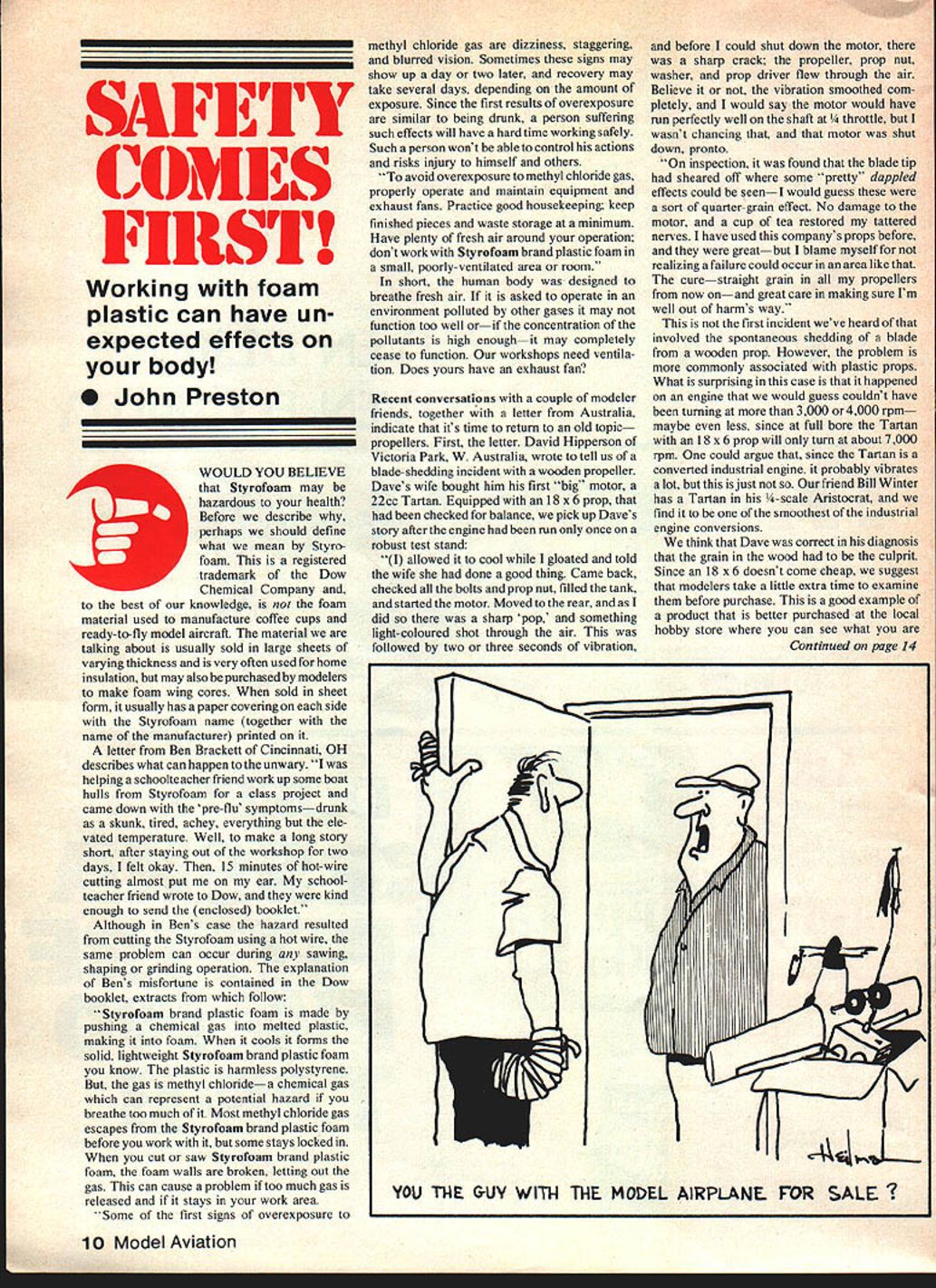 QAUUFE~T ~1FLI1 OMES FIRST Working foam plastic can have un expected effects body 0 John Preston WOULD YOU BELIEVE Styrofoam may hazardous health Before describe perhaps should define what mean Styro foam registered trademark Dow Chemical Company best knowledge foam material used manufacture coffee cups ready-to-fly model aircraft material talking about usually sold large sheets varying thickness very often used home insulation may also purchased modelers make foam wing cores sold sheet form usually has paper covering side Styrofoam name together name manufacturer printed letter Ben Brackett Cincinnati OH describes what can happen unwary helping schoolteacher friend work up some boat hulls Styrofoam class project came down pre-flu symptomsdrunk skunk tired achey everything ele vated temperature Well make long story short after staying out workshop two days felt okay 15 minutes hot-wire cutting almost put ear school teacher friend wrote Dow kind enough send enclosed booklet Although Bens case hazard resulted cutting Styrofoam using hot wire same problem can occur during sawing shaping grinding operation explanation Bens misfortune contained Dow booklet extracts follow Styrofoam brand plastic foam made pushing chemical gas melted plastic making foam cools forms solid lightweight Styrofoam brand plastic foam know plastic harmless polystyrene gas methyl chloridea chemical gas can represent potential hazard breathe too much Most methyl chloride gas escapes Styrofoam brand plastic foam before work some stays locked cut saw Styrofoam brand plastic foam foam walls broken letting out gas can cause problem too much gas released stays work area Some first signs overexposure methyl chloride gas dizziness staggering blurred vision Sometimes signs may show up day two later recovery may take several days depending amount exposure Since first results overexposure similar being drunk person suffering such effects will have hard time working safely Such person wont able control actions risks injury himself others avoid overexposure methyl chloride gas properly operate maintain equipment exhaust fans Practice good housekeeping keep finished pieces waste storage minimum Have plenty fresh air around operation dont work Styrofoam brand plastic foam small poorly-ventilated area room short human body designed breathe fresh air asked operate environment polluted other gases may function too well orif concentration pollutants high enoughit may completely cease function workshops need ventila tion Does yours have exhaust fan Recent conversations couple modeler friends together letter Australia indicate its time return old topic propellers First letter David Hipperson Victoria Park W Australia wrote tell us blade-shedding incident wooden propeller Daves wife bought him first big motor 22cc Tartan Equipped 18 x 6 prop checked balance pick up Daves story after engine run once robust test stand allowed cool gloated told wife done good thing Came back checked bolts prop nut filled tank started motor Moved rear did sharp pop something light-coloured shot through air followed two three seconds vibration before could shut down motor sharp crack propeller prop nut washer prop driver flew through air Believe vibration smoothed com pletely would say motor would have run perfectly well shaft ttle wasnt chancing that motor shut down pronto inspection found blade tip sheared off some pretty dappled effects could seenI would guess sort quarter-grain effect No damage motor cup tea restored tattered nerves have used companys props before greatbut blame myself realizing failure could occur area like curestraight grain propellers now onand great care making sure Im well out harms way first incident weve heard involved spontaneous shedding blade wooden prop However problem commonly associated plastic props What surprising case happened engine would guess couldnt have turning 3000 4000rpm maybe less since full bore Tartan 18 x 6 prop will turn about 7000 rpm could argue since Tartan converted industrial engine probably vibrates lot just friend Bill Winter has Tartan -scale Aristocrat find smoothest industrial engine conversions think Dave correct diagnosis grain wood culprit Since 18 x 6 doesnt come cheap suggest modelers take little extra time examine before purchase good example product better purchased local hobby store can see what Continued page 14 10 Model Aviation Ij YOU THE &UV WITW THE MODEL AIRPLANE FOR SALE r SNAP-ON BALL LINKS 2-56 THREADED COUPLER INCL BOLT-ON LINK 3-piece ball link set No 180 must helicopters readily adaptable rudder elevator servo linkage R/C planes boats cars Ball joint action eliminates binding neat clean appearance OnlV 85C fl 0 THREADED FOR 4-40 ROD OR BOLT N TOUGH NYLON LINK SNAPS-ON AND HOLDS TIGHT I, L2 V THREADED LINK 5-Piece ball link set No 181 excelient off-set steering throttle servo hookups Includes steel ball assembly 2-56 thread washer nut threaded coupler nylon ball link Easily adjustable Only 85C AIRCRAFT QUALITY HIGH STRENGTH STEEL 0 1/8 TRIM ADJUSTMENT 4-Piece ball link set No 182 prefer permanent installation Includes nylon link threaded coupler steel ball pin washer peening Absolutely no linkage play ball links used Nylon link helps reduce viabration looks good tool Only 85C AILERON HORN WIRE Excellent hook up assemblyforstripailerons Eliminates differential throw No 189 .2Sets $ 1/16 THREADED BALL LINK No190 BALL LINK SOCKETS Extra nylon sockets styles Du-bro ball links No188 .4 $100 PR00mm DU-BRO PRODUCTS U INCORPORATED Banner Road Wauconda Illinois 60084 USA getting rather discount mail order house Daves incident thanks prudence moving location behind engine after starting did result injury local modeler friend fortunate inadvertently grabbed handful blades prop being turned 90 engine friend shall nameless since starting motor unaided common practice engine size goes past 60 think time have helper friends case engine started low throttle radio transmitter lying ground within easy