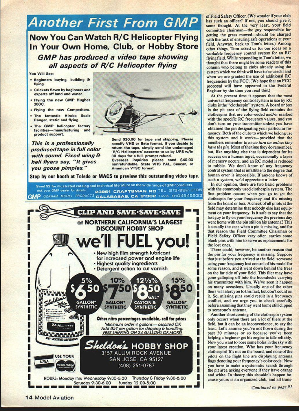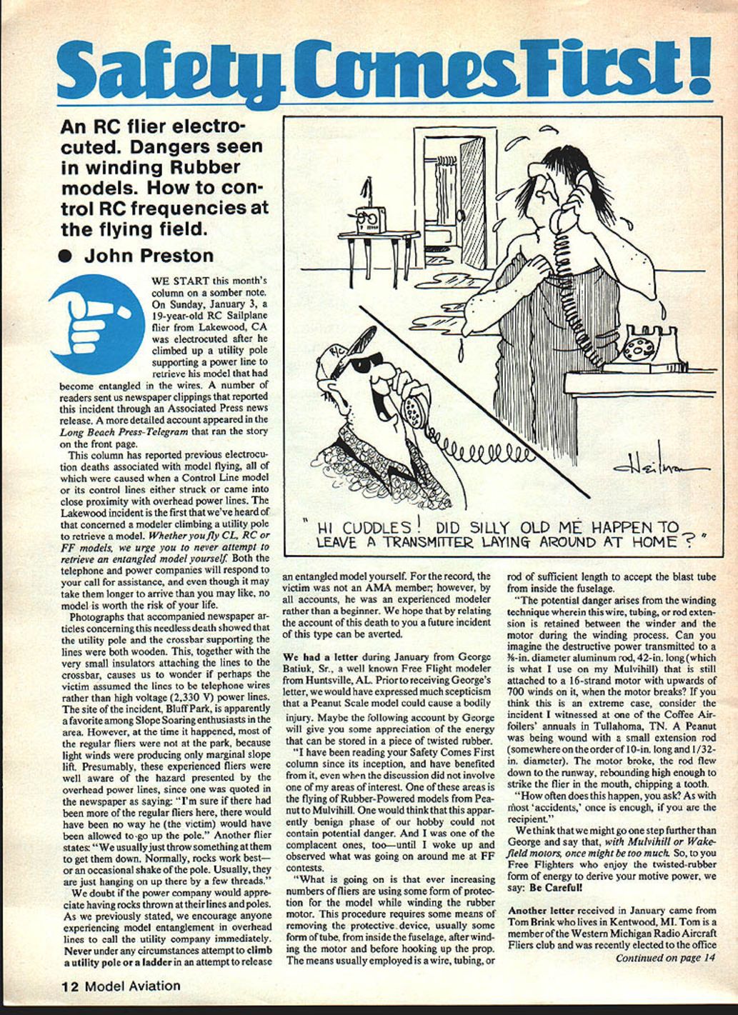 Sateig Cmwsl list An RC flier electro cuted Dangers seen winding Rubber models con trol RC frequencies flying field 0 John Preston WE START months column somber note Sunday January 3 19-year-old RC Sailplane flier Lakewood CA electrocuted after climbed up utility pole supporting power line retrieve model become entangled wires number readers sent us newspaper clippings reported incident through Associated Press news release detailed account appeared Long Beach Press-Telegram ran story front page column has reported previous electrocu don deaths associated model flying caused Control Line model its control lines either struck came close proximity overhead power lines Lakewood incident first weve heard concerned modeler climbing utility pole retrieve model Whether fly CL RC FF models urge never attempt retrieve entangled model yourself Both telephone power companies will respond call assistance though may take longer arrive may like no model worth risk life Photographs accompanied newspaper ar ticles concerning needless death showed utility pole crossbar supporting lines both wooden together very small insulators attaching lines crossbar causes us wonder perhaps victim assumed lines telephone wires rather high voltage 2330 V power lines site incident Bluff Park apparently favorite among Slope Soaring enthusiasts area However time happened regular fliers park because light winds producing marginal slope lift Presumably experienced fliers well aware hazard presented overhead power lines since quoted newspaper saying Im sure regular fliers would have no way victim would have allowed go up pole Another flier states usually just throw something get down Normally rocks work best occasional shake pole Usually just hanging up few threads doubt power company would appre ciate having rocks thrown lines poles As previously stated encourage anyone experiencing model entanglement overhead lines call utility company immediately Never under circumstances attempt climb utility pole ladder attempt release entangled model yourself record victim AMA member however accounts experienced modeler rather beginner hope relating account death future incident type can averted letter during January George Batiuk Sr well known Free Flight modeler Huntsville AL Prior receiving Georges letter would have expressed much scepticism Peanut Scale model could cause bodily injury Maybe following account George will give some appreciation energy can stored piece twisted rubber have reading Safety Comes First column since its inception have benefited discussion did involve areas interest areas flying Rubber-Powered models Pea nut Mulvihill would think appar ently benign phase hobby could contain potential danger complacent ones toountil woke up observed what going around FF contests What going ever increasing numbers fliers using some form protec tion model winding rubber motor procedure requires some means removing protective device usually some form tube inside fuselage after wind ing motor before hooking up prop means usually employed wire tubing rod sufficient length accept blast tube inside fuselage potential danger arises winding technique wherein wire tubing rod exten sion retained between winder motor during winding process Can imagine destructive power transmitted h-in diameter aluminum rod 42-in longwhich what use Mulvihill still attached 16-strand motor upwards 700 winds motor breaks think extreme case consider incident witnessed Coffee Air foilers annuals Tullahoma TN Peanut being wound small extension rod somewhere order 10-in long 1/3 2in diameter motor broke rod flew down runway rebounding high enough strike flier mouth chipping tooth often does happen ask As inost accidents once enough recipient think might go step further George say Mulvihill Wake field motors once might too muck So Free Flighters enjoy twisted-rubber form energy derive motive power say Careful Another letter received January came Tom Brink lives Kentwood MI Tom member Western Michigan Radio Aircraft Fliers club recently elected office Continued page 14 12 Model Aviation 00 NI CUDDLES DID SILLX OLD ME HAPPEN TO LEAVE TANSMI1TEI LAYING AROUND AT HOME Now Can Watch RIC Helicopter Flying Own Home Club Hobby Store GMP has produced video tape showing aspects R/C Helicopter flying Will See * Beginners buying building ng Crickets flown beginners experts off land water Flying new GMP Hughes 300C Flying new Competitors * The fantastic Hirobo Scale Ranger static flying * The GMP helicopter factory facilitiesmanufacturing product support professionally produced tape full color sound Fixed wing 8 heli flyers say gives goose pimples Stop booth Toledo MACS preview outstanding video tape Send $3000 tape shipping Please specify VHS Beta format decide return tape simply send undamaged R/C Helicopters cassette us UPS w/in 30 days full prompt refund Overseas inquiries please send $4000 nonrefundable State VHS PAL Seacan American VTSC format LM NORTHERN CALIFORNIAS LARGESTU DISCOUNT HOBBY SHOPI I well FUELyouI New high film strength lubricant N Increased power engine life Highest quality Ingredients IJ Detern~nt action cut varnish I I II II II II II II II II II IHOURS Monday thru Wednesday 9Z3U-3U lhursday b Fnday 93O-6OUI Saturday 930-6 00 Sunday 1200-500 L m ield Safety Officer wonder club has such officer should give some thought very least field committee chairmanthe guy responsible getting grass mowedshould charged task ensuring safe operations field Anyway back Toms letter Among other things Tom asked us ideas workable frequency control system RC flying field responding Toms letter thought might some readers column belong clubs already using system think will have used granted use additional RC frequencies FCC hope FCC proposal will have appeared Federal Register time read present time appears universal frequency control system use RC clubs clothespin system board box pit area flying field contains clothespins color-coded and/or marked specific RC frequency v