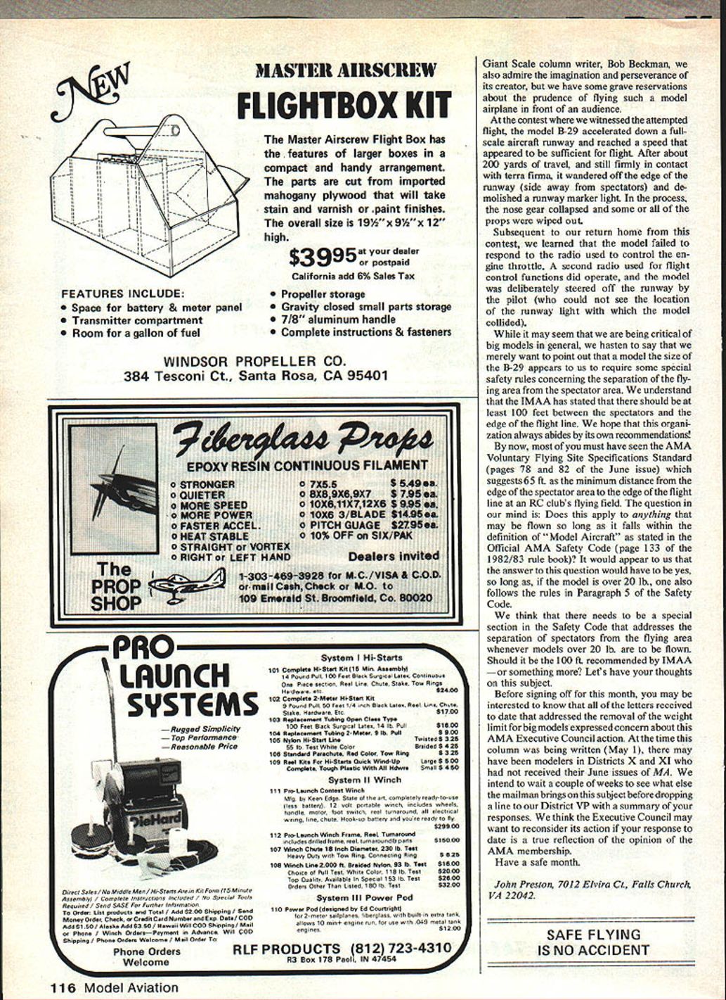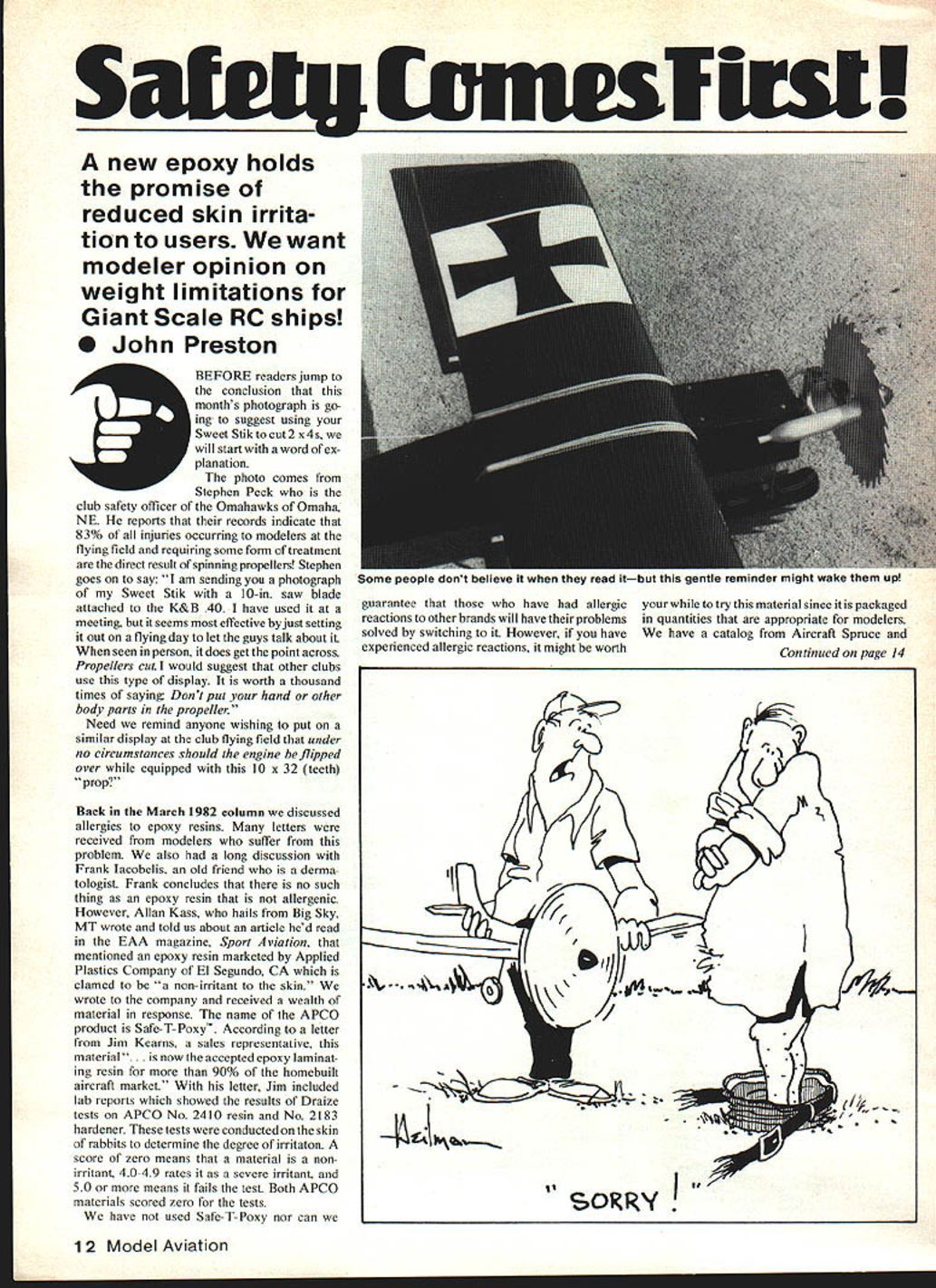 Sfirst ____CA new epoxy holds promise reduced skin irrita tion users want modeler opinion weight limitations Giant Scale RC ships John Preston BEFORE readers jump conclusion months photograph goto suggest using Stiktocut2 x4s will start word ex planation photo comes Stephen Peck club safety officer Omahawks Omaha NE reports records indicate 83% injuries occurring modelers flying field requiring some form treatment direct result spinning propellers Stephen goes say am sending photograph Sweet Stik 10-in saw blade attached K&B 40 have used meeting seems effective just setting Out flying day let guys talk about seen person does get point across Propellers cut would suggest other clubs use type display worth thousand times saying Dont put hand other body parts propeller Need remind anyone wishing put similar display club flying field under no circumstances should engine flipped over equipped 10 x 32 teeth prop Back March 1982 column discussed allergies epoxy resins letters received modelers suffer problem also long discussion Frank lacobelis old friend derma tologist Frank concludes no such thing epoxy resin allergenic However Allan Kass hails Big Sky MT wrote told us about article hed read EAA magazine Sport Aviation mentioned epoxy resin marketed Applied Plastics Company El Segundo CA clamed non-irritant skin wrote company received wealth material response name APCO product Safe-T-Poxy According letter Jim Kearns sales representative material. now accepted epoxy laminat ing resin 90% homebuilt aircraft market letter Jim included lab reports showed results Draize tests APCO No 2410 resin No 2183 hardener tests conducted skin rabbits determine degree irritaton score zero means material nonirritant 40-49 rates severe irritant 50 means fails test Both APCO materials scored zero tests have used Safe-T-Poxy nor can guarantee have allergic reactions other brands will have problems solved switching However have experienced allergic reactions might worth try material since packaged quantities appropriate modelers have catalog Aircraft Spruce Continued page 14 ..1 1 2 Model Aviation Some people dont believe read itbut gentle reminder might wake up Two great new accessories Great Planes Switch n GIowT Now can forget about engine flameouts during low throttle maneuvers turning last winters work love pile spare parts U Switch n Glow Great Planes new on-board ignition system links throttle servo Pull throttle back lightweight battery pack puts glow back glow plug throttle setting desire As soon throttie up Switch n Glow cuts out U Its easy install lightweight affordable Great scale builders dont want cut holes engine cowlings o ideal competition pattern flyers cant afford flame-out wrong time mention boaters last time flameout middle lake U Dont take chances favorite R/C project Buy Switch n Glow Its insurance cant afford Only $2495 SportFloatsTM summer go out lake can just fish swim --- can go seaplaning Great Planes new SportFloats 31 foam core floats handle large 60 size designs floats build up fast easy Just install landing gear blocks foam cores cover balsa ply sheeting included finish U its off favorite lake river new R/C thrills youre bound enjoy thanks SportFloatsw Less $2895 Thirty-four Great Planes Tweedy Bird Dirty Birdy 40 Dirty Birdy 60 Super Sportster 40 Sun Fli 420 Quickest 200 Quickest 500 15500 Kacs Super Kans 40 Super Kaos 60 tJ60 Deception Cosmic Wind Rearwin Speedster Chipmunk Corbin Ace Krah Super Fli CAP 20L \T6 Texan PSI Mustang FT Tgercat T26 Aerocommander Shrike Lockheed Sirius favorite R/C dealer P o BOX 721 URBANA ILLINOIS 61801 217 367-2069 Specialty Company Box 424 Fullerton CA 92632 Safe-T-Poxy listed follows -pint kit resin hardener $650 1-pint kit 1 pint resin hardener $8751 -quart kit 1 quart resin 1 pint hardener $1420 catalog also lists five-minute Safe-T-Poxy plastic squeeze bot tles containing4 oz Part and4 oz Part B $635 Another distributor APCO products Wicks Aircraft Supply 410 Pine St Highland IL 62249 dont have Wicks catalog cannot quote prices As stated before endorsing Safe-T Poxy merely suggesting modelers have experienced reactions other brands might want give try would interested hearing anyone follows suggestion Before closing subject let us add APCO also sent us booklet titled Safe Hand ling Resins Laminating booklet contains following tips 1 Avoid excessive skin contact resins 2 Wear use disposable protective gloves preference barrier creams contact resin probable 3 Wear eye protection times dis pensing mixing using laminating resins 4 Do work large areas body exposed resins ie short pants shortsleeved shirts 5 Work well-ventilated areas especially workplace temperatures higher normaL 6 Use dust mask 7 Clean up toolsIf tools must cleaned solvent use mineral spirits Never contact skin solvents contaminated resin Acetone MEK and/or chlorinated solvent unnecessary hazardous should used 8 Preparation work areaCover work areas disposable papers discard after work session 9 Clean up large spills Cover sand other absorbent material dispose Clean contaminated area mineral spirits Needless say tips appropriate using brand resin followed should significant reducing preventing allergic reactions user previously discussed RC frequency controL featured safety column May1982 issue ofMAIncidentallyjustforthe record concluding remark column about calling wife flying field asking bring forgotten trans mitter meant tongue-in-cheek also chauvinistic remarksomething didnt realize time written Sue Kayton lives Los Angeles wrote wound up letter saying Oh way better system getting transmitter delivered field forget call husband phone brings ladies fly RC apologize Sue also stated bring-your-own-flag frequency-control system has use years Sepulveda Model Airport LA also have segregated pit areas assume frequency rather sex sorry Sue just couldnt resist number other readers reported similar success system flying fields Most pointed out its advantage identifying flying rather jus