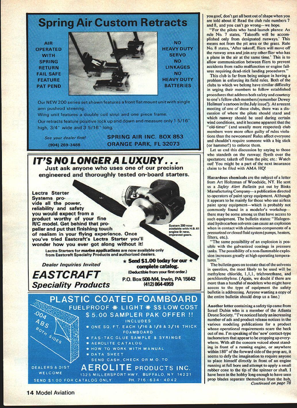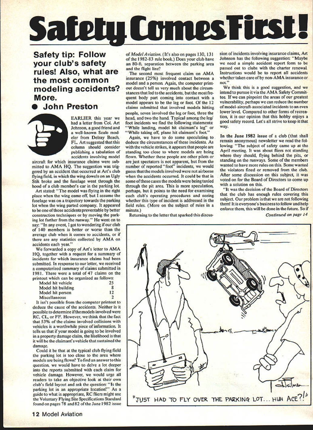 _____ ents Sateig rst Safety tip Follow clubs safety rules Also what common modeling accidents John Preston EARLIER year letter CoL Art Johnson good friend well-known Scale mod eler Deiray Beach FL Art suggested column should consider publishing tabulation accidents involving model aircraft insurance claims sub mitted AMA HQ suggestion trig gered accident occurred Arts club flying field wing dowels Ugly Stik broke fuselage went through hood club members car parking lot Art stated model flying right place wing came off assume fuselage trajectory towards parking lot wing parted company appeared accidents preventable better construction techniques moving park ing lot farther runway went say event got wondering club 140 members better worse average club comes accidents statistics collected AMA accidents year forwarded copy Aifs letter AMA HQ together request summary incidents insurance claims submitted response letter received computerized summary claims submitted 1981 total 47 claims printout can organized follows Model hit vehicle25 Model hit building8 Model hit person12 Miscellaneous2 isnt possible computer printout deduce cause accidents Neither possible determine models involved RC C1 FF However think fact 53% claims involved collisions vehicles worthwhile piece information tells us model going involved property damage claim likelihood will claimants vehicle sustained damage Could typical club flying field parking lot too close area models being flown find answer question would have delve lot deeper reports submitted claim vehicle damage However would urge readers take objective look own clubs field layout ask question parking lot appropriate location As guide what appropriate RC fliers might use Voluntary Flying Site Specifications Standard found pages 78 82 June1982 issue ModelAviation Its also pages 130 131 1982-83 rule book Does club have 80-ft separation between parking area flight line second frequent claim AMA insurance 25% involved contact between model person Again computer print out doesnt tell us very much about circum stances led accidents fre quent body part coming contact model appears leg foot 12 claims submitted involved models hitting people seven involved leg foot three head two hand Typical among leg foot incidents find following statements landing model hit claimants leg taking off plane hit claimants foot Again have some speculating deduce circumstances incidents As vehicle strikes appears people standing too close models being flown Whether people other pilots just spectators apparent number reported foot incidents would guess models involvedwere airborne accidents occurred could some ofthese cases models being taxied through pit area speculation perhaps points need examining clubs operating procedures seeing whether type incident addressed field rules subject rules minute Returning letter sparked discussion incidents involving insurance claims Art Johnson has following suggestion Maybe need simple accident report form passed out clubs charter renewaL Instructions would report accidents whether taken care non-AMA insurance think good suggestion intend pursue via AMA Safety Commit tee can pinpoint areas greatest vulnerability perhaps can reduce number model-aircraft-associated incidents lower leveL Compared other forms recrea tion opinion hobby enjoys good safety record Lets strive keep way June 1982 issue club shall remain anonymous newsletter read fol lowing subject safety came up April meeting about fliers standing should flying behind pits standing runways Some members wanted have rules Some wanted violators fined removed club After some discussion subject voted Board Directors come up solution decision Board Directors club has enough rules covering subject problem following everyones business follow help enforce will done future So Continued page 14 12 Model Aviation 0 V 0 JUST ItAD TO FLY OVER TI-IE PAKIN- LOT. AUI4 ACE Lectra Starter Systems pro vide power reliability safety would expect product worthy fine RIC model Get behind pro- stem 200 now peller put finishing touch ---owithHB61 realism flying experience Once youve tried Eastcrafts Lectra Starter youll wonder ever got along itl Lectra Starters fiance applIcatIons now available Eastcraft Specialty Products authorized dealers * Send$1OOtodayforour te cata Deducilie yow first orderi goof dont get bent out shape told about Read club rule numbers 7 8 cant go wrongwe hope pilots hand-launch planes As rule No 7 states Takeoffs will accom plished designated runways means pit area grass Rule No 8 states After takeoff fliers will move off runway area join other flier has plane air same time allow communication between fliers prevent accidents radio malfunction engine fail ures requiring dead-stick landing procedures club far being unique having problem enforcing its field rules Both clubs belong have similar difficulty urging members follow established procedures address both safety courtesy ones fellow club members remember Dewey Heilman s cartoon July issue recent meeting clubs dis cussion pilots should stand runway should used during certain wind conditions became apparent old-timer usually respected club members often guilty rules viola tions newcomers Rules affect everyone shouldnt require someone big stick hammer enforce Let us end discussion saying standeth runway flyeth over spectators taketh off pits etc Watch oud might part next insurance claim filed AMA HQ Hazardous chemicals subject letter Art Holtzman Woodside NY sent us Safety Alert Bulletin put out Binks Manufacturing Company publication directed operators paint spray equipment Although appears mainly use airless paint spray equipmentwhich probably commonly found modelers workshop may some among us have access such equipment bulletin states Halogen ated hydrocarbon solvents can cause explosion contact aluminum components pressurized closed fluid system pumps heaters filters etc same possibility explosion pos sible galvanized coatings pressure tanks