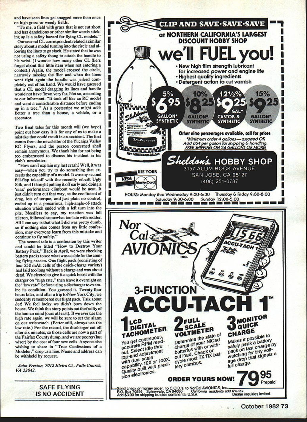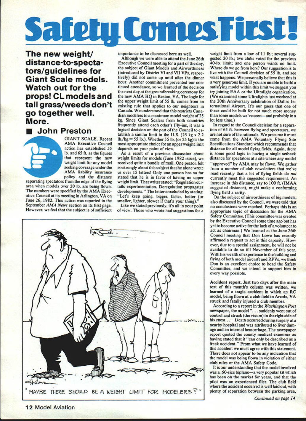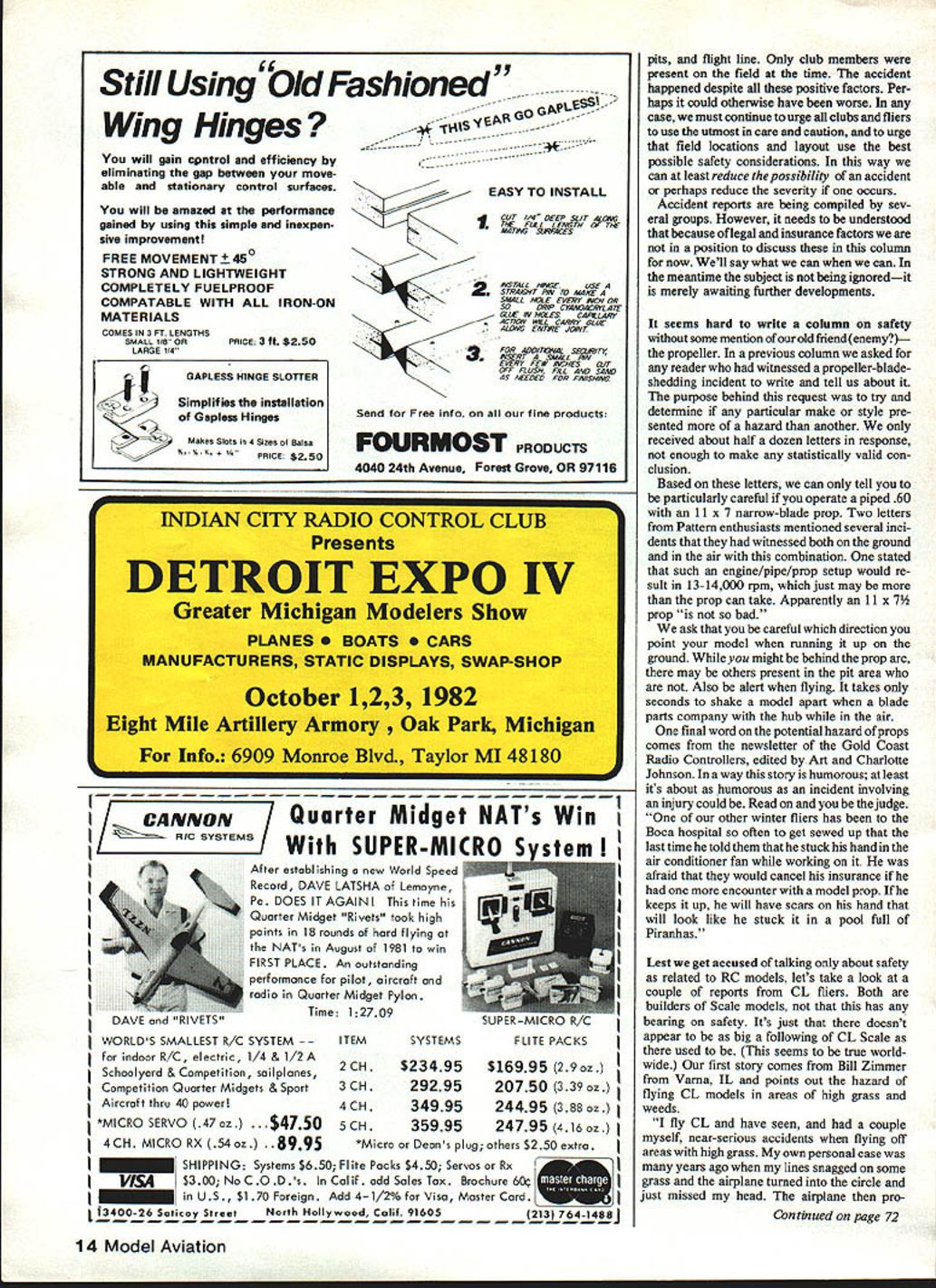 S vnwsflrst new weight distance-to-specta tors/guidelines Giant Scale models Watch out forthe props CL models tall grass/weeds dont go together well U John Preston GIANT SCALE Recent AMA Executive Council action has established 55 lb 65 ft figures represent new weight limit model seeking coverage under AMA liability insurance policy distance separating spectators edge flying area models over 20 lb being flown numbers specified AMA Exec utive Council its meeting Arlington VA June 26 1982 action reported September AMA News section its first page However feel subject sufficient importance discussed well Although able attend June 26th Executive Council meeting part day subject Giant Models Airworthiness introduced District VI VII VPs respec tively did come up until after dinner hour Another commitment prevented con tinued attendance learned decision next day groundbreaking ceremony new AMA HQ Reston VA logic upper weight limit 55 lb comes existing rule applies neighbors Canada understand restricts Cana dian modelers maximum model weight 25 kg Since Giant Scalers both countries frequently attend others Fly-ins logical decision part Council es tablish similar limit US 25 kg x 22 lb/kg 55 lb Whether 55 lb 25 kg appropriate choice foranupperweight limit depends point view As result previous discussion about weight limits models June 1982 issue received quite bundle mail person felt strongly about subject alone wrote us over 15 letters Only person has far stated favor having no upper weight limit writer stated Regulation cur tails experimentation Deregulation propagates developments letter concluded stating Lets keep going bigger faster better smaller lighter slower thats thing Like stated previously its point view wrote suggestions weight limit low 11 lb several sug gested 20 lb two clubs voted previous 40-lb limit person wants no limit go suggestion live Council decision 55 lb see what happens personally believe very generous limit unable build satisfying model within limit suggest try joining EAA Ultralight organization examined some Ultralights last weekend 20th Anniversary celebration Dulles ternational Airport Its guess could built much money some models weve seenand probably lot less time regard Council decision separa tion 65 ft between flying spectators sure rationale presume must come AMA Voluntary Flying Site Specifications Standard recommends distance model flying fields Again some good logic having singie setback distance spectators site model approved AMA may flown gather number club newsletters weve read recently lot flying fields currently meet suggested requirement An increase distance say 100 ft IMAA suggested distance might make conforming flying field rarity subject airworthiness big models also discussed Council told no conclusions reached Perhaps appropriate topic discussion AMA Safety Committee committee created Executive Council some time ago has yet become active lack volunteer act chairman learned June 26th Council meeting Don Lowe has recently affirmed request act capacity ever due special assigument will available till November year wealth experience building flying both model aircraft RPVs think Don excellent choice head Safety Committee intend support him way possible Accident report Just two days after main text months column written learned tragic accident RC model being flown club field Arcola VA struck fatally injured club member According report Washington Post newspaper model ddenly went out control struck victim right side cnest. Death occurred during surgery nearby hospital attributed liver dam age internal hemorrhage newspaper report quoted county medical examiner having stated can described freak accident what have learned accident must agree statement does appear indication model being flown violation either club rules AMA Safety Code understanding model involved 60-size biplanea very popular kit has market years pilot experienced flier club field accident occurred well laid out plenty separation between parking area Continued page 14 12 Model Aviation K 1 1 fr MAYBE THERE SHOUL E IAJEI4T LIMIT FO McQELEK Still Using bid Fashioned Wing Hinges will gain cntrol efficiency by eliminating gap between moveable stationary control surfaces will amazed performance gained using simple inexpen sive improvement FREE MOVEMENT 450 STRONG AND LIGHTWEIGHT COMPLETELY FUELPROOF COMPATABLE WITH ALL IRON-ON MATERIALS COMES IN 3 FT LENGTHS SMALL 118 ORPRICE 3 ft $250 LARGE 114 EASY TO INSTALL 2 3 d CUT I/4 DEEP SLIT ALOe rAE FLEL LENGTH O THE M4TING SSPFACES NISTALL HINGEUSE STRAIGHT RW 70 M4KE SMaLL HOLE EVERY INCH DR SODRIP CYAMSNERYLATE GLUE IN HOLES CARtLARY AciSLW MLL CARRY GLUE ALONG ENTRIE JOINT FOR ADD/TONAL SAaJRITY INSERT SMALL PIN EVERY FEW INCHES CUT DIE FLUSH FILL AND SANG AS NEEDED FOR FINISHING Send Free Info fine products FOURMOST PRODUCTS 4040 24th Avenue Forest Grove OR 97116 ~NNON Quarter Midget NATs Win /II77 SUPERMIthA ustem After establishing new World Speed Record DAVE LATSHA Lemoyne Pa DOES IT AGAIN time Quarter Midget Rivets took high points 18 rounds hard flying NATs August 1981 win FIRST PLACE An outstanding performance pilot aircraft radio Quarter Midget Pylon Time 12709 SYSTEMS $23495 29295 4CH34995 5CH35995 WORLDS SMALLEST R/C SYSTEM ITEM indoor R/C electric 1/4 & 1/2A Schoolyard & Competition sailplanes 2 CH Competition Quarter Midgets & Sport 3 CH Aircraft thru 40 power *MICRO SERVO 47oz 50 4CH MICRO RX 54oz 8995 $16995 29 oz 20750 339 oz 24495 388 oz 24795 416 oz *MiCro Deans plug others $250 extra SHIPPING Systems $650 Flite Packs $450 Servos Rx VIS4$300 No CODs Calif add Sales Tax Brochure 60 US $170 Foreign Add 4-1/2% VisaMasterCard 13400-26 Sotlcoy StreetNorth Hollywood Calif 91605l21 g-oaJ pits flight line Only club members present field time accident happened despite positive factors Per haps could otherwise have worse case must continue urge clubs fliers use utmost care caution urge field locations layout use best possible safety consid