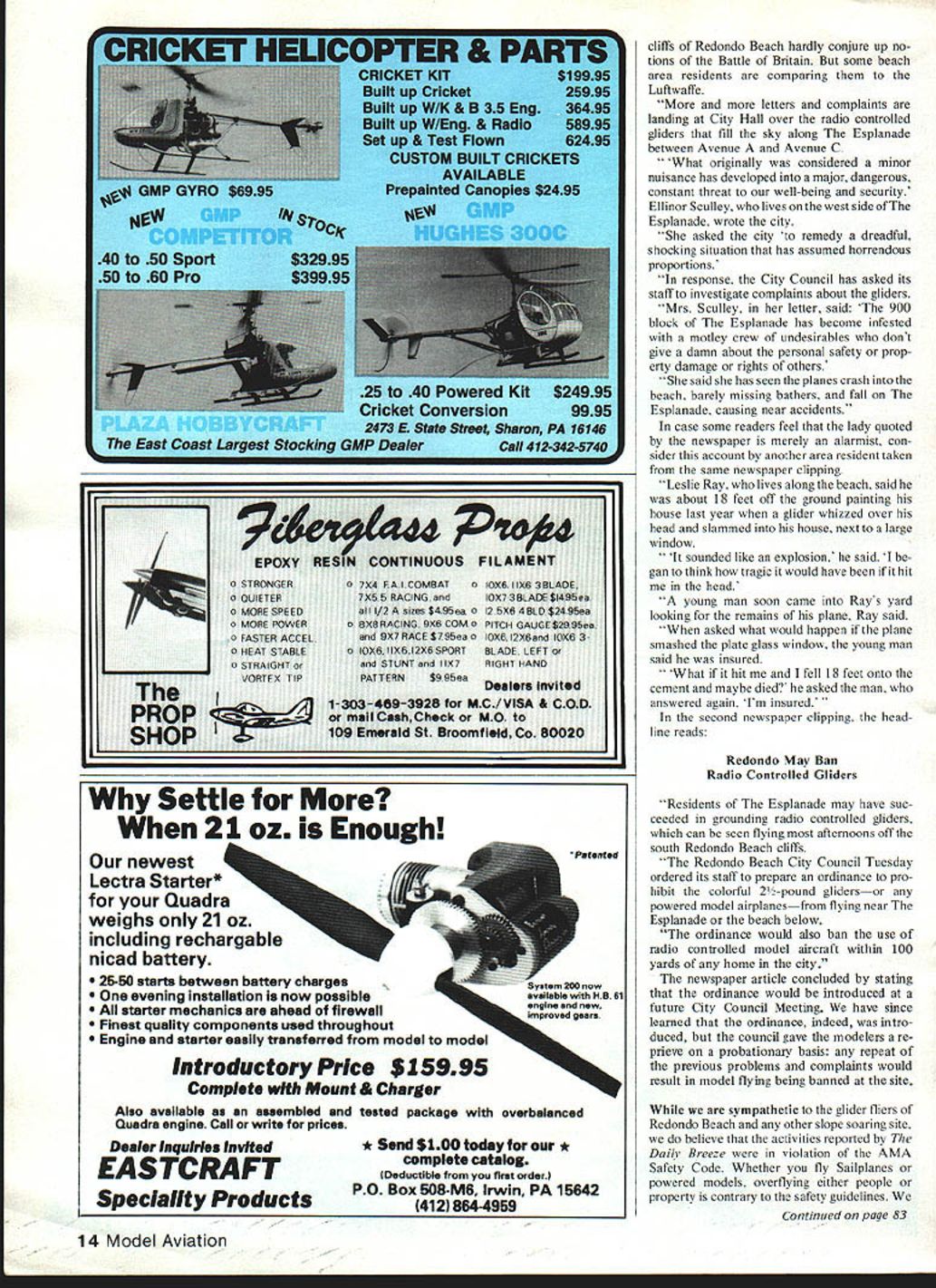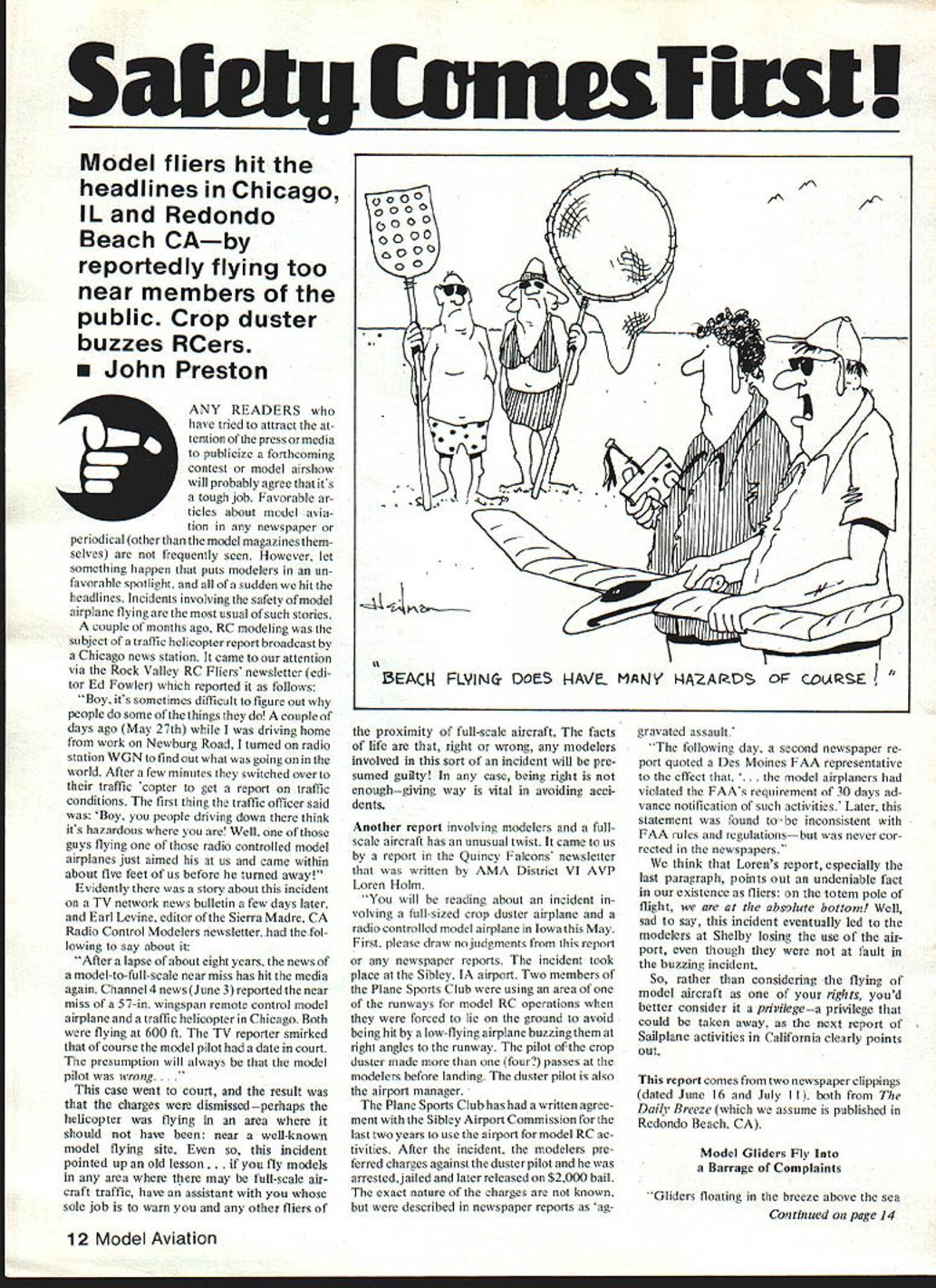 S Cumesflist Model fliers hit headlines Chicago IL Redondo Beach CAby reportedly flying too near members public Crop duster buzzes RCers John Preston ANY READERS have tried attract tention press media publicize forthcoming contest model airshow will probably agree its tough job Favorable ar ticles about model avia tion newspaper periodical other model magazines selves frequently seen However let something happen puts modelers un favorable spotlight sudden hit headlines Incidents involving safety model airplane flying usual such stories couple months ago RC modeling subject traffic helicopter report broadcast Chicago news station came attention via Rock Valley RC Fliers newsletter edi tor Ed Fowler reported follows Boy its sometimes difficult figure out people some things couple days ago May 27th driving home work Newburg Road turned radio station WGN find out what going world After few minutes switched over traffic copter get report traffic conditions first thing traffic officer said Boy people driving down think its hazardous Well guys flying radio controlled model airplanes just aimed us came within about five feet us before turned away Evidently story about incident TV network news bulletin few days later Earl Levine editor Sierra Madre CA Radio Control Modelers newsletter fol lowing say about After lapse about eight years news model-to-full-scale near miss has hit media again Channel 4 news June 3 reported near miss 57-in wingspan remote control model airplane traffic helicopter Chicago Both flying 600 ft TV reporter smirked course model pilot date court presumption will always model pilot wrong case went court result charges dismissedperhaps helicopter flying area should have near well-known model flying site incident pointed up old lesson. models area may full-scale air craft traffic have assistant sole job warn other fliers proximity full-scale aircraft facts life right wrong modelers involved sort incident will pre sumed guilty case being right enoughgiving way vital avoiding acci dents gravated assault following day second newspaper re port quoted Des Moines FAA representative effect del airplaners violated FAAs requirement 30 days ad vance notification such activities Later statement found inconsistent FAA rules regulationsbut never cor rected newspapers think Lorens report especially last paragraph points out undeniable fact existence fliers totem pole flight absolute bottom Well sad say incident eventually led modelers Shelby losing use air port though fault buzzing incident So rather considering flying model aircraft rights youd better consider privilegea privilege could taken away next report Sailplane activities California clearly points out Another report involving modelers fullscale aircraft has unusual twist came us report Quincy Falcons newsletter written AMA District VI AVP Loren HoIm will reading about incident volving full-sized crop duster airplane radio controlled model airplane Iowa May First please draw no judgments report newspaper reports incident took place Sibley IA airport Two members Plane Sports Club using area runways model RC operations forced lie ground avoid being hit low-flying airplane buzzing right angles runway pilot ofthecrop duster made four passes modelers before landing duster pilot also airport manager Plane Sports Club has written agree ment Sibley Airport Commission last two years use airport model RC ac tivities After incident modelers pre ferred charges against duster pilot arrestedjailed later released $2000 bail exact nature charges known Gliders floating breeze above sea described newspaper reports ag report comes two newspaper clippings dated June 16 July II both Daily Breeze assume published Redondo Beach CA Model Gliders Fly Barrage Complaints Continued page 14 12 Model Aviation 0000 0000 0000 0000 cO 00 7 II BEACN FLVIN& Does HAVE MRNJY HAZARX OF COARSE cliffs Redondo Beach hardly conjure up no tions Battle Britain some beach area residents comparing Luftwaffe letters complaints landing City Hall over radio controlled gliders fill sky along Esplanade between Avenue Avenue C What originally considered minor nuisance has developed major dangerous constant threat well-being security Ellinor Sculley lives west side Esplanade wrote city asked city remedy dreadful shocking situation has assumed horrendous proportions response City Council has asked its staff investigate complaints about gliders Mrs Sculley letter said 900 block Esplanade has become infested motley crew undesirables dont give damn about personal safety prop erty damage rights others said has seen planes crash beach barely missing bathers fall Esplanade causing near accidents case some readers feel lady quoted newspaper merely alarmist con sider account another area resident taken - from same newspaper clipping Leslie Ray lives along beach said about 18 feet off ground painting house last year glider whizzed over head slammed house next large window sounded like explosion said gan think tragic would have hit head young man soon came Rays yard looking remains plane Ray said asked what would happen plane smashed plate glass window young man said insured What hit fell 18 feet onto cement maybe died asked man answered again Im insured second newspaper clipping head line reads Redondo May Ban Radio Controlled Gliders Residents Esplanade may have suc ceeded grounding radio controlled gliders can seen flying afternoons off south Redondo Beach cliffs Redondo Beach City Council Tuesday ordered its staff prepare ordinance pro hibit colorful 22-pound glidersor powered model airplanesfrom flying near Esplanade beach below ordinance would also ban use radio controlled model aircraft within 100 yards home city newspaper article concluded stating ordinance would introduced future City Council Meeting have since learned ordinance indeed intro duced council gave modelets re prieve probationary basis repeat previous problems complaints would result model flying being banned site Also availa