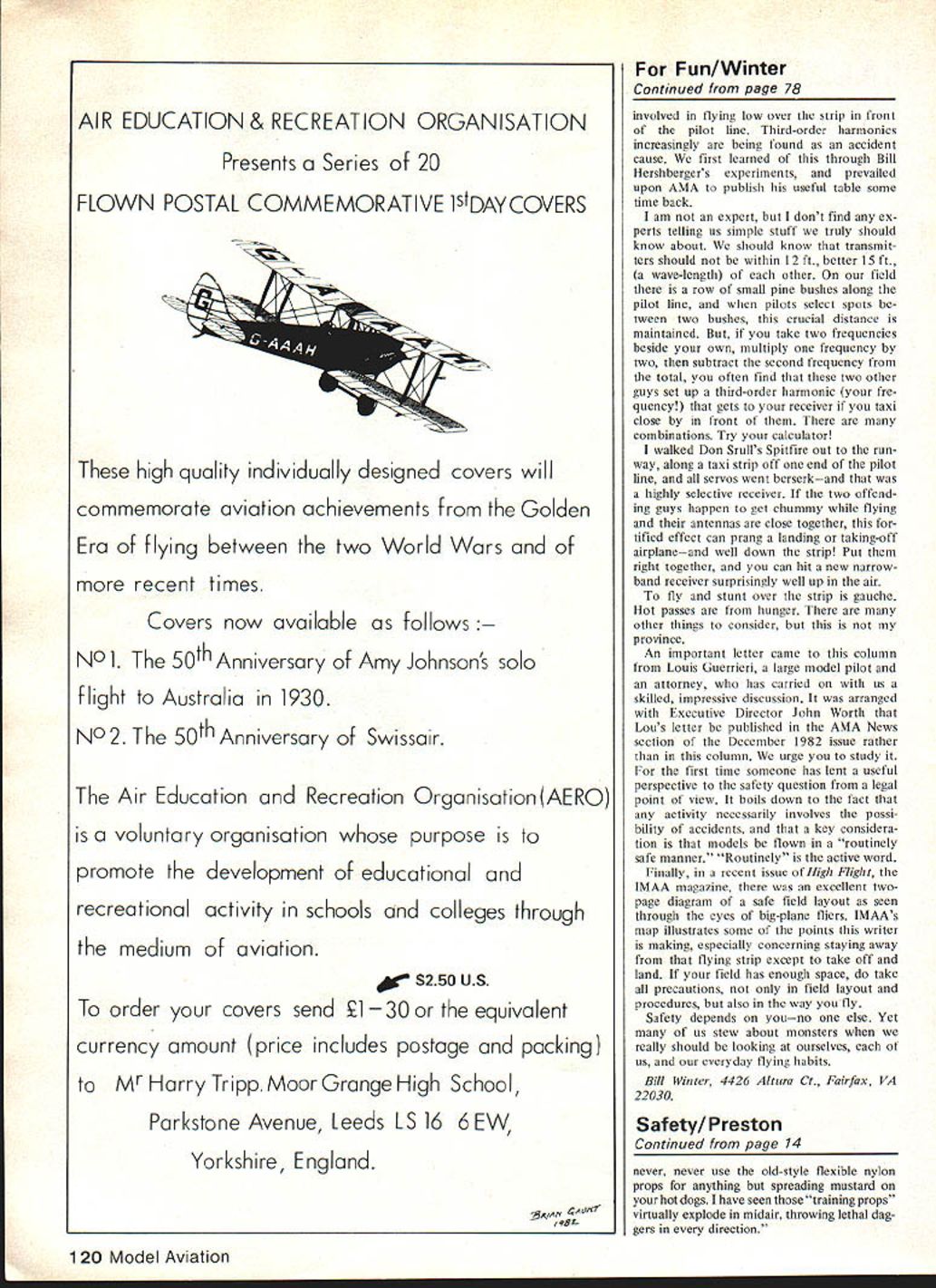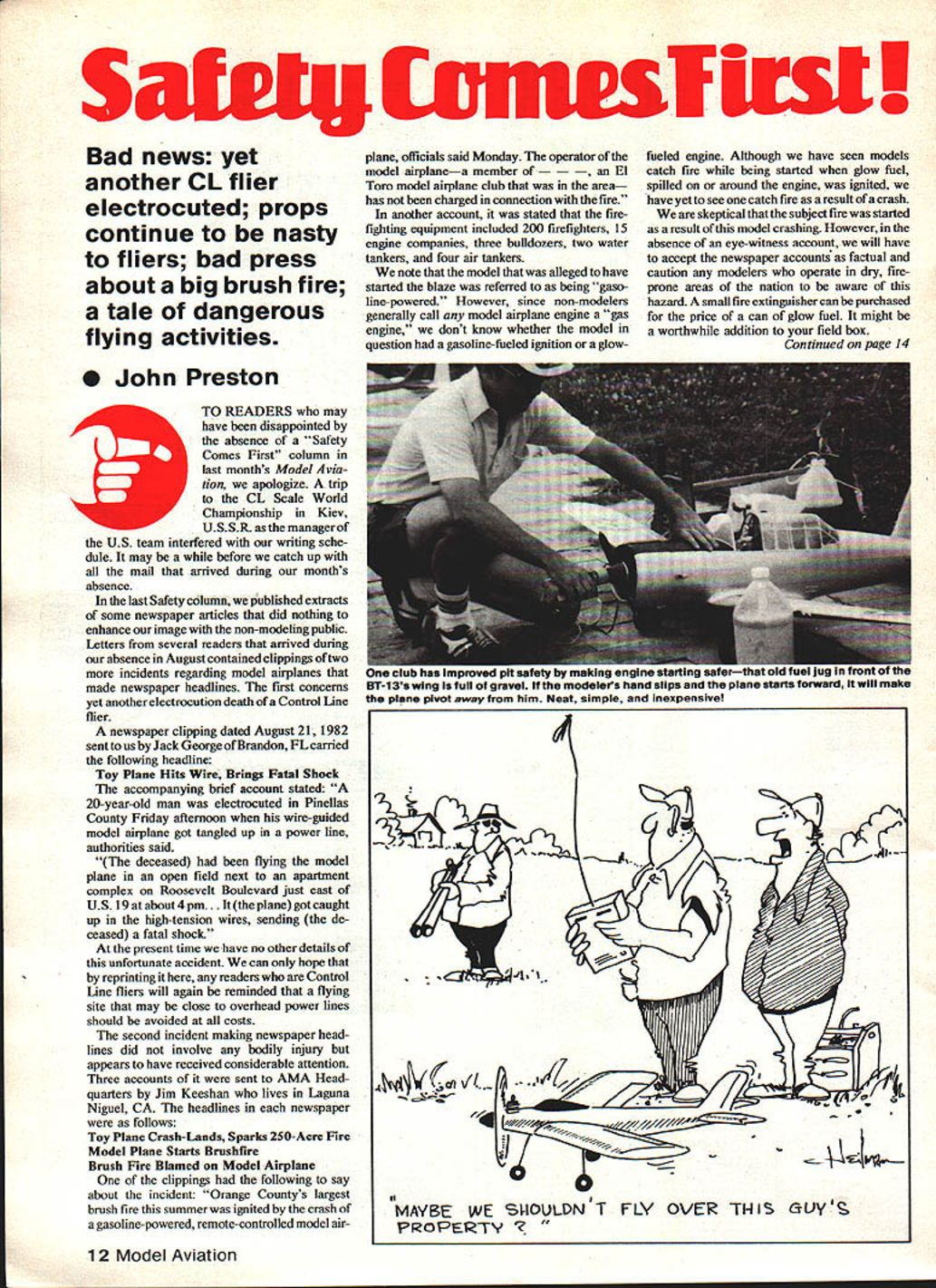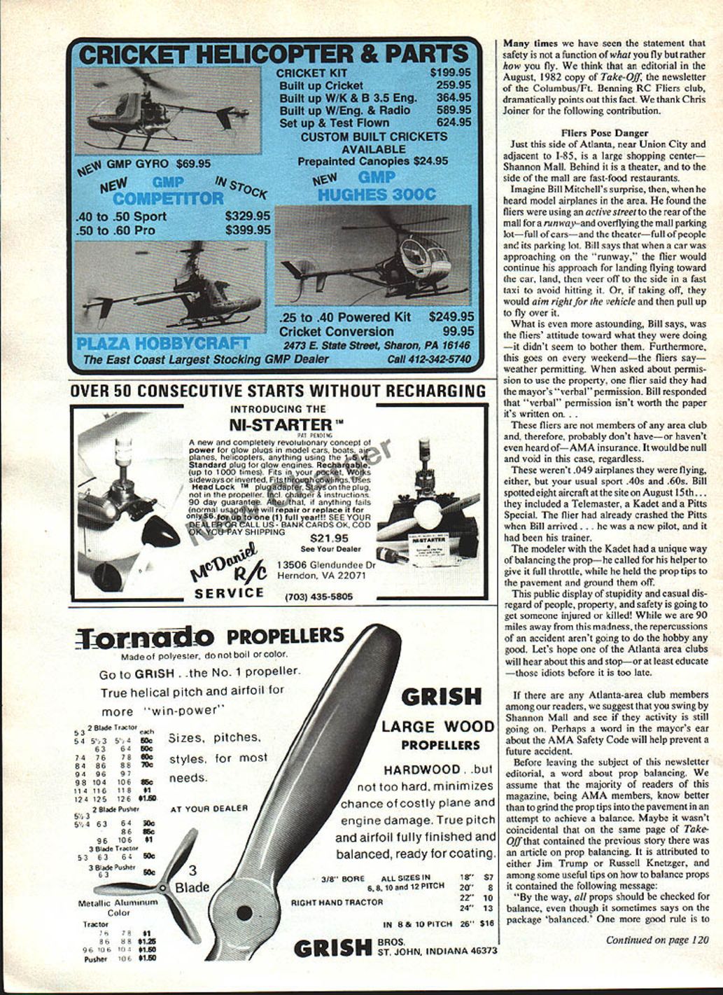 Sateig vnwsflrsl Bad news yet another CL flier electrocuted props continue nasty fliers bad press about big brush fire tale dangerous flying activities John Preston TO READERS may have disappointed absence Safety Comes First column last months Model via don apologize trip CL Scale World Championship Kiev USSR asthemanagerof US team interfered writing sche dule may before catch up mail arrived during months absence last Safety column published extracts some newspaper articles did nothing enhance image non-modeling public Letters several readers amved during absence August contained clippings two incidents regarding model airplanes made newspaper headlines first concerns yet another electrocution death Control Line flier newspaper clipping dated August 21 1982 sent us Jack George Brandon FL carried following headline Toy Plane Hits Wire Brings Fatal Shock accompanying brief account stateth 20-year-old man electrocuted Pinellas County Friday afternoon wire-guided model airplane got tangled up power line authorities said deceased flying model plane open field next apartment complex Roosevelt Boulevard just east US l9atabout4pm. plane got caught up high-tension wires sending de ceased fatal shock present time have no other details unfortunate accident can hope reprinting readers Control Line fliers will again reminded flying site may close overhead power lines should avoided costs second incident making newspaper head lines did involve bodily injury appears have received considerable attention Three accounts sent AMA Head quarters Jim Keeshan lives Laguna Miguel CA headlines newspaper follows Toy Plane Crash-Lands Sparks 250-Acre Fire Model Plane Starts Brushfire Brush Fire Blamed Model Airplane clippings following say about incident Orange Countys largest brush fire summer ignited crash gasoline-powered remote-controlled model air12 Model Aviation plane officials said Monday operator model airplanea member Toro model airplane club area has charged connection fire another account stated firefighting equipment included 200 firefighters 15 engine companies three bulldozers two water tankers four air tankers note model alleged have started blaze referred being gaso line-powered However since non-modelers generally call model airplane engine gas engine dont know whether model question gasoline-fueled ignition aglowfueled engine Although have seen models cateh fire being started glow fuel spilled around engine ignited have yet see catch tire result crash skeptical subject fire started result model crashing However absence eye-witness account will have accept newspaper account factual caution modelers operate dry fireprone areas nation aware hazard small fire extinguisher canbe purchased price can glow fuel might worthwhile addition field box Continued page 14 U D Iflardug ShUgIEl snait.. safh ni-i sm wing ma rut grave. ir modelers hand slips pla. . foaward will make plane pivot away him Neat simple inexpensive 0 -4/I MAYBE WE $I-IOULDNT FLY OVER THIS &U~ PROPERTY 50 CONSECUTIVE STARTS WITHOUT RECHARGING rINTRODUCING THE INI-STARTERTM PAT PENDi new completely revolutionary concept power glow plugs model cars boats planes helicopters anything using Standard plug glow engines Rea II up 1000 times Fits sideways inverted Fi HeadLock PM plu p epug propeller Cl r & inst uc ons go day guaranthat anyth ng fa normal uswill repair replace 6ne 1 full yearltl SEE YOUR ALL US BANK CARDS OK COD $2195 See Dealer l35o6Glendundee0r fl K/U Herndon VA 22071 _____________ SERVICE 703435-5805 True helical pitch airfoil win-power 2 Blade Tractor 545 35 4SOc 6364SOc 747678SOc 8486887Cc 949697 98104106needs 11411-611801 12412-5126ihO 2 Blade Pusher 53 3 Blade Trader 3 Blade Pusher Metallic Aluminum 8688 013 96106104*150 Pusher0 6 0150 GRISH LARGE WOOD PROPELLERS HARDWOOD too hard minimizes hance costly plane engine damage True pitch airfoil fully finished balanced ready coating 318 BOREALL SIZES IN18 $7 6 B 10 12 PITCH208 RIGHT HAND TRACTOR2210 2413 IN 8 & 10 PITCH26$16 times have seen statement safety function what fly rather fly think editorial August 1982 copy Take-Oft newsletter Columbus/Ft Benning RC Fliers club dramatically points out fact thank Chris Joiner following contribution Fliers Pose Danger Just side Atlanta near Union City adjacent 1-85 large shopping center Shannon Mall Behind theater side mall fast-food restaurants Imagine Bill Mitchells surprise heard model airplanes area found fliers using active Street rear mall runwayand overflying mall parlring lotfull carsand theaterfull people its parking lot Bill says car approaching runway flier would continue approach landing flying toward car land veer off side fast taxi avoid hitting taking off would aim right vehicle pull up fly over What astounding Bill says fliers attitude toward what doing didnt seem bother Furthermore goes weekendthe fliers say weather permitting asked about permis sion use property flier said mayors verbal permission Bill responded verbal permission isnt worth paper its written on. fliers members area club therefore probably dont haveor havent heard ofAMA insurance would null void case regardless werent 049 airplanes flying either usual sport 40s 60s Bill spotted eight aircraft site August 15th. included Telemaster Kadet Pitts Special flier already crashed Pitts Bill arrived . new pilot trainer modeler Kadet unique way balancing prophe called helper give full throttle held prop tips pavement ground off public display stupidity casual dis regard people property safety going get someone injured killed 90 miles away madness repercussions accident arent going hobby good Lets hope Atlanta area clubs will hear about stopor least educate idiots before too late Atlanta-area club members among readers suggest swing Shannon Mall see activity still going Perhaps word mayors ear about AMA Safety Code will help prevent future accident Before leaving subject newsletter editorial word about prop balancing assume majority readers magazine being AMA mem