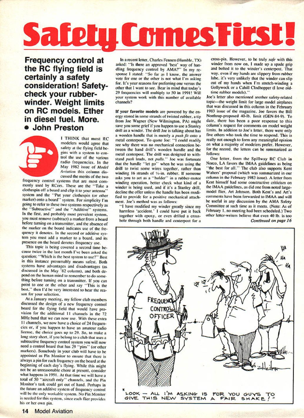S vm&sTirst Frequency control RC flying field certainly safety consideration Safetycheck rubberwinder Weight limits RC models Ether diesel fuel John Preston THINK RC modelers would agree safety flying field gins system con trol use various radio frequencies May 1982 issue Model Aviation column dis cussed merits two frequency control systems com monly used RCers Take clothespin off board clip antenna system Put clothespin other marker onto board system simplicity Im going refer two systems respectively Subtractive Additive systems first probably prevalent system must remove subtract marker board before tuming transmitter absence marker board indicates use fre quency denotes second additive sys tem must add marker board its presence board denotes frequency use topic being covered second time because twice last month Ive asked question Which best system use Best instance presumably means safest Both systems have advantages disadvantages discussed May 82 column both de pend human mind remember some thing before tuming transmitter can point other say best Id very interested hear rea son selection January meeting fellow club members discussed design new frequency control board flying field would have pro vision additional II channels 72 MHz band can now use extra II channels now have choice 24 frequen cies happen have amateur radio license choice goes up 29 So make long story short belong club uses subtractive frequency control system will now need control board has 29 pins other markers Somebody club will have appointed Pin Monitor ensure always pin frequency board beginning days flying might unreasonable chore present consider what happens 1991 time will have total 50 aircraft channels Pin Monitors task could get out hand Perhaps future additive system frequency control will workable system No Pin Monitor needed system since flier provides own pin recent letter Charles Fennen Humble TX asked approved best way han dling frequency control AMA re sponse stated So far know answer vote other what Im asking Its reasons preferring versus other want see Bear mind todays 29 frequencies will multiply 50 1991 Will system work number available channels favorite models powered en ergy stored some strands twisted rubber tip Joe Wagner New Wilmington PA might save some grief happen use Stanley drill winder drill Joe talking about has wooden handle merely push fit onto metal centerpost quote Joe could readily see no mechanical connection tween hand drills wooden handle metal centerpost drill designed stand push loads pulls Joe fortunate handle let go using drill twist some wires together rather winding 16 strands -in rubber someone asks act holder rubber-motor winding operation better check what kind winder being used its Stanley drill decline offer unless handle has modi fied provide positive mechanical attach ment Joes method follows have modified winder greatly since harmless accident could have put back together epoxy drilled crosshole through both handle centerpost cross-pin However truly safe winder now made up spade grip bolted winders centerpost way hands slippery rubber lube its very unlikely winder can slip out hands Im stretch-winding Gollywock Cahill Clodhopper love oldtime rubber models Joes letter also mentioned another safety-related topicthe weight limit large model airplanes discussed column February 1983 issue magazine Joe favors Bill Northrop-proposed 40-lb limit GEN-84-9 date has poor response columns request commens model weight limits addition Joes letter five others took time respond really enough form meaningful opinion what majority modelers prefer However record letters can summarized follows letter Spillway RC Club Norco LA favors IMAA guidelines being best club also supports Kent Walters proposal summarized column February 1983 issue letter Kent himself some constructive criticism IMAA guidelines did noted largemodel flier Art Johnson Both Kents Arts comments have forwarded IMAA will useful discussion AMA Safety Committee such time meets Note As February 1 no meeting seheduled Two other letter-writers believe 40 lb too Continued page 16 /IJA 1 00K IM AlcZlNCa- IS FOR YOU G-UyS TO GIVE TI4tS l-JE.W SYSTEM FAIR -~- 14 Model Aviation 0 Top Quality Name Can Depend 4-40 STEEL KWIK-LINKS 4 4-40 links con structed top quality spring steel control linkage hook-ups Cat No 3042 $100 DU-BRO 4-40 KWIK-LINKS 12 rod17 included p7 / Cal No 306$ 75 ea NEKEL PLATED SOLDER LINKS new 4-40 solder links nickel plated easy soldering Cat No 305 2 $100 SMALL NYLON HINGESSTANDARD NYLON HINGESHEAVY DUTY 1/4 scale HINGES Easy install precisionStrong smooth andBuilt br heavy load DUeBRO molded rigid nylon hingesas easy install as-heavy duty hinges ideal blash tree lockedthe small the1/4 scale applications checked tor F y duty hinges use removable 0 0 0 smoothness thel sixCC qpj-3/64 dia cotter pin factoryholes etormax-- holding0 0 0 0Cc Cat No 1186 perpk $1 00Cat No 116 6 perpkg $110Cat No 257 Cat No 1i915 per ph Si 95Cal No 117 15 per ph $24915 per ph$375 DUeBROS COMPLETE SELECTION OF BRASS PLATED DURA-COLLARS Enough stock threads will strip can re-worked other uses Both heavy duty regular collar sets complete Allen Wrench Cat No 244 1/4243 141 3/IS Q139 1/8 138 3/32 137 IllS 4O-5/32 kHeawydutv $1 00-2perset J-$S0perset setsof4 ] HEAVY DUTY 440 BALL LINK Cat No 259 Shown actual size new hefty ball link perfect 1/4 scale application Set includes heavy duty nylon socket 5 pIece set $125 complete switch KWIK-SWITCH MOUNT mounting set Install battery switch anywhere fuse age minutes drill ing 3/1 6 hole CatNo203$13 4sf us DUOBRO SNAP-ON BALL LINKS ll Bolt-on links threaded links links rivit shafts take care misalignment Tough nylon link snaps holds tight Excellent offset steering servo throttle hookups Cat No 180 Cat No 181 Cat No 182 Belt 585 flireaded 585 DU PRODUCTS INC 480 Bonner Road Wauconda Illinois 60084 much favor respectively 20 lb 5kg II lb Seems like Charles Fennen absolutely correct stated Ask 40 
