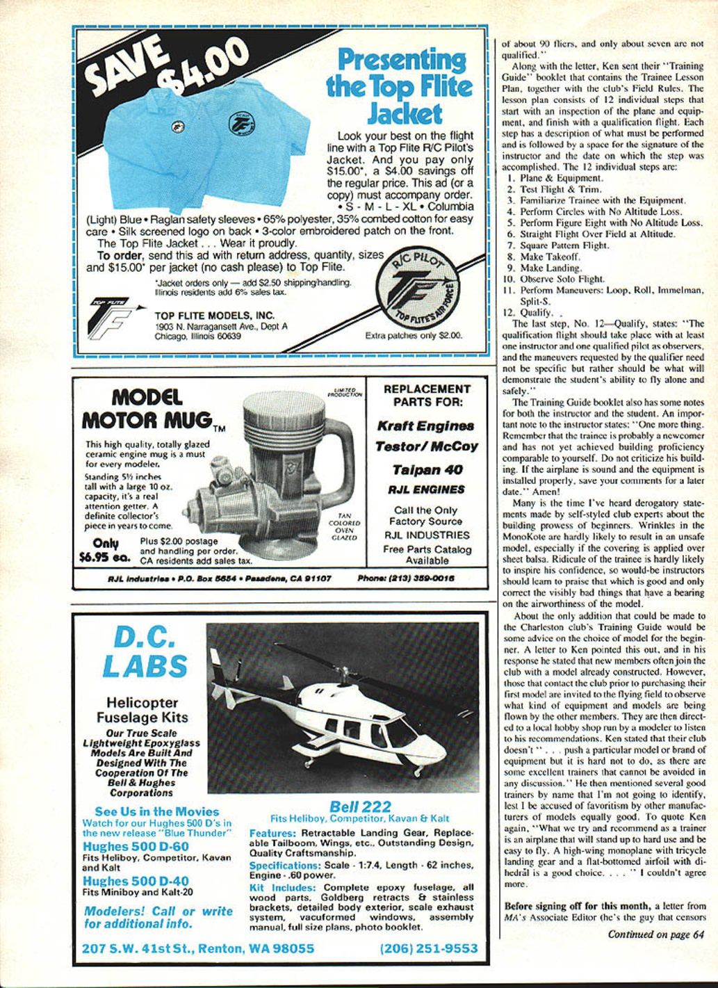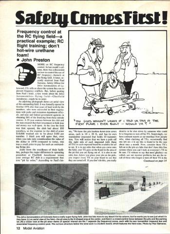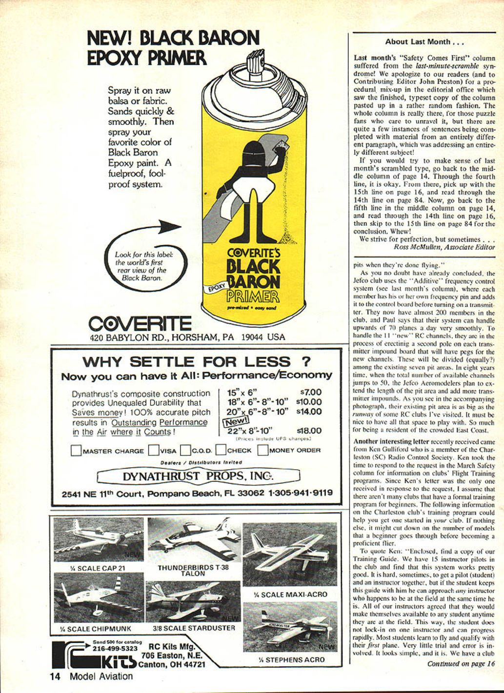 Satelu erneST list Frequency control RC flying fielda practical example RC flight training dont hot-wire urethane foam John Preston MORE RC frequency control last months col umn discussion control use RC frequency channels flying field letter re cently received Paul Samaras Safety Officer Jefco Aeromodelers La kewood CO tells us about system use prevent frequency conflicts before quoting Pauls letter few words about Jefco Aeromodelers flying fieldChatfield Aerodromemight order An adjoining photograph shows aerial view outstanding field formally opened October 1978 after four years hard work members successful negotia tions parks recreation department offici als state federal govemment agencies obtaining 50% financing outside sources 25-year contract between club state ensured investment both time money well-spent time field first opened club about 100 members expense club some $10000 worked out about $100 per member think will agree take consideration value dollar 1978 compared today small price pay such outstand ing flying site Aside excellence facill ties perhaps major difference operating procedure Chatfield Aerodrome versus average RC club requirement pit color According Pauls letter have pits broken down seven areas 10 x 20 ft has its own transmitter impound holds 10 transmit ters will notice have pole off right side impound three aH TXs impound board available see rules come onto field TX goes board area pit flying out also rules before place pin pole inspect TX board see tumed off dont really deserve shot down someone could kve forgotten tum off TX Surprisingly have constant reports meetings people checking TXs occasionally find left onId say found case about once month Now consider TXs left pits clubs dont have fine system cant look everyones TX sure Id venture say glitchesso calledare receiver problems re sult forgot turn off TX Continued page 14 Jefco Aeromodelers Colorado have really super flying field John has lots say about flis column wants see lust what have L aerial view fieldthe pit area U-shaped area center theres crowd-control fence between pits parking lot R closer look pit areaitems special interest 7 separate frequency zones its own transmitter impound box associated frequency-control post curious structure below wind sock bulletin board features field rules Photo Paul Samaras 12 Model Aviation I4 4111 VOLA CYUVS WOULDIJT LAUG4I IF T5L1 YA THl IS FlST PLANE 1 EV BUILT LD YA BLACK BARON EPOXY PPJMER Spray raw balsa fabric Sands quickly & smoothly spray favorite color Black Baron Epoxy paint fuelproof foolproof system Look labelQ/JTE3 worlds first BLK rear view Black Baron 0O0 C0VERITE 420 BABYLON RD HORSHAM PA 19044 USA WHY SETTLE FOR LESS can have Perforrnanc/cOnomy s700 si 000 $1400 15x 6 18x 6- 8 10 __________20x 6-8- 10 ________ _________y4eW __ __ _________22x 810 Si 800 Phces inc5de US charges D MASTER CHARGE ZVISA DCOD DOHECK fIMONEY ORDER Dealers / DistrIbutOrS Invited DYNATHRUST PROPS INO 541 NE 11w Court Pompano Beach FL 33062 1305941 9119 Dynathrusts composite construction provides Unequaled Durability Saes money 100% accurate pitch results Outstanding Pertormance Air Counts About Last Month. Last months Safety comes First column suffered last-minute-scramble syn drome apologize readers Conmbuting Editor John Preston pro cedural mix-up editorial office saw finished typeset copy column pasted up rather random fashion whole column really puzzle fans care unravel quite few instances sentences being com pleted material entirely differ ent paragraph addressing entire ly different subject would try make sense last months scrambled type go hack mid dle column page 14 Through fourth line okay pick up 15th line page 16 read through 14th line page 84 Now go back fifth line middle column page 14 read through 14th line page 16 skip 15th line page 84 conclusion Whew strive perfection sometimes Ross McMullen Associate Editor pits theyre done flying As no doubt have already concluded Jefco club uses Additive frequency control system see last months column member has own frequency pin adds control board before tuming transmit ter now have almost 200 members club Paul says system can handle upwards 70 planes day very smoothly handle II new RC channels process erectinig second pole trans mitter impound board will have pegs new channels will divided equally among existing seven pit areas eight years time total number available channels jumps 50 Jefco Aeromodelers plan ex tend length pit area add trans mitter impounds As see accompanying photograph existing pit area big runwov some RC clubs Ive visited must nice have space play So much being resident crowded East Coast Another interesting letter recently received came Ken Gulliford member Char leston SC Radio Control Society Ken took time respond request March Safety column information clubs Flight Training programs Since Kens letter received response request assume arent clubs have formal training program beginners following information Charleston clubs training program could help get started club nothing else might cut down number models beginner goes through before becoming proficient flier quote Ken Enclosed find copy Training Guide have 15 instructor pilots club find system works pretty good hard sometimes get pilot student instructor together student keeps guide him can approach instructor happens field same time instructors agreed would make themselves available student anytime field way student does lock-in instructor can progress rapidly Most students leam fly qualify first plane Very little trial error tn volved looks simple have club con ilnued page 16 ____________ Send 50t casatog 2164995323 RC Kits Mfg OH 44721 STEPHENS ACRO 706 Easton NE 14 Model Aviation Presenting Top Flite Jacket Look best flight line Top Flite R/G Pilots Jacket pay $1500 $400 savings off regular price ad copy must accompany order S M L XL mbia Light Blue Ra9IdI safety sleeves polyester 35% combed cotton easy care screened logo back lor embro