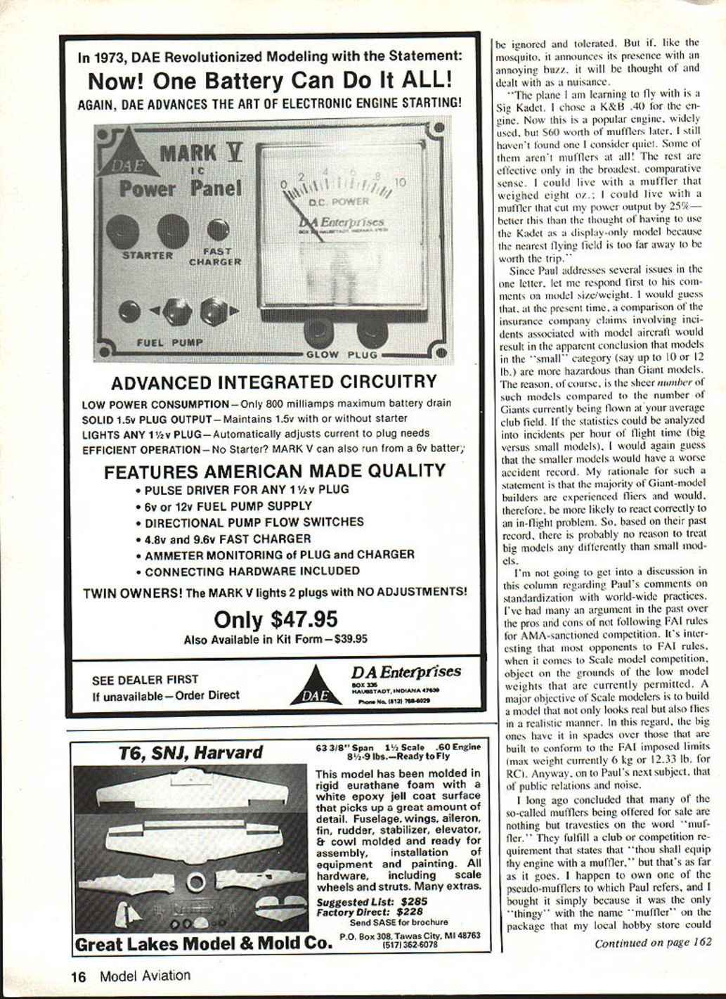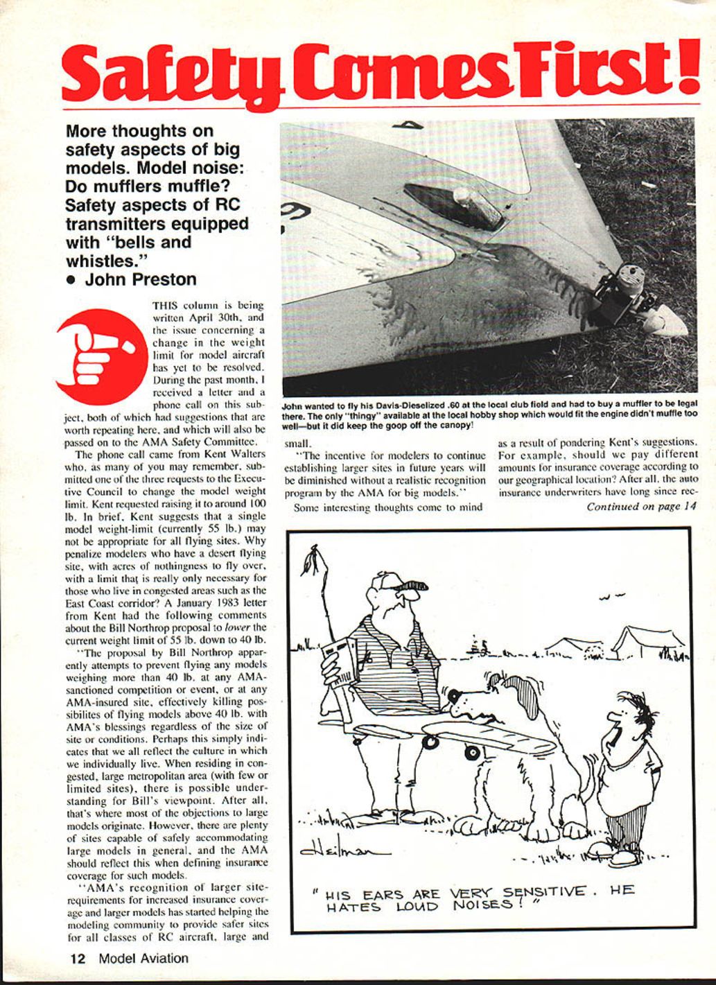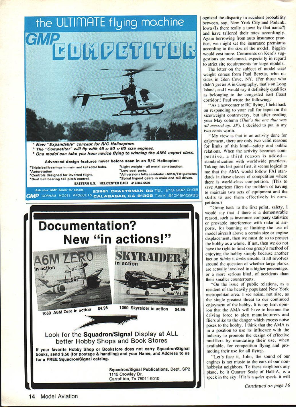 ____first Svines thoughts safety aspects big models Model noise mufflers muffle Safety aspects RC transmitters equipped bells 0 John Preston THIS column being written April 30th issue concerning change weight limit model aircraft has yet resolved During past month received letter phone call sub ject both suggestions worth repeating will also passed AMA Safety Committee phone call came Kent Walters may remember sub mitted three requests Execu tive Council change model weight limit Kent requested raising around 100 lb brief Kent suggests single model weight-limit currently 55 lb may appropriate flying sites penalize modelers have desert flying site acres nothingness fly over limit thai really necessary live congested areas such East Coast corridor January 1983 letter Kent following comments about Bill Northrop proposal lower current weight limit 55 lb down 40 lb proposal Bill Northrop appar ently attempts prevent flying models weighing 40 lb AMAsanctioned competition event AMA-insured site effectively killing pos sibilites flying models above 40 lb AMAs blessings regardless size site conditions Perhaps simply indi cates reflect culture individually live residing con gested large metropolitan area few limited sites possible under standing Bills viewpoint After thats objections large models originate However plenty sites capable safely accommodating large models general AMA should reflect defining insuraixe coverage such models AMAs recognition larger siterequirements increased insurance cover age larger models has started helping modeling community provide safer sites classes RC aircraft large small incentive modelers continue establishing larger sites future years will diminished realistic recognition program AMA big models Some interesting thoughts come mind result pondering Kents suggestions example should pay different amounts insurance coverage according geographical location After auto insurance underwriters have long since rec Continued page 14 12 Model Aviation John wanted fly Davis-Dieselized 60 local club field buy muffler legal thingy available local hobby shop would fit engine didnt muffle too wellbut did keep goop off canopy K - 5-- NIS A1S AE V SNS1TIVE NAmES LOIAD NOISES ognized disparity accident probability between say New York City Podunk Iowa really town name have tailored rates accordingly Again borrowing auto insurance prac tice might set insurance premiums according size model Biggies would cost Comments Kents sug gestions welcomed especially regard strict site requirements large models letter subject model size weight comes Paul Beretta re sides Glen Cove NY didnt get Geography thats Long Island would say definitely qualifies belonging congested East Coast corridor Paul wrote following As newcomer RC flying held back responding call input size/weight controversy after reading May column Thats messed op JP decided put two cents worth view activity done enjoyment two valid reasons limits kindsafety public relations activity becomes com petitive third reason addedstandardization worldwide practices Taking last point first seems logical AMA would follow FAI stan dards classes competition world-class competition save American fliers problem having maintain two sets equipment skills use effectively com petition Going back first point safety would say demonstrable reason such insurance company statistics provable interference radar air ports banning limiting use model aircraft above certain size engine displacement must protect hobby whole have right limit groups method enjoying hobby simply because another faction thinks looks unsafe revolves around question whether large planes actually involved higher percentage serious kind accidents smaller counterparts issue public relations resident heavily populated New York metropolitan area see noise size single greatest threat continued enjoyment hobby firm opin ion AMA will have become driving force alert manufacturers fliers alike danger excess noise poses hobby think AMA position use its influence industry promote design effective mufflers mandating use available competition flying pro moting use flying Lets face John sound engines music ears nonhobbyist neighbors neighbors plane Quarter Scale Half-A speck sky quiet speck will Continued page 16 14 Model Aviation O New .xpandable~ concept ror nencoprers o The Competitor will fly 45 50 060 size engines O model can take novice flying winning AMA expert class Advanced design features never before seen R/C Helicopter Triple ball bearings main tail rotor hubsLight weight l construction AutorotationLow cost parts Controls designed inverted flightA11 versions fully aerobatic FAI patterns Dual ball bearing tail pitch controlSpiral hypoid gears main tail drives EASTERN US HELICENTER EAST 4121342-5500 Documentation New actions iuou Kyraider action Look SquadronlSignal Display ALL better Hobby Shops Book Stores favorite Hobby Shop Bookstore does carry Squadron/Signal books send S50 postage & handling Name Address us FREE Squadron/Signal catalog Squadron/Signal Publications Dept SP2 1115 Crowley Dr Carrollton Tx 75011-5010 1973 DAE Revolutionized Modeling Statement Now Battery Can ALL AGAIN DAE ADVANCES THE ART OF ELECTRONIC ENGINE STARTING LOW POWER CONSUMPTIONOnly 800 milliamps maximum battery drain SOLID 15v PLUG OUTPUT Maintains 15v starter LIGHTS ANY 11/2V PLUGAutomatically adjusts current plug needs EFFICIENT OPERATION tarter MARK V can also run 6v batter FEATURES AMERICAN MADE QUALITY PULSE DRIVER FOR ANY 1v PLUG 6v 12v FUEL PUMP SUPPLY DIRECTIONAL PUMP FLOW SWITCHES 48v 96v FAST CHARGER AMMETER MONITORING PLUG CHARGER CONNECTING HARDWARE INCLUDED TWIN OWNERS MARK V lights 2 plugs NO ADJUSTMENTS Only $4795 Also Available Kit Form $3995 SEE DEALER FIRSTADA Enterprises unavailableOrder DirectMALUAOTIoANA4 Ph N 8121 7U4028 63 31 8 Span 1 Scale 60 Engine S-9 lbsReady Fly model has molded rigid eurathane foam white epoxy jell coat surface picks up great amount detail Fuselagewings aileron