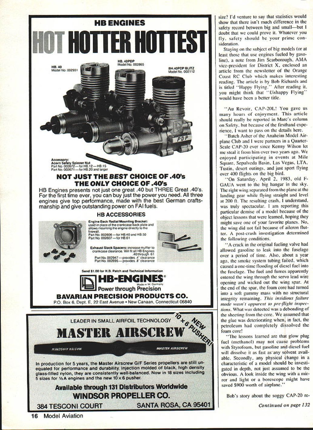 ____first Svms RC frequency control rope-and-pulley starters Big Bang ers foam wing fails flight due creeping internal destruction gasoline fuel prop dangersand word caution some types plastic pro pellers John Preston GREAT response Two topics recently discussed column have gen erated readers let ters anything else has mentioned since Safety Comes First appeared January 1980 magazine two topics Frequency Control Flight Training Programs Im trying re spond took time write now summer its difficult keep up incoming mail hap pen writers subjects have yet receive acknowl edgement apologize Let thank now providing input keeps column alive Before leaving subject frequency control Id like mention two communica tions received during last month first letter Bill Hoffmeister Field Chairman Indianapolis RC South club came up frequency control board worth men tioning club uses additive control system member has disc his/her name side word guest other Before turning transmitter mem bers disc attached peg -in shoul der bolt board corresponds frequency used photograph shows layout board mem bers name disc tells other would-be users frequency guest flying word guest would exposed however turning disc over others can see guest flying Bills board covered /4-in Lexan protect elements suggestion others may wish copy design place numerical values indi vidual channels frequencies can seen members disc board same design could also used subtractive control system color-coded removable discs placed pegs would removed substituted members disc before flying second communication frequency control comes Gold Coast Flyer newsletter Art Johnson editor gives us something think about future Ultimate Frequency Control System think present club-card-for-the pin system pretty good sport continues grow popularity may looking sophisticated way job price no object current technology offers almost foolproof way solve several problems First want authorized persons fly sitewe want tie up frequency alloted time must make sure right frequency goals can accomplished bit electronic gadgetry First club members would issued cards mag netic code card frequency board slot frequency would tied multi-frequency spot jammer 100 mw jammer would put out signal frequency board jammer would turn sunrise shut off sunset effectively preventing flying site until member inserted coded card Continued page 14 12 Model Aviation John discusses frequency-control board column month Sorry cant let see colorcircles match transmit ter flag colors hang metal tag pin take turnlike Bill Hoff meister RC42 did . / /1/ /1/7 URE FHEYE NARD TO SEEI.. ur WWEY 005T LOT LESb7 1973 DAE Revolutionized Modeling Statement Now Battery Can ALL AGAIN DAE ADVANCES THE ART OF ELECTRONIC ENGINE STARTING LOW POWER CONSUMPTIONOnly 800 milliamps maximum battery drain SOLID 15v PLUG OUTPUTMaintains 15v starter LIGHTS ANY 11/2v PLUGAutomatically adjusts current plug needs EFFICIENT OPERATION tarter MARK V can also run 6v batter FEATURES AMERICAN MADE QUALITY PULSE DRIVER FOR ANY 1 v PLUG 6v 12v FUEL PUMP SUPPLY DIRECTIONAL PUMP FLOW SWITCHES 48v 96v FAST CHARGER AMMETER MONITORING PLUG CHARGER CONNECTING HARDWARE INCLUDED TWIN OWNERS MARK V lights 2 plugs NO ADJUSTMENTS Only $4795 Also Available Kit Form 5 SEE DEALER FIRSTADA Enterpflses unavailableOrder DirecthjdA ft. N. 3lZ 7U42S * * Long Engine Life * * Use BRU LINE Air Cleaner Completely Fuel Proof Nylon Rubber Parts Cat No 102 Air Cleaner Coarse $225 Cat No 202 Air Cleaner Fine $225 Replacement Inserts Cat No 104 PkJ2 InsertsCoarse $195 Cat No 204 Pkl2 Inserts Fine $195 FITS MOST ENGINES 25and UP SEE YOUR LOCAL HOBBY DEALER IF UNAVAILABLE LOCALLY SEND TO Add 75C shippingMichigan residents add 4% sales tax Bru Line Industries Inc PO Box 3786 Center Line Michigan 48015 frequency choice code would turn off jammer 15 minutes flight time could increased less busy periods warning signal would sound two minutes before time up light would flash frequency use light would go out card re moved signalling frequency available next flier such system feasible Sure think club will installing next week other hand would certainly keep everyone within present site rules wish comment Arts futuristic system suggest write him AMA HQ rather As said before Im already way behind responses mailand wasnt wouldnt touch proverbial 10-ft pole Coming back reality turning subject Giant models letter last month came other Al Big Bird Alman according business card specializes Gimbals Hot Stuffed Judges Bribed Inflight Wing Removals Buddy Cords Cut Batteries Drained Schnuerle Ported Windsocks Al no doubt know also writes Big Bird column Model Builder magazine July 1983 issue touches same safety issue letter namely use rope starters large en gines Over Al Something feel gross safety vio lation no has yet mentioned fi nally did address problem July column practice some have hard-starting hand Evras Ropers utilize rope starter idea having pulley immediately front back prop rope close sends chills up down spine Someone going get hacked death handle end rope may very well end up being bystander What weapon rope would make being whirled around spinning prop Gad AlsoI feel some Big Bird lovers have slacked off bit regards safety think due getting swelled head statements past year about great safety record has compared other RCers Ive included bit too July column first saw magazine picture modeler rope-starting big engine similar thoughts Als However being Big Bird flier didnt feel qualified make comment Now have experts field way make big engine pop use pulley rope starter let us Al & say forewarned tn regard Als comment about Big Bird lovers becoming somewhat lax safety because past good re cord dont think have data shows what record really exam ple know RCers fly big models versus models conventional Continued page 16 14 Model Aviation ADVANCED INTEGRATED CIRCUITRY U E~ ILK NUl lUll NOT JUST THE BEST CHOICE OF 40s THE ONLY CHOICE OF 40s HB Engines presents just 9reat 