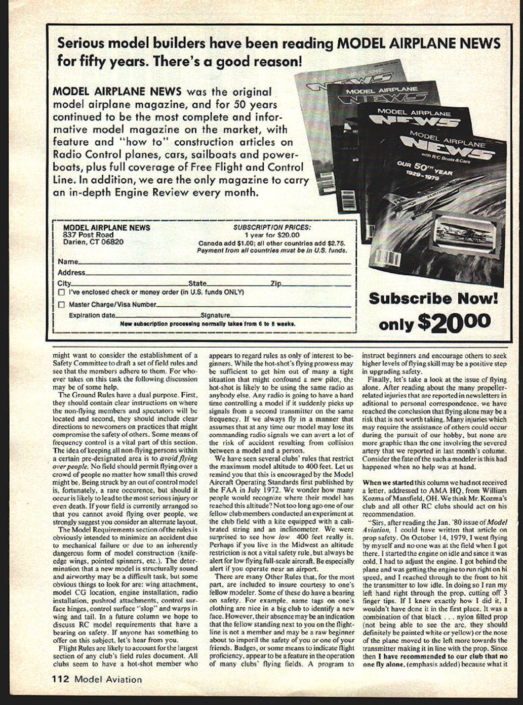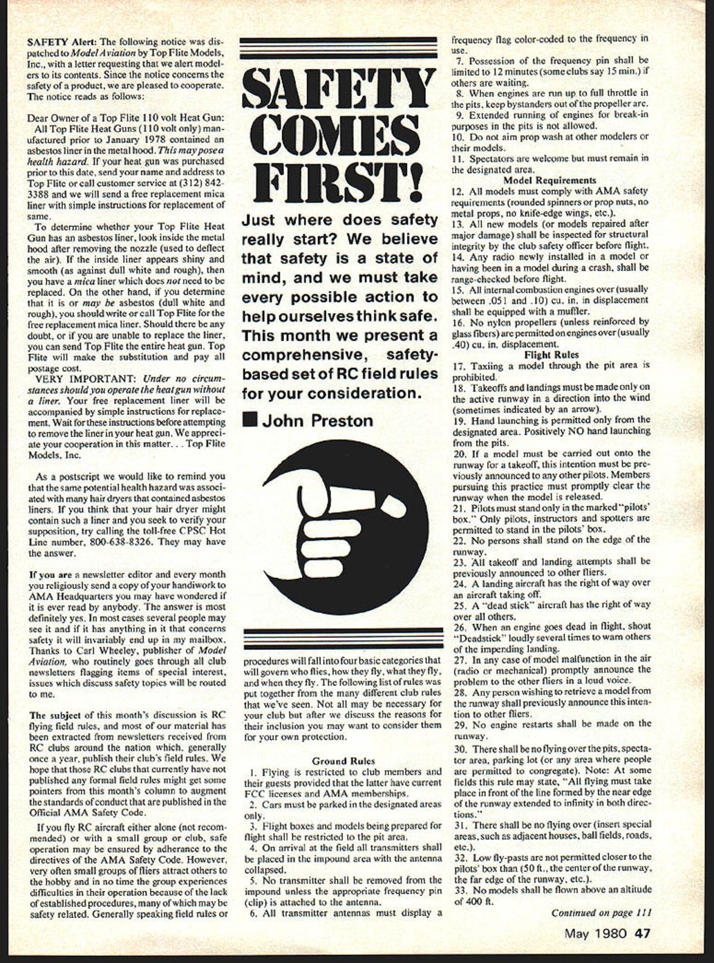 SAFETY Alert following notice dis patched ModelAviation Top Flite Models Inc letter requesting alert model ers its contents Since notice concerns safety product pleased cooperate notice reads follows Dear Owner Top Flite 110 volt Heat Gun Top Flite Heat Guns 110 volt man ufactured prior January 1978 contained asbestos liner metal hood may pose health hazard heat gun purchased prior date send name address Top Flite call customer service 312 8423388 will send free replacement mica liner simple instructions replacement same determine whether Top Flite Heat Gun has asbestos liner look inside metal hood after removing nozzle used deflect air inside liner appears shiny smooth against dull white rough have mica liner does need replaced other hand determine may asbestos dull white rough should write call Top Flite free replacement mica liner Should doubt unable replace liner can send Top Flite entire heat gun Top Flite will make substitution pay postage cost VERY IMPORTANT Under no circum stances should operate heat gun liner free replacement liner will accompanied simple instructions replace ment Wait instructions before attempting remove liner heat gun appreci ate cooperation matter. Top Flite Models Inc As postscript would like remind same potential health hazard associ ated hair dryers contained asbestos liners think hair dryer might contain such liner seek verify supposition try calling toll-free CPSC Hot Line number 800-638-8326 may have answer newsletter editor month religiously send copy handiwork AMA Headquarters may have wondered ever read anybody answer definitely yes cases several people may see it has anything concerns safety will invariably end up mailbox Thanks Carl Wheeley publisher Model Aviation routinely goes through club newsletters flagging items special interest issues discuss safety topics will routed subject months discussion RC flying field rules material has extracted newsletters received RC clubs around nation generally once year publish clubs field rules hope RC clubs currently have published formal field rules might get some pointers months column augment standards conduct published Official AMA Safety Code fly RC aircraft either alone recom mended small group club safe operation may ensured adherance directives AMA Safety Code However very often small groups fliers attract others hobby no time group experiences difficulties operation because lack established procedures may safety related Generally speaking field rules AILIi COMES FIRST Just does safety really start believe safety state mind must take possible action help ourselves think safe month present comprehensive safetybased set RC field rules consideration U John Preston procedures will fall four basic categories will govern flies fly what fly fly following list rules put together different club rules weve seen may necessary club after discuss reasons inclusion may want consider own protection Ground Rules 1 Flying restricted club members guests provided latter have current FCC licenses AMA memberships 2 Cars must parked designated areas 3 Flight boxes models being prepared flight shall restricted pit area 4 On arrival field transmitters shall placed impound area antenna collapsed 5 No transmitter shall removed impound unless appropriate frequency pin clip attached antenna 6 All transmitter antennas must display frequency flag color-coded frequency use 7 Possession frequency pin shall limited 12 minutes some clubs say 15 mm others waiting 8 When engines run up full throttle pits keep bystanders Out propeller arc 9 Extended running engines break-in purposes pits allowed 10 Do aim prop wash other modelers models 11 Spectators welcome must remain designated area Model Requirements 12 All models must comply AMA safety requirements rounded spinners prop nuts no metal props no knife-edge wings etc 13 All new models models repaired after major damage shall inspected structural integrity club safety officer before flight 14 Any radio newly installed model having model during crash shall range-checked before flight 15 All internal combustion engines over usually between 051 10 cu in displacement shall equipped muffler 16 No nylon propellers unless reinforced giass fibers permitted engines over usually 40 cu displacement Flight Rules 17 Taxiing model through pit area prohibited 18 Takeoffs landings must made active runway direction wind sometimes indicated arrow 19 Hand launching permitted designated area Positively NO hand launching pits 20 If model must carried out onto runway takeoff intention must pre viously announced other pilots Members pursuing practice must promptly clear runway model released 21 Pilots must stand marked pilots box Only pilots instructors spotters permitted stand pilots box 22 No persons shall stand edge runway 23 All takeoff landing attempts shall previously announced other fliers 24 A landing aircraft has right way over aircraft taking off 25 A dead stick aircraft has right way over others 26 When engine goes dead flight shout Deadstick loudly several times warn others impending landing 27 In case model malfunction air radio mechanical promptly announce problem other fliers loud voice 28 Any person wishing retrieve model runway shall previously announce inten tion other fliers 29 No engine restarts shall made runway 30 There shall no flying over pits specta tor area parking lot area people permitted congregate Note some fields rule may state flying must take place front line formed near edge runway extended infinity both direc tions 31 There shall no flying over insert special areas such adjacent houses ball fields roads etc 32 Low fly-pasts permitted closer pilots box 50 ft center runway far edge runway etc 33 No models shall flown above altitude 400 ft Continued page 111 May 1980 47 THE TRIPLE THREAT Del N QUIKRAY-500 has eneered meet need model could built fast very strong meet requirements AMA Sport Pylon Events Quicky 500 Pylon Racing Fun Fly Events around Sport Flying Trainer general P