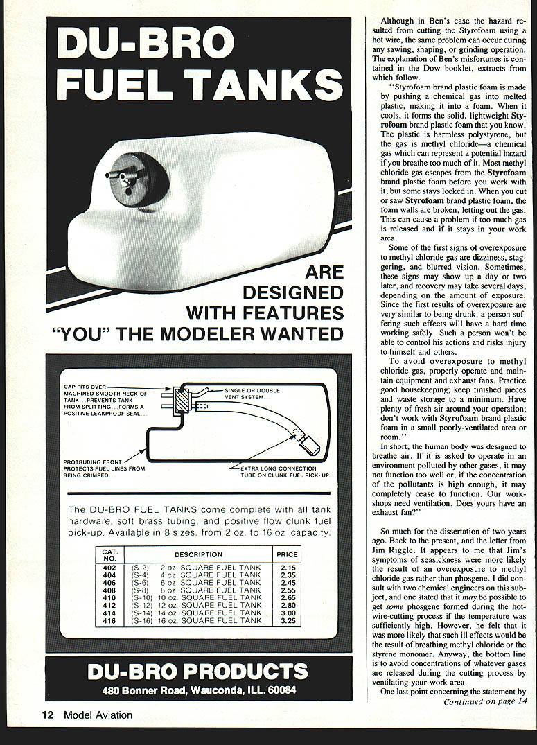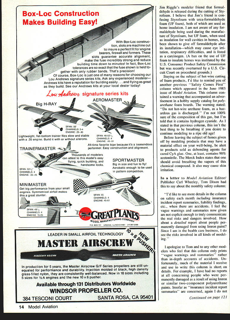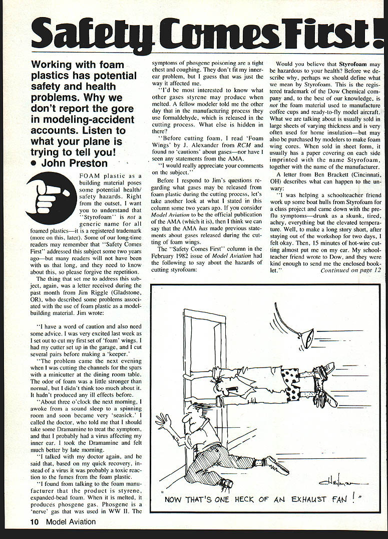 SatE bnwsflrst w Working foam plastics has potential safety health problems dont report gore modeling-accident accounts Listen what plane trying tell John Preston FOAM plastic building material poses some potential health safety hazards Right outset want understand Styrofoam generic name foamed plasticsit registered trademark later Some long-time readers may remember Safety Comes First addressed subject some two years agobut readers will have us long need know about please forgive repetition thing set address sub ject again letter received during past month Jim Riggle Gladstone OR described some problems associ ated use foam plastic modelbuilding material Jim wrote have word caution also need some advice very excited last week set out cut first set foam wings cutter set up garage cut several pairs before making keeper problem came next evening cutting channels spars minicutter dining room table odor foam little stronger normal didnt think too much about hadnt produced ill effects before About three oclock next morning awoke sound sleep spinning room soon became very seasick called doctor told should take some Dramamine treat symptom probably virus affecting inner ear took Dramamine felt much better late morning talked doctor again said based quick recovery stead virus probably toxic reac tion fumes foam plastic found talking foam manu facturer product styrene expanded-bead foam melted produces phosgene gas Phosgene nerve gas used WW II symptoms phosgene poisoning tight chest coughing dont fit innerear problem guess just way affected id interested know what other gases styrene may produce melted fellow modeler told other day manufacturing process use formaldehyde released cutting process What else hidden Before cutting foam read Foam Wings Alexander RCM found no cautions about gasesnor have seen statements AMA would really appreciate comments subject Before respond Jims questions re garding what gases may released foam plastic during cutting process lets take another look what stated column some two years ago consider Model Aviation official publication AMA think can say AMA has made previous state ments about gases released during cut ting foam wings Safety Comes First column February 1982 issue Model Aviation following say about hazards cutting styrofoam Would believe Styrofoam may hazardous health Before de scribe perhaps should define what mean Styrofoam regis tered trademark Dow Chemical com pany best knowledge foam material used manufacture coffee cups ready-to-fly model aircraft What talking about usually sold large sheets varying thickness very often used home insulationbut may also purchased modelers make foam wing cores sold sheet form usually has paper covering side imprinted name Styrofoam together name manufacturer letter Ben Brackett Cincinnati OH describes what can happen un wary helping schoolteacher friend work up some boat hulls Styrofoam class project came down pre flu symptomsdrunk skunk tired achey everything elevated tempera ture Well make long story short after staying out workshop two days felt okay 15 minutes hot-wire cut ting almost put ear school teacher friend wrote Dow kind enough send enclosed book letContinued page 12 N 4 NOW TF4ATS ONE HECK OF EHAL4T fAg 10 Model Aviation II Although Bens case hazard re sulted cutting Styrofoam using hot wire same problem can occur during sawing shaping grinding operation explanation Bens misfortunes con tained Dow booklet extracts follow Styrofoam brand plastic foam made pushing chemical gas melted plastic making foam cools forms solid lightweight Sty rofoam brand plastic foam know plastic hannless polystyrene gas methyl chloridea chemical gas can represent potential hazard breathe too much Most methyl chloride gas escapes Styrofoam brand plastic foam before work some stays locked cut saw Styrofoam brand plastic foam foam walls broken letting out gas can cause problem too much gas released stays work area Some first signs overexposure methyl chloride gas dizziness stag gering blurred vision Sometimes signs may show up day two later recovery may take several days depending amount exposure Since first results overexposure very similar being drunk person suf fering such effects will have hard time working safely Such person wont able control actions risks injury himself others avoid overexposure methyl chloride gas properly operate main tain equipment exhaust fans Practice good housekeeping keep finished pieces waste storage minimum Have plenty fresh air around operation dont work Styrofoam brand plastic foam small poorly-ventilated area room short human body designed breathe air asked operate environment polluted other gases may function too well concentration pollutants high enough may completely cease function work shops need ventilation Docs yours have exhaust fan So much dissertation two years ago Back present letter Jim Riggle appears Jims symptoms seasickness likely result overexposure methyl chloride gas rather phosgene did con sult two chemical engineers sub ject stated may possible get some phosgene formed during hotwire-cutting process temperature sufficiently high However felt likely such ill effects would result breathing methyl chloride styrene monomer Anyway bottom line avoid concentrations whatever gases released during cutting process ventilating work area last point concerning statement Continued page 14 12 Model Aviation WITH FEATURES YOU THE MODELER WANTED Box-Loc construc tion slots machine cut insure perfect fitfor engine bearers firewall farmers slots guarantee accurate alignment make fuse incredibly strong reduce building time down minutes fact Box-Loc tolerances exact fuse shown held gether rubber bands Thats precision course Box-Loc just reasons choosing Lou Andrews signature series kits Ask experienced modeler Andrews kits have reputation building easily. flying great build See Andrews kits local dealer today ht 44i signature series kits N SPAN 56 CHANNELS 3-4 ENGINE 25-40 Lightweight flat-bottom tr