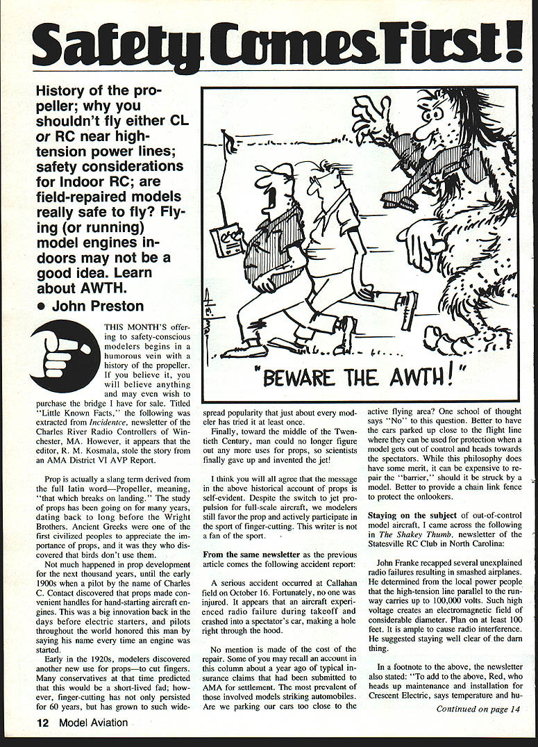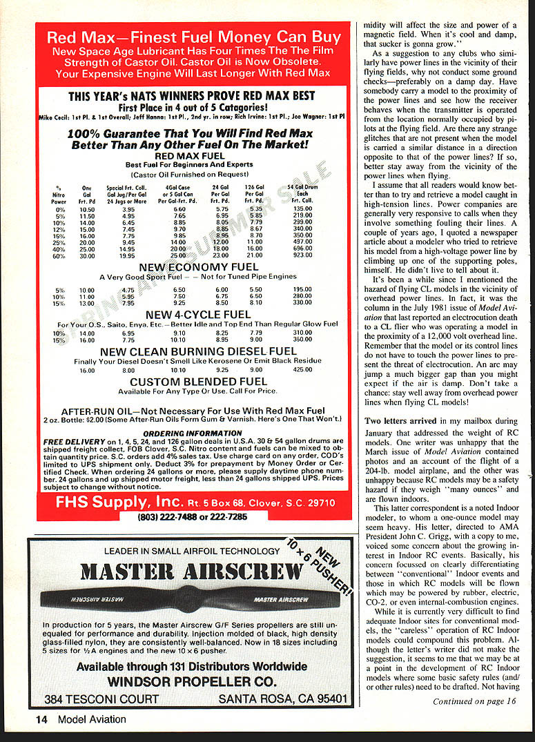 S vnwsfirsl History pro peller shouldnt fly either CL RC near hightension power lines safety considerations Indoor RC field-repaired models really safe fly Fly ing running model engines doors may good idea Learn about AWTH John Preston THIS MONTHS offer ing safety-conscious modelers begins humorous vein history propeller believe will believe anything may wish purchase bridge have sale Titled Little Known Facts following extracted Incidentce newsletter Charles River Radio Controllers Win chester MA However appears editor R M Kosmala stole story AMA District VI AVP Report Prop actually slang term derived full latin wordPropeller meaning breaks landing study props has going years dating back long before Wright Brothers Ancient Greeks first civilized peoples appreciate im portance props dis covered birds dont use much happened prop development next thousand years until early 1900s pilot name Charles C Contact discovered props made con venient handles hand-starting aircraft en gines big innovation back days before electric starters pilots throughout world honored man saying name time engine started Early 1920s modelers discovered another new use propsto cut fingers conservatives time predicted would short-lived fad ever finger-cutting has persisted 60 years has grown such wide EWAIE Ti4E AWTU active flying area school thought says No question Better have cars parked up close flight line can used protection model gets out control heads towards spectators philosophy does have some merit can expensive re pair barrier should struck model Better provide chain link fence protect onlookers Staying subject out-of-control model aircraft came across following Shakey Thumb newsletter Statesville RC Club North Carolina John Franke recapped several unexplained radio failures resulting smashed airplanes determined local power people high-tension line parallel run way carries up 100000 volts Such high voltage creates electromagnetic field considerable diameter Plan least 100 feet ample cause radio interference suggested staying well clear darn thing footnote above newsletter also stated add above Red heads up maintenance installation Crescent Electric says temperature hu Continued page 14 spread popularity just about mod eler has tried least once Finally toward middle Twen tieth Century man could no longer figure out uses props scientists finally gave up invented jet think will agree message above historical account props self-evident Despite switch jet pro pulsion full-scale aircraft modelers still favor prop actively participate sport finger-cutting writer fan sport same newsletter previous article comes following accident report serious accident occurred Callahan field October 16 Fortunately no injured appears aircraft experi enced radio failure during takeoff crashed spectators car making hole right through hood No mention made cost repair Some may recall account column about year ago typical surance claims submitted AMA settlement prevalent involved models striking automobiles Are parking cars too close 12 Model Aviation 100% Guarantee Will Find Red Max Better Any Other Fuel Market RED MAX FUEL Best Fuel Beginners Experts Castor Oil Furnished Request 54 Gel Drum Sach Fri Coil 13500 21900 29900 34000 36000 49700 69600 92300 % OneSpecial Fri Coil Case24 Gal126 Gal Nitra GalGal Jug/Per Gal 5 Gal CanPer GalPer Gal Power Fri Pd 24 Jugs Per Gui-Fri Pd Fri Pd Fri Pd 0%1050395660575535 5%1150495765695585 10/o1400645885805779 12%1500745970885867 15%1600775985895870 25%2000945140012001100 40%25001495200018001600 60%30001995250023002100 NEW ECONOMY FUEL Very Good Sport Fuel ed Pipe Engines 50/,100047565060055019500 10%110059575067565028000 15% 1300 795 925 850 810 33000 NEW 4-CYCLE FUEL OS Saito Enya EtcBetter Idle Top End Regular Glow Fuel 10%14006959 1082577931000 15%1600775101089590036000 NEW CLEAN BURNING DIESELFUEL Finally Diesel Doesnt Smell Like Kerosene Emit Black Residue 1600800101092590042500 CUSTOM BLENDED FUEL Available Any Type Use Call Price AFTER-RUN OILNot Necessary Use Red Max Fuel 2 oz Bottle $200 Some After-Run Oils Form Gum & Varnish Heres Wont ORDERING INFORMATION FREE DELIVERY 1 4 5 24 126 gallon deals USA 30 & 54 gallon drums shipped freight collect FOB Clover SC Nitro content fuels can mixed ob tain quantity price SC orders add 4% sales tax Use charge card order CODs limited UPS shipment Deduct 3% prepayment Money Order Cer tified Check ordering 24 gallons please supply daytime phone num ber 24 gallons up shipped motor freight less 24 gallons shipped UPS Prices subject change notice j i ik midity will affect size power magnetic field its cool damp sucker gonna grow As suggestion clubs simi larly have power lines vicinity flying fields conduct some ground checkspreferably damp day Have somebody carry model proximity power lines see receiver behaves transmitter operated location normally occupied pi lots flying field Are strange glitches present model carried similar distance direction opposite power lines better stay away vicinity power lines flying assume readers would know bet ter try retrieve model caught high-tension lines Power companies generally very responsive calls involve something fouling lines couple years ago quoted newspaper article about modeler tried retrieve model high-voltage power line climbing up supporting poles himself didnt live tell about Its since mentioned hazard flying CL models vicinity overhead power lines fact column July 1981 issue Model Avi ation last reported electrocution death CL flier operating model proximity 12000 volt overhead line Remember model its control lines have touch power lines pre sent threat electrocution An arc may jump much bigger gap might expect air damp Dont take chance stay well away overhead power lines flying CL models Two letters arrived mailbox during January addressed weight RC models writer unhappy March issue Model Aviation contained photos account flight 204-lb model airplane other unhappy because RC models may safety hazard we