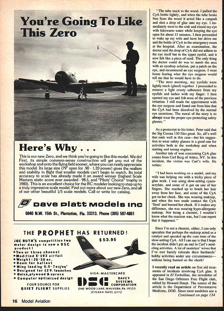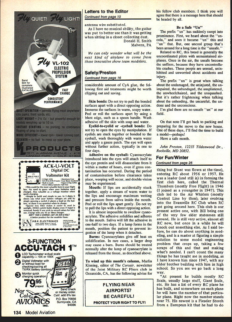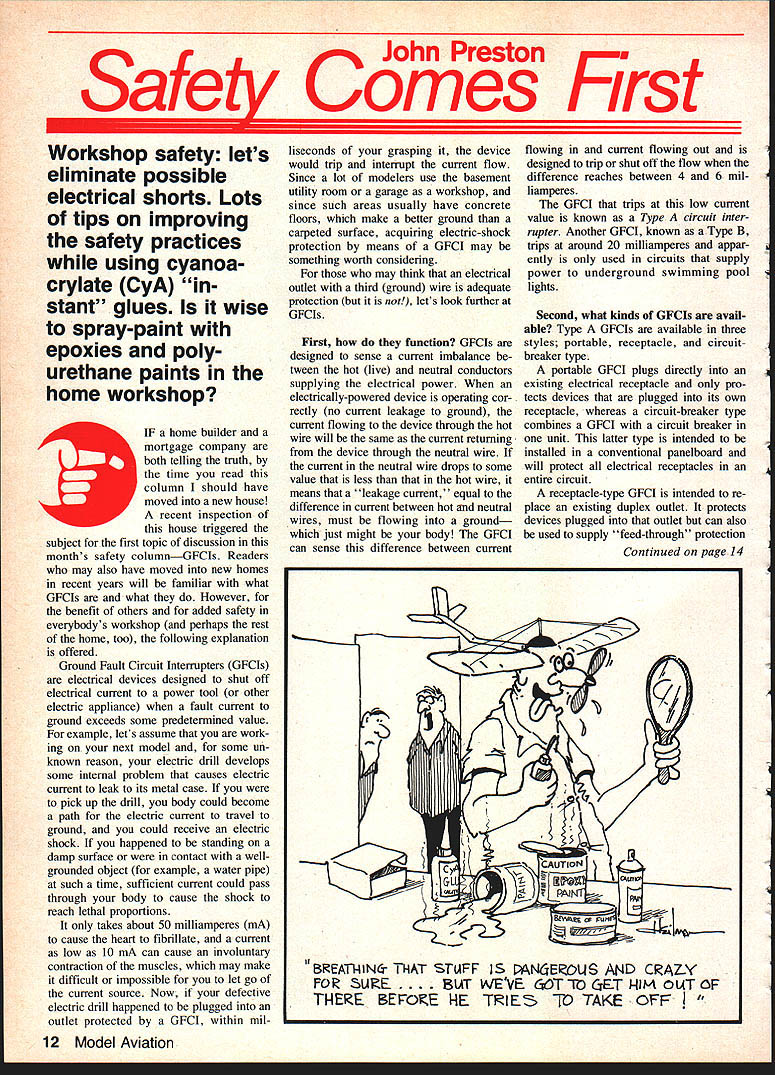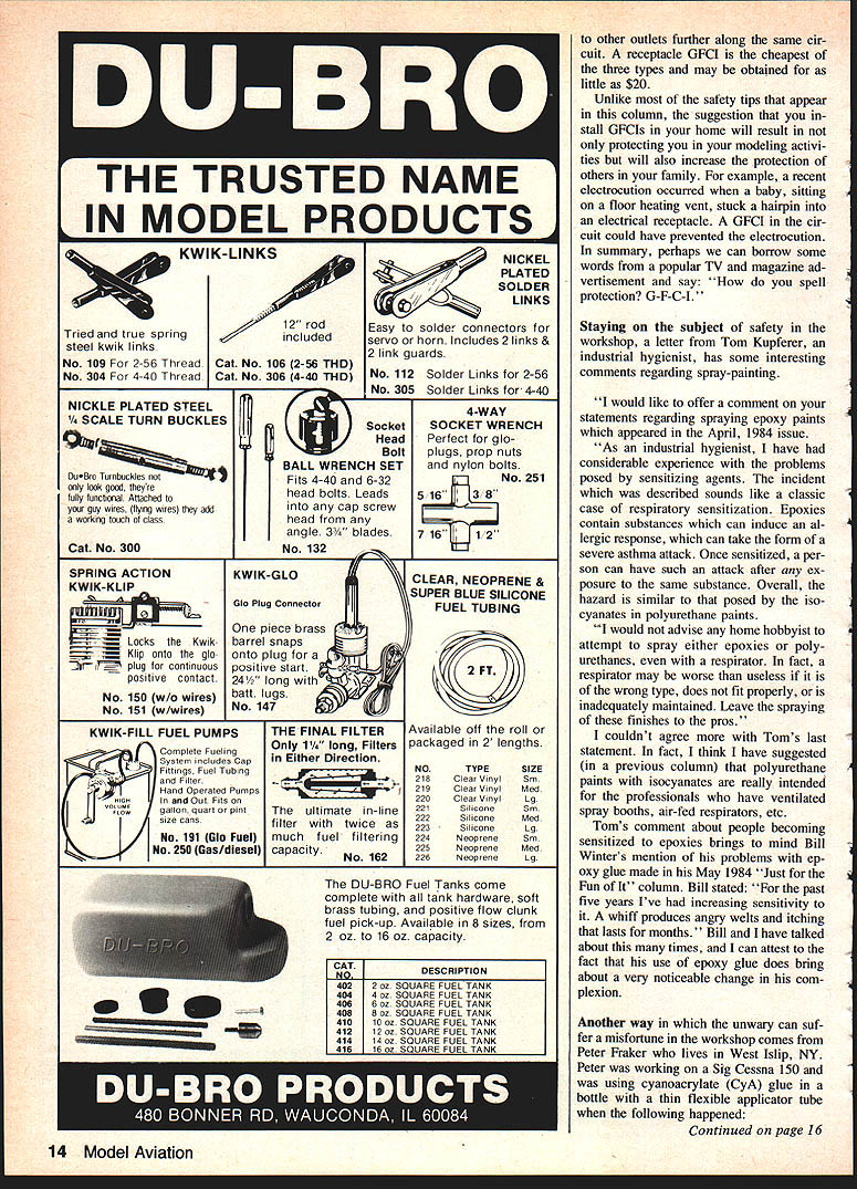ohn Preston Iirst Safety Cdmes Workshop safety lets eliminate possible electrical shorts Lots tips improving safety practices using cyanoa crylate CyA stant glues wise spray-paint epoxies poly urethane paints home workshop IF home builder mortgage company both telling truth time read column should have moved new house recent inspection house triggered subject first topic discussion months safety columnGFCIs Readers may also have moved new homes recent years will familiar what GFCIs what However benefit others added safety everybodys workshop perhaps rest home too following explanation offered Ground Fault Circuit Interrupters GFCIs electrical devices designed shut off electrical current power tool other electric appliance fault current ground exceeds some predetermined value example lets assume work ing next model some un known reason electric drill develops some internal problem causes electric current leak its metal case pick up drill body could become path electric current travel ground could receive electric shock happened standing damp surface contact wellgrounded object example water pipe such time sufficient current could pass through body cause shock reach lethal proportions takes about 50 milliamperes mA cause heart fibrillate current low 10 mA can cause involuntary contraction muscles may make difficult impossible let go current source Now defective electric drill happened plugged outlet protected GFCI within mil liseconds grasping device would trip interrupt current flow Since lot modelers use basement utility room garage workshop since such areas usually have concrete floors make better ground carpeted surface acquiring electric-shock protection means GFCI may something worth considering may think electrical outlet third ground wire adequate protection lets look further GFCIs First function GFCIs designed sense current imbalance tween hot live neutral conductors supplying electrical power electrically-powered device operating cor rectly no current leakage ground current flowing device through hot wire will same current returning device through neutral wire current neutral wire drops some value less hot wire means leakage current equal difference current between hot neutral wires must flowing ground just might body GFCI can sense difference between current flowing current flowing out designed top shut off flow difference reaches between 4 6 mil liamperes GFCI trips low current value known Type circuit inter rupter Another GFCI known Type B trips around 20 milliamperes appar ently used circuits supply power underground swimming pool lights Second what kinds GFCIs avail able Type GFCIs available three styles portable receptacle circuitbreaker type portable GFCI plugs directly existing electrical receptacle pro tects devices plugged its own receptacle whereas circuit-breaker type combines GFCI circuit breaker unit latter type intended installed conventional panelboard will protect electrical receptacles entire circuit receptacle-type GFCI intended re place existing duplex outlet protects devices plugged outlet can also used supply feed-through protection Continued page 14 4 12 Model Aviation 8E c~rj r-BREATNIN- ThAT STUFF S AN4ECAJS AND CAZ.Y FOR SURE.. BUT WEVE GOT ro &ET I-UM OUT OF THEREI BEFOE NE TIE TO TAKE OFF KWIK-LINKS Tried true spring steel kwik links No 109 2-56 Thread No 304 4-40 Thread tncluded Cat No 106 2-56 THD Cat No 306 4-40 THD NICKLE PLATED STEEL 1/4 SCALE TURN BUCKLES DuBro Turnbuckles look good theyre fully tunctional Attached guy wires flying wiresl add working touch class Cat No 300 SPRING ACTION Locks Kook Klip onto glo Thr plug continuous positive contact No 150 w/o wires No 151 w/wires KWIK-FILL FUEL PUMPS Complete Fueling System includes Cap Fittings Fuel Tubing Z\iand Filter Hand Operated Pumps Out Fits rUew gallon quart pint size cans No 191 Gb Fuel No 250 Gas/diesel MCKEL SOLDER LINKS Easy solder connectors servo horn Includes 2 links & 2 link guards No 112 Solder Links 2-56 No 305 Solder Links 4-40 Socket Head Bolt BALL WRENCH SET Ftts 4-40 6-32 head bolts Leads cap screw head angle 3/u blades No 132 4-WAY SOCKET WRENCH Perfect glo plugs prop nuts nylon bolts No 251 516 38 612 KWIK-GLOLCLEAR NEOPRENE & Plug Connector11111 L TUBING SUPER BLUE SILICONE piece brass arrel snaps onto plug positive start 24 long batt lugs No 147 THE FINAL FILTER Only 1/4 long Filters Either Direction ultimate in-line filter twice much fuel filtering capacity No 162 FT Available off roll packaged 2 lengths NO 218 210 220 221 222 223 224 225 226 TYPE Clear Vinyl Clear Vinyl Clear Vinyl Silicone Silicone Silicone Neoprene Neoprene Neoprene SIZE Sm Med Lg Sm Med Lg Sm Med Lg DU-BRO Fuel Tanks come complete tank hardware soft brass tubing positive flow clunk fuel pick-up Available 8 sizes 2 oz 16 oz capacity CAT JADESCRIPTION 4022 oz SQUARE FUEL TANK 4044oz SQUARE FUEL TANK 4060 oz SQUARE FUEL TANK 4080 oz SQUARE FUEL TANK 410to oz SQUARE FUEL TANK 41212 oz SQUARE FUEL TANK 41414 oz SQUARE FUEL TANK 41616 oz SQUARE FUEL TANK other outlets further along same cir cuit receptacle GFCI cheapest three types may obtajned little $20 Unlike safety tips appear column suggestion stall GFCIs home will result protecting modeling activi ties will also increase protection others family example recent electrocution occurred baby sitting floor heating vent stuck hairpin electrical receptacle GFCI cir cuit could have prevented electrocution summary perhaps can borrow some words popular TV magazine ad vertisement say spell protection G-F-C-I Staying subject safety workshop letter Tom Kupferer industrial hygienist has some interesting comments regarding spray-painting would like offer comment statements regarding spraying epoxy paints appeared April 1984 issue As industrial hygienist have considerable experience problems posed sensitizing agents incident described sounds like classic case respiratory sensitization Epoxies contain substances can induce al lergic response can take form severe ast