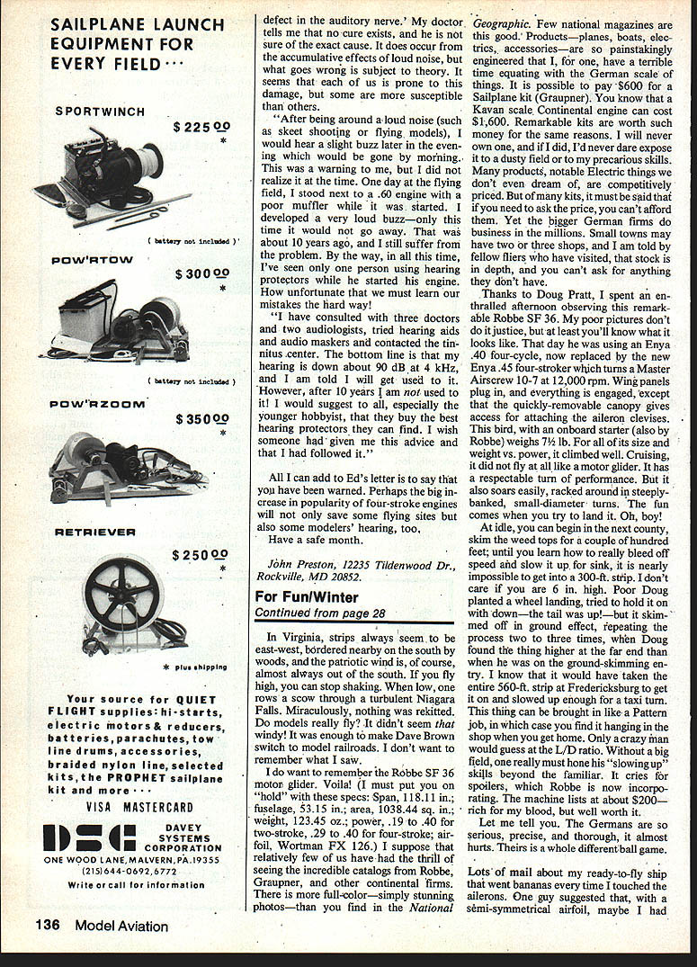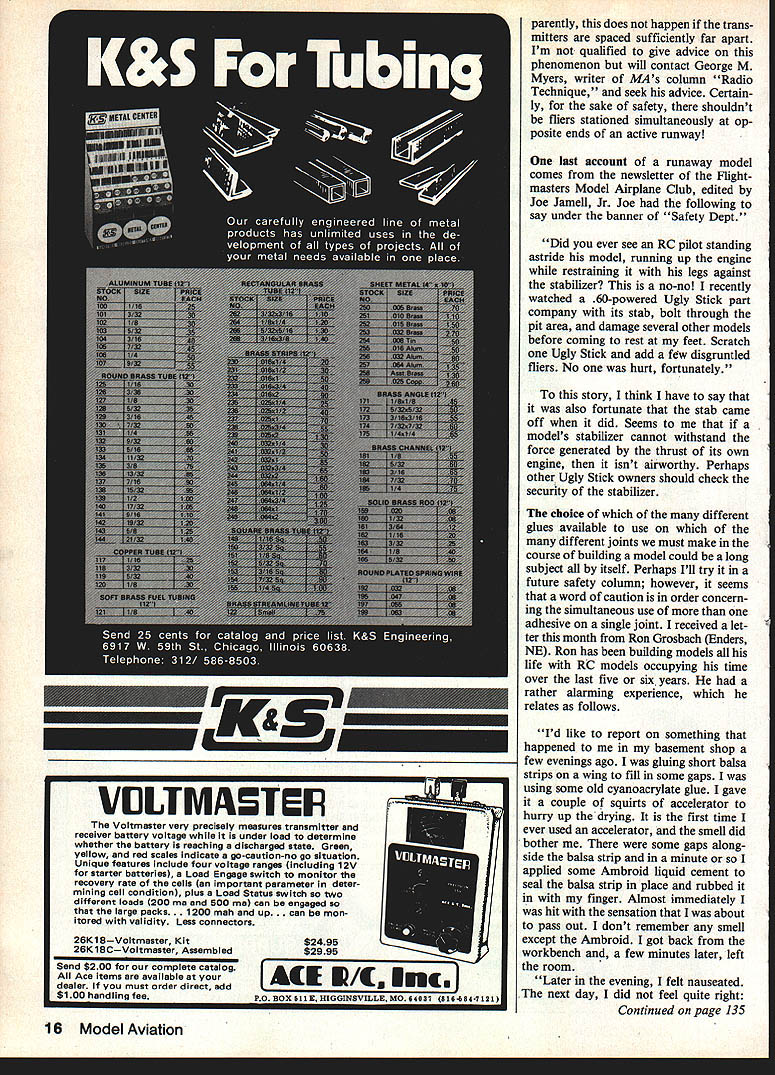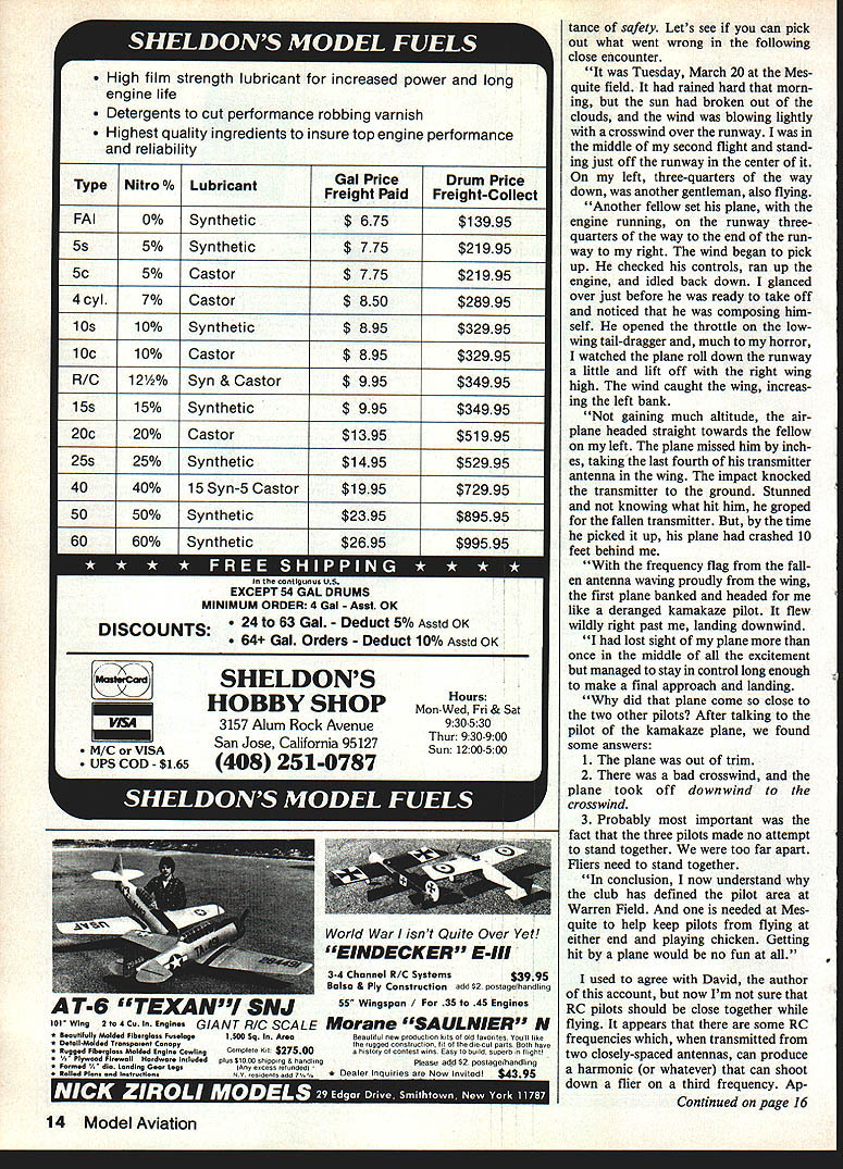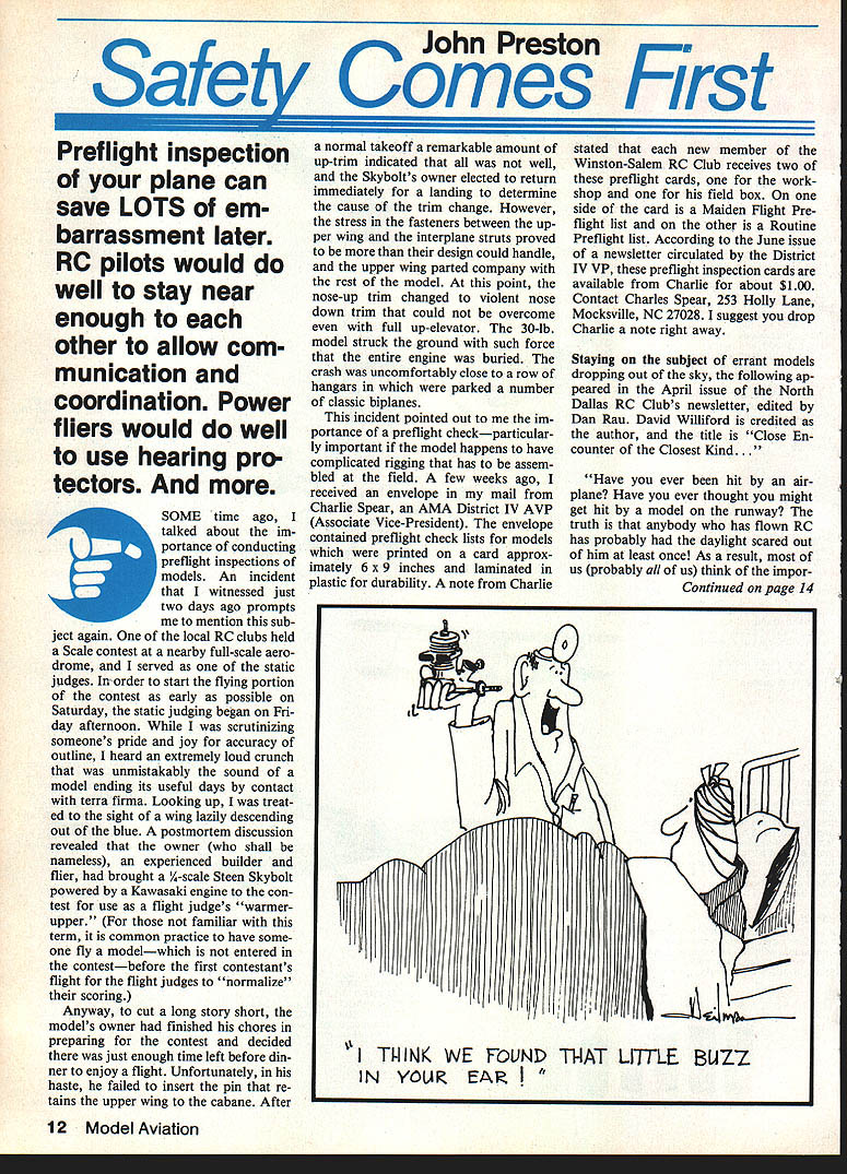 ohn Preston First Safety Cdmes Preflight inspection plane can save LOTS em barrassment later RC pilots would well stay near enough other allow com munication coordination Power fliers would well use hearing pro tectors SOME time ago talked about im portance conducting preflight inspections models An incident witnessed just two days ago prompts mention sub ject again local RC clubs held Scale contest nearby full-scale aero drome served static judges Inorder start flying portion contest early possible Saturday static judging began Fri day afternoon scrutinizing someones pride joy accuracy outline heard extremely loud crunch unmistakably sound model ending its useful days contact terra firma Looking up treat ed sight wing lazily descending out blue postmortem discussion revealed owner shall nameless experienced builder flier brought 1A-scale Steen Skybolt powered Kawasaki engine con test use flight judge s warmer upper familiar term common practice have some fly modelwhich entered contestbefore first contestants flight flight judges normalize scoring Anyway cut long story short models owner finished chores preparing contest decided just enough time left before din ner enjoy flight Unfortunately haste failed insert pin re tains upper wing cabane After normal takeoff remarkable amount up-trim indicated well Skybolts owner elected return immediately landing determine cause trim change However stress fasteners between up per wing interplane struts proved design could handle upper wing parted company rest model point nose-up trim changed violent nose down trim could overcome full up-elevator 30-lb model struck ground such force entire engine buried crash uncomfortably close row hangars parked number classic biplanes incident pointed out im portance preflight checkparticular ly important model happens have complicated rigging has assem bled field few weeks ago received envelope mail Charlie Spear AMA District IV AVP Associate Vice-President envelope contained preflight check lists models printed card approx imately 6 x 9 inches laminated plastic durability note Charlie 0 / stated new member Winston-Salem RC Club receives two preflight cards work shop field box side card Maiden Flight Pre flight list other Routine Preflight list According June issue newsletter circulated District IV VP preflight inspection cards available Charlie about $100 Contact Charles Spear 253 Holly Lane Mocksville NC 27028 suggest drop Charlie note right away Staying subject errant models dropping out sky following ap peared April issue North Dallas RC Clubs newsletter edited Dan Rau David Williford credited author title Close En counter Closest Kind. Have ever hit air plane Have ever thought might get hit model runway truth anybody has flown RC has probably daylight scared out him least once As result us probably us think impor Continued page 14 / TI-lINK WE FOUND ThAT LITTlE BUZ7 IN YOLA EA odel Aviation High film strength lubricant increased power long engine life Detergents cut performance robbing varnish Highest quality ingredients insure top engine performance reliability Gal PriceDrum Price Type Nitro % LubricantFreight PaidFreight-Collect FAI00/0Synthetic$ 675$13995 5550/0Synthetic$ 775$21995 Sc5%Castor$ 775$21995 4 cyl7%Castor$ 850$28995 lOs10%Synthetic$ 895$32995 lOc10%Castor$ 895$32995 RIG120/oSyn & Castor$ 995$34995 iSs15%Synthetic$ 995$34995 20c20%Castor$1395$51995 25s25%Synthetic$1495$52995 4040%iSSyn-SCastor$1995$72995 5050%Synthetic$2395$89595 6060%Synthetic$2695$99595 contIguous US EXCEPT 54 GAL DRUMS MINIMUM ORDER 4 Gal Asst OK DISCOUNTS 24 63 Gal Deduct 5% Asstd OK 64 Gal Orders Deduct 100/0 Asstd OK SHELDONS Hours HOBBY SHOP Mon Wed Fri & Sat 3157 Alum Rock Avenue 530 San Jose California 95127 Thur 9 30-900 M/C VISASun 1200-500 UPS COD $165408 2514787 tance safety Lets see can pick out what went wrong following close encounter Tuesday March 20 Mes quite field rained hard morn ing sun broken out clouds wind blowing lightly crosswind over runway middle second flight stand ing just off runway center left three-quarters way down another gentleman also flying Another fellow set plane engine running runway threequarters way end run way right wind began pick up checked controls ran up engine idled back down glanced over just before ready take off noticed composing him self opened throttle lowwing tail-dragger much horror watched plane roll down runway little lift off right wing high wind caught wing increas ing left bank gaining much altitude air plane headed straight towards fellow left plane missed him inch es taking last fourth transmitter antenna wing impact knocked transmitter ground Stunned knowing what hit him groped fallen transmitter time picked up plane crashed 10 feet behind frequency flag fall en antenna waving proudly wing first plane banked headed like deranged kamakaze pilot flew wildly right past landing downwind lost sight plane once middle excitement managed stay control long enough make final approach landing did plane come close two other pilots After talking pilot kamakaze plane found some answers 1 plane out trim 2 bad crosswind plane took off downwind crosswind 3 Probably important fact three pilots made no attempt stand together too far apart Fliers need stand together conclusion now understand club has defined pilot area Warren Field needed Mes quite help keep pilots flying either end playing chicken Getting hit plane would no fun used agree David author account now Im sure RC pilots should close together flying appears some RC frequencies transmitted two closely-spaced antennas can produce harmonic whatever can shoot down flier third frequency Ap Continued page 16 14 Model Aviation World War isnt Quite Over Yet EINDECKER E-III 34 Channel R/C Systems$3995 Balsa Construction add $2 postage/handirna T6 15TEXb4N11I SNJ 55 Wingspan / 35 45 Engines 101 WIng 2 $04 Cu Enginna GIANT R/C SCALE Moran SAULNIER N * Banotfotty Moldad Fibasgia Fosoingo1S00 Sq AmaBeaat yeas prodoct ts 01 0 d fasot tao