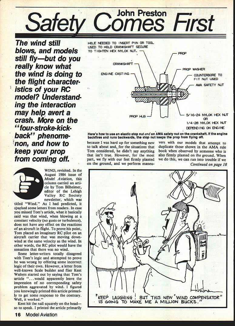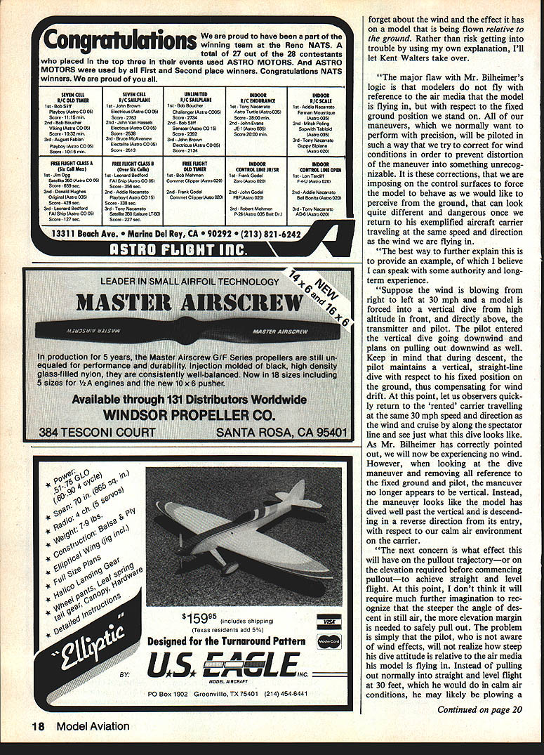 Cdmes Safety ohn Preon First wind still blows models still flybut really know what wind doing flight character istics RC model Understand ing interaction may help avert crash M9re four-stroke-kick back phenome non keep prop coming off WIND revisited August 1984 issue Model Aviation column carried arti cle Tom Bilheimer editor Lehigh Valley RC Society newsletter titled Wind As predicted sParked some letters readers case missed Toms article what basically said wind blowing constant velocity no gusts turbulence does have effect reactions aircraft flight prove point Tom placed imaginary RC pilot aircraft carrier moving down wind same velocity wind other words RC pilot would have sensation no wind Some letter-writers totally disagreed Toms logic attempted prove wrong offering some incorrect logic own However letter well-known Scale builder flier Kent Walters started out saying Toms article uld apparently leave impression no corresponding safety problem aggravated wihd figured knowingly printed article primari ly get some response contrary Well worked Kent hit nail squarely head speak printed article primarily HE DED TO IERT PIN CR TOCL USED TO HD CRAMS-IAFT SEO5E TO TI G-4TEN 1-EX rJYLOK NJr cRANSHAFT ENIE CASTIN3 PR~ because hard up something new talk about and, situations Tom considered didnt say anything isnt true However part fly feet firmly planted ground perform maneu vers models attempt duplicate shown AMA rule book observed someone also firmly planted ground we can run trouble Continued page 18 PRCR z K PRGP WASI-ER cCLIJTEF6C TO FIT 4JT USED AMA SAFETY UT ~7i/1624 rNtOK 1-EX NJT 1/4-28 NYLOK 1-EX rLJT DEPEND N ~J B3 iE 16 Model Aviation Heres use elastic stop nut AMA safety nut crankshaft lithe engine backfires runs backwards stop nut keeps prop flying off QVXP IEEP BUT THIS NEW WIND COMPENSATOR MAKE ME MILLION BUCKS proud have part viuiuiuiniiuiia winning team Reno NATS total 27 out 28 contestants placed top three events used ASTRO MOTORS ASTRO MOTORS used First Second place winners Congratulations NATS winners proud SEVEN CELLSEVEN CELLUNLIMIIIOINDOORINDOOR R/COLDTIMEE/CSAILPUNEEICSAILPEANER/CENDUEM4J1/CECALE lot-SobSijItlee-JohoSrownlOt-SobBoochartot-TonyNacorratolee-AddieNacerreto Flaybny Antro CO 06Elecicon Aetro CO 06Challenger Antro COOSAnno Tortle lAntro 038Farroan Moonlicoe Snore-il 15 winScore 2763Score 2734Score 2800 mm tmo 035 2nd Bob Booth2nd Joho Van Haelo2nd- Bob SuIt2nd-John Evano2nd Mitch Poling Viking Antro CO Oh Electicoa lAatro CO 55 Sononor Aetro CO 15JE-1 lAntro 035 rith Tabloid Score-1O32rnin Scora-2B35 Score-23B2Scoro20S0njn otmoS3h 3rd Angont Fabian 3rd Since MoAvenoc, 3rd John Brown 3rd Tony Nacarrato Flaybny Anon co telito Anon CO Oh Electrico Anon CO SB Goppy Biplane score- tei 00 Scora-2b13 Score-2134 lAntro 020 mi FUONT OASS AElI RIGNI CLASS BFREE MONTINDOORINDOOR SloCiManOnerSIoCelloOLDOIMERCONIROLUNEJRISRCONTROLLINEOPEN lnt-JinrOgglnt-LeonardBodfordlnt-BobMehmnenlnt-Franktlodetlet- Lonardlff SalaBle 380 lAnen CO 06 FAI Ship lAntro CO OhCororont Clipper lAntro 020 Zero Anon 0201 F 4-U lAntmo 0201 Score -680 eec Score- 366 nec 2nd Donald 1-loahee2nd Addie Nacarrato2nd Frank Code2nd John Godel2nd Addle Nacarraro Original Aeon 035 Playboy Anon CO 15 Corontet ClipynrLhaoo03G FSF Anen 020 Bell Bonito A*On 020 Score -426 eecScore 338 nec 3rd Leonard Bedford3rd Tony Nacorrato3rd Robert Mehrrren3rd Tony Nacarrato PAl Ship Anon CO 06 Salelte 380 ILeacra LT-06 F-28 Aeon 036 Salt AD-S Anon 020 Score-t2lnec Score-237nnc L231 1 Beach Ave na Del Roy CA 2 213844j ~LiJULuJftmw W forget about wind effect has model being flown relative ground Rather risk getting trouble using own explanation Ill let Kent Walters take over major flaw Mr Bilheimers logic modelers fly reference air media model flying respect fixed ground position stand maneuvers normally want perform precision will piloted such way try correct wind conditions order prevent distortion maneuver something unrecog nizable corrections imposing control surfaces force model behave would like perceive ground can look quite different dangerous once return exemplified aircraft carrier traveling same speed direction wind flying best way further explain provide example believe can speak some authority longterm experience Suppose wind blowing right left 30 mph model forced vertical dive high altitude front directly above transmitter pilot pilot entered vertical dive going downwind plans pulling out downwind well Keep mind during descent pilot maintains vertical straight-line dive respect fixed position ground thus compensating wind drift point let us observers quick ly return rented carrier travelling same 30 mph speed direction wind cruise along spectator line see just what dive looks like As Mr Bilheimer has correctly pointed out will now experiencing no wind However looking dive maneuver removing reference fixed ground PlOte maneuver no longer appears vertical Instead maneuver looks like model has dived well past vertical descend ing reverse direction its entry respect calm air environment carrier next concern what effect will have pullout trajectoryor elevation required before commencing pulloutto achieve straight level flight point dOIt think will require much further imagination rec ognize steeper angle des cent still air elevation margin needed safely pull out problem simply pilot aware wind effectse will realize steep dive attitude relative air media model flying Instead pulling out normally straight level flight 30 feete would calm air conditions may likely plowing Continued page 20 18 Model Aviation $ 159~ InCludes shipping Tesas ins dec odd 5 Designed Turnaround Pattern iara Iq____ L_____ MODEL AIRCRAFT P0 Box 1902 GreenViIe TX 75401 214 454-6441 Littlest Miracle Workshop APROFEALTOOL Send25C SUITABLE FOR ALL forcatagog HOBBIES AND CRAFTS Makers of. Mini-Glue Tips Stray- Tray Tee Bar Mini-Saw juff-Stuff & Jewel Stripes Super Joy Stick Sport Pattern Fun Fly Model 6 tradition ugly sticklooks better flies better
