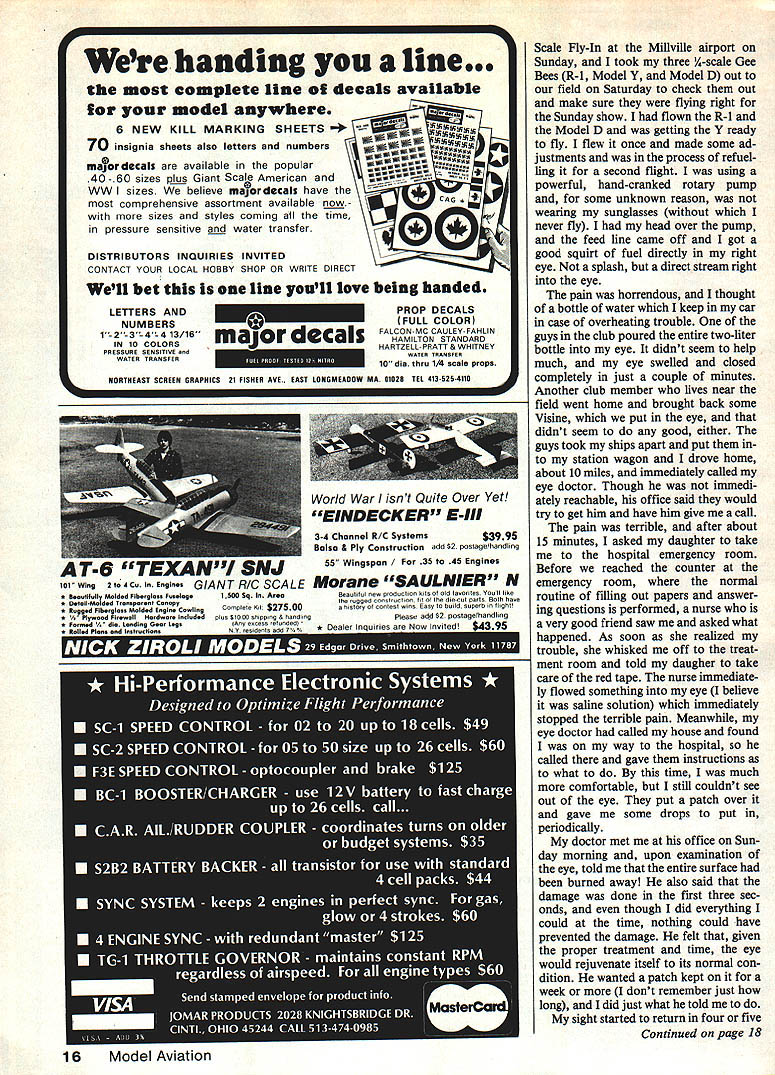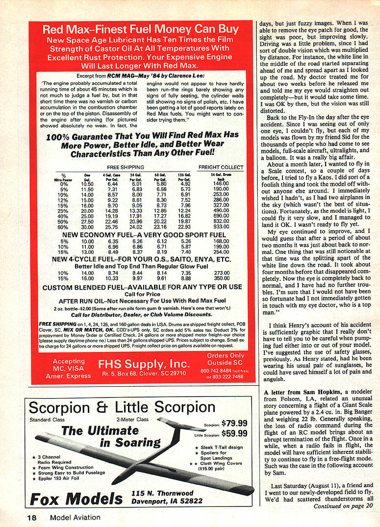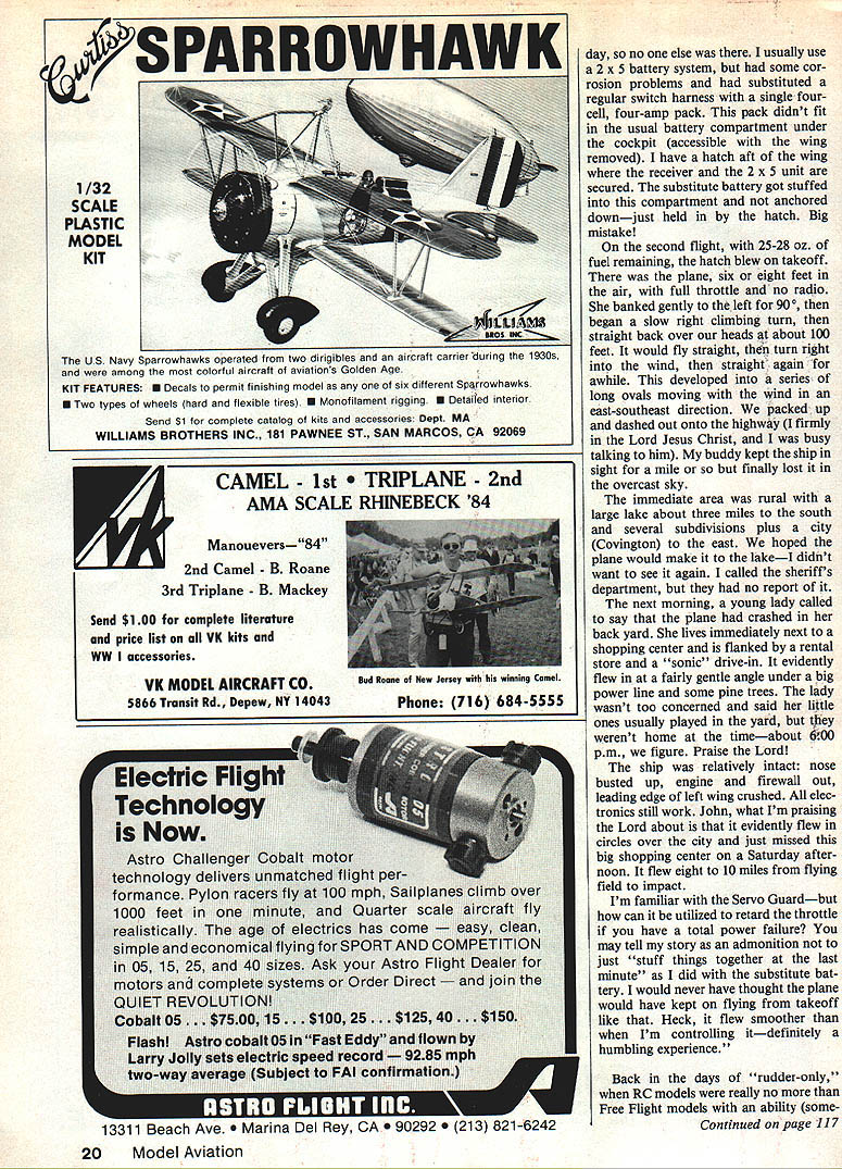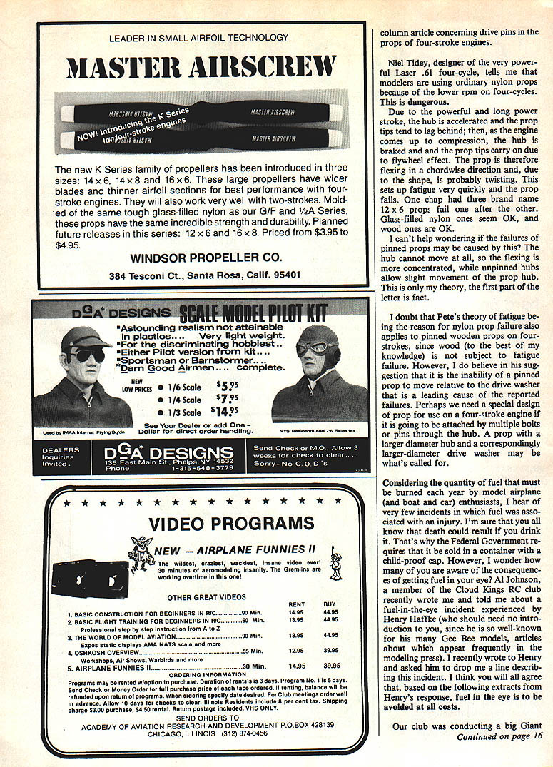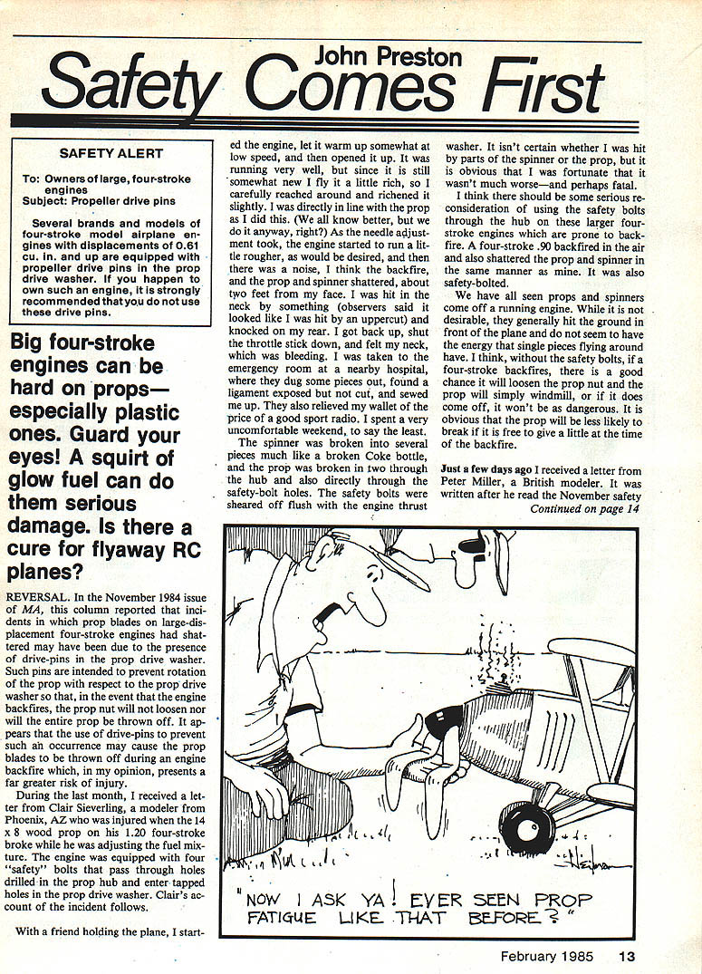 John Preston Safety Comes First Big four-stroke engines can hard props especially plastic ones Guard eyes squirt glow fuel can serious damage cure flyaway RC planes REVERSAL November 1984 issue MA column reported inci dents prop blades large-dis placement four-stroke engines shat tered may have due presence drive-pins prop drive washer Such pins intended prevent rotation prop respect prop drive washer event engine backfires prop nut will loosen nor will entire prop thrown off ap pears use drive-pins prevent such occurrence may cause prop blades thrown off during engine backfire opinion presents far greater risk injury During last month received let ter Clair Sieverling modeler Phoenix AZ injured 14 x 8 wood prop 120 four-stroke broke adjusting fuel mix ture engine equipped four safety bolts pass through holes drilled prop hub enter tapped holes prop drive washer Clairs ac count incident follows friend holding plane started engine let warm up somewhat low speed opened up running very well since still somewhat new fly little rich carefully reached around richened slightly directly line prop did know better anyway right As needle adjust ment took engine started run lit tle rougher would desired noise think backfire prop spinner shattered about tWo feet face hit neck something observers said looked like hit uppercut knocked rear got back up shut throttle stick down felt neck bleeding taken emergency room nearby hospital dug some pieces out found ligament exposed cut sewed up also relieved wallet price good sport radio spent very uncomfortable weekend say least spinner broken several pieces much like broken Coke bottle prop broken two through hub also directly through safety-bolt holes safety bolts sheared off flush engine thrust washer isnt certain whether hit parts spinner prop obvious fortunate wasnt much worseand perhaps fatal think should some serious re consideration using safety bolts through hub larger fourstroke engines prone back fire four-stroke 90 backfired air also shattered prop spinner same manner also safety-bolted have seen props spinners come off running engine desirable generally hit ground front plane seem have energy single pieces flying around have think safety bolts four-stroke backfires good chance will loosen prop nut prop will simply windmill does come off wont dangerous obvious prop will less likely break free give little time backfire Just few days ago received letter Peter Miller British modeler written after read November safety Continued page 14 II 7___ NOW ASK YA EVER FATIGUE LIKE. ThAT SEEN PROP 3EFQRE February 198513 SAFETY ALERT To Owners large tour-stroke engines Subject Propeller drive pins Several brands models four-stroke model airplane en gines displacements 081 Cu up equipped propeller drive pins prop drive washer happen own such engine strongly recommended use drive pins Astounding realism auainaie plastics.. Very light weight discriminating hobblest. Either Pilot version kit.. Sportsman Barnstormer.. Darn Good Airmen .. complete NEW LOW PRICES 01/6 Scale $595 1/4 Scale $795 1/3 Scale 142 S Dealer add Dollar direct order handling VIDEO PROGRAMS NEWAIRPLANEFUNNIESII wildest Creiiest wackiest insane video ever 30 minutes aeromodellng insanity Gremlins working overtime RENTBUY 14954495 13954495 13954495 12953995 14953995 OTHER GREAT VIDEOS 1 BASIC CONSTRUCTION FOR 8EGINNERS IN RIC90 Mm 2 BASIC FLIGHT TRAINING FOR BEGINNERS IN AIC50 Mm Professional step step Instruction Z 3 THE WORLD OF MODEL AVIATION90 Mm Expos static displays AMA NATS scale 4 OSHKOSH OVERVIEW55 Mm Workshops Air Shows Warbirds 5 AIRPLANE FUNNIES II30 Mm ORDERING INFORMATION Programs may rented wloption purchase Duration rentals 3 days Program No lieS days Send Check Money Order full purchsse price tape ordered renting balance will relunded upon return 01 programs ordering specify date desired Club meetings order well advance Allow 10 days checks clear Illinois Residents include 8 per cent tax Shipping charge $300 purchase $450 rental Return postage included VHS ONLY SEND ORDERS TO ACADEMY OF AVIATION RESEARCH AND DEVELOPMENT POBOX 428139 CHICAGO ILLINOIS 312 8740456 column article Concerning drive pins props four-stroke engines Niel Tidey designer very power ful Laser 61 four-cycle tells modelers using ordinary nylon props because lower rpm four-cycles dangerous Due powerful long power stroke hub accelerated prop tips tend lag behind engine comes up compression hub braked and prop tips carry due flywheel effect prop therefore flexing chordwise direction due shape probably twisting sets up fatigue very quickly prop fails chap three brand name 12 x 6 props fail after other Glass-filled nylon ones seem OK wood ones OK cant help wondering failures pinned props may caused hub cannot move flexing concentrated unpinned hubs allow slight movement prop hub theory first part letter fact doubt Petes theory fatigue ing reason nylon prop failure also applies pinned wooden props fourstrokes since wood best knowledge subject fatigue failure However believe sug gestion inability pinned prop move relative drive washer leading cause reported failures Perhaps need special design prop use four-stroke engine going attached multiple bolts pins through hub prop larger diameter hub correspondingly larger-diameter drive washer may whats called Considering quantity fuel must burned year model airplane boat car enthusiasts hear very few incidents fuel asso ciated injury Im sure know death could result drink Thats Federal Government re quires sold container child-proof cap However wonder aware consequenc es getting fuel eye Al Johnson member Cloud Kings RC club recently wrote told about fuel-in-the-eye incident experienced Henry Haffke should need no intro duction since well-known Gee Bee models articles about appear frequently modeling press recently wrote Henry asked him drop line describ ing incident think will agree based following extracts Henrys response fuel eye avoided costs club conducting big Giant Contin