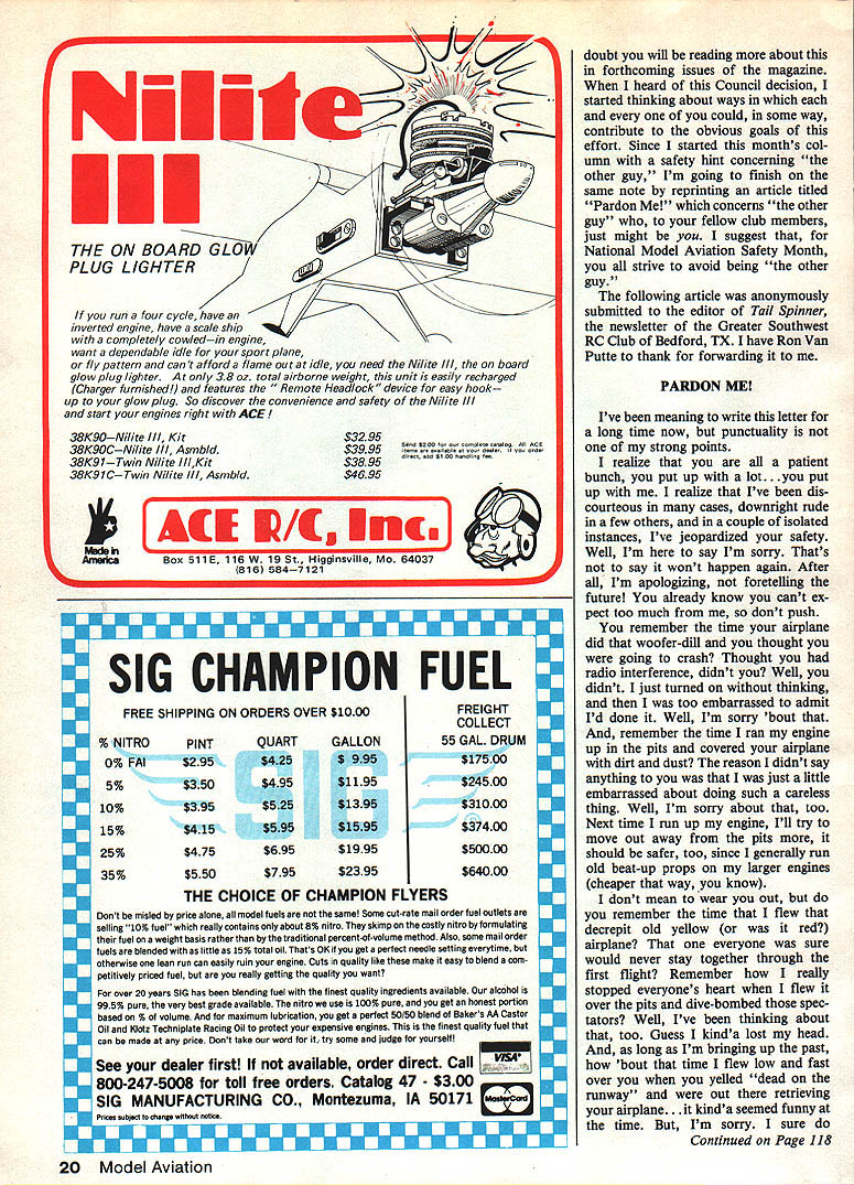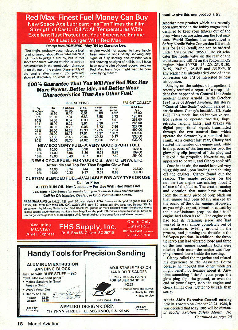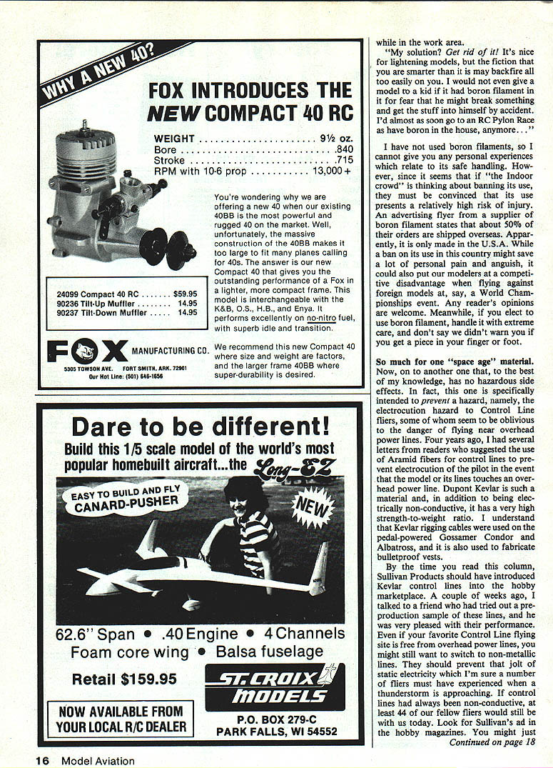 John Preston Safety Comes First Beware boron filaments Sullivan Products intro duces non-metallic control lines An unexpected prob lem twinengine models THE FIRST TOPIC month may value modelers interested building strongest lightest model block subject boron fila ments wise use space age material understand has tensile strength about 550000 psi densi ty similar aluminum letter noted Free Flight Scale modeler Bill Warner may cause think twice before place order Bill following say latest issue Model Aviation November 1984 Bud Tenny mentions Indoor crowd thinking ban ning boron filament Other columnists have cautioned modelers exercise cau tion its use Well would like add two cents suggest model er has sense will get rid has burying back yard someone doesnt like am sorry ever heard stuff have limping since last July thanks new marvel material Despite exercising what thought ex treme caution few tiny invisible bits size human hair segments long pencil lead wide got carpet between building area bed un-air-conditioned Southern Califor nia apartment summer goes barefoot lot soon found Out much fun boron could couple bits disappeared foot know Doctors tell cant locate stuff either does work its way surface painful extraction session involving magnifying glass needle S-v \/ / 2442 uAN mis && H$ THIS MONTHS OTHER tweezers wielded loving wife results bit always retracts itself try get out breaks off few times process Re-carpeting would help expensive suspect vacuum ing world Ive done plenty would get out carpet cant see can feel up inside foot though have heard employee Sikorsky policy upon getting employee cut out immediately Thats fine know Some modelers pooh-pooh dangers boron filament old X-Acto knives dangerous CyA want ban everything Well hav ing just heard third friend got CyA eye well known columnist Model Builder wonder about latter three involved expensive painful trips emergency room X-Acto knives can see can control THE INNE OF citJY AWARE some expertise can keep away feet fingers eyes feel average modeler like myself letting himself unneces sary grief boron filament due relative invisibility material coupled its ability puncture maintain itself anonymously body will resisting attempts remove breaking off receding inwards touched can cause discomfort pain ex tended period time addition stays environment carpet almost definitely cant get out vacuum magnet its non-mag netic Toxic fumes dissipate X-Actos can stored CyA kicks off has done damned boron filament just sticks around waits next time pass barefoot can stick sole shoe get later just case thinking will just solve problem protecting feet Continued page 16 14 Model Aviation think accidents happen other guy just remember flying buddies YOU other guy Reprinted Car8air newsletter Joint Military Fliers RC Club Marlin Kinning editor FOX INTRODUCES THE NEW COMPACT 40 RC WEIGHT9 oz Bore840 Stroke715 RPM with10-6 prop13000 Youre wondering offering new 40 existing 4088 powerful rugged 40 market Well unfortunately massive construction 4OBB makes too large fit planes calling 40s answer new Compact 40 gives outstanding performance Fox lighter compact frame model interchangeable K&B OS HB Enya performs excellently no-nitro fuel superb idle transition recommend new Compact 40 size weight factors larger frame 4088 super-durability desired work area solution Get rid Its nice lightening models fiction smarter may backfire too easily would give model kid boron filament fear might break something get stuff himself accident Id almost soon go RC Pylon Race have boron house anymore. have used boron filaments cannot give personal experiences relate its safe handling ever since seems Indoor crowd thinking about banning its use must convinced its use presents relatively high risk injury An advertising flyer supplier boron filament states about 50% orders shipped overseas Appar ently made USA ban its use country might save lot personal pain anguish could also put modelers competi tive disadvantage flying against foreign models say World Cham pionships event Any readers opinions welcome Meanwhile elect use boron filament handle extreme care dont say didnt warn you get piece finger foot So much space age material Now another best knowledge has no hazardous side effects fact specifically intended prevent hazard namely electrocution hazard Control Line fliers some seem oblivious danger flying near overhead power lines Four years ago several letters readers suggested use Aramid fibers control lines pre vent electrocution pilot event model its lines touches over head power line Dupont Kevlar such material addition being elec trically non-conductive has very high strength-to-weight ratio understand Kevlar rigging cables used pedal-powered Gossamer Condor Albatross also used fabricate bulletproof vests time read column Sullivan Products should have introduced Kevlar control lines hobby marketplace couple weeks ago talked friend tried out pre production sample lines very pleased performance favorite Control Line flying site free overhead power lines might still want switch non-metallic lines should prevent jolt static electricity Im sure number fliers must have experienced thunderstorm approaching control lines always non-conductive least 44 fellow fliers would still us today Look Sullivans ad hobby magazines might just Continued page 18 16 Model Aviation 24099 Compact 40 RC $5995 90236 Tilt-Up Muffler 1495 90237 Tilt-Down Muffler 1495 F 0 X MANUFACTURING CO 5305 TOWBON AVEFORT SMITH ARK 72901 Hot Lifts 501 146-1656 Build 1/5 scale model worlds popular homebuilt Nod N Dare different Retail $15995 NOW AVAILABLE FROM YOUR LOCAL R/C DEALER 626Span gIne neis Foam core wing a fuselage PO BOX 279-C PARK FALLS WI 54552 ALUMINUM EXTRUSION SANDING BLOCK use RUFF-STUFF 924 Self adhesive sand paper Makes Sanding Small Areas Snap Wont Wear Out Handy Use 11 inch $250 22 inch$365 ADJUSTABLE TENSION HAND BELT SANDER 4IRMLY HOLDS PAPER FOR EASIER SANDING $225 Padded flats curves Hand